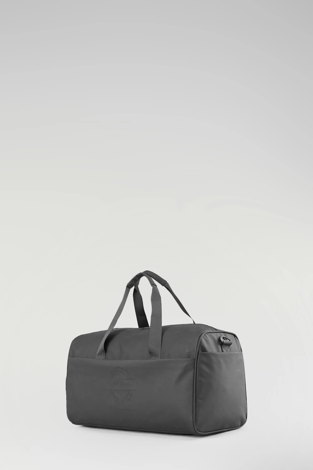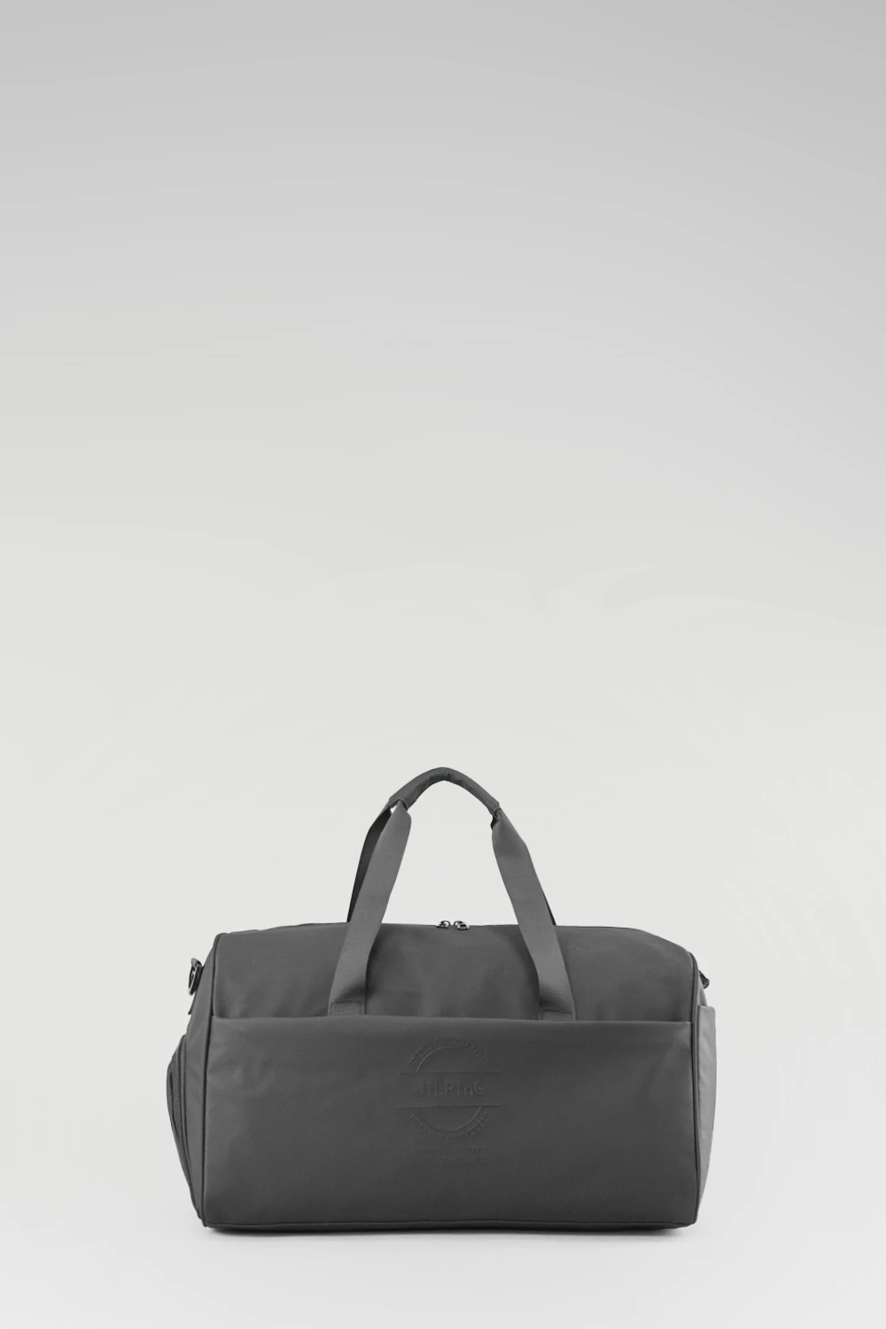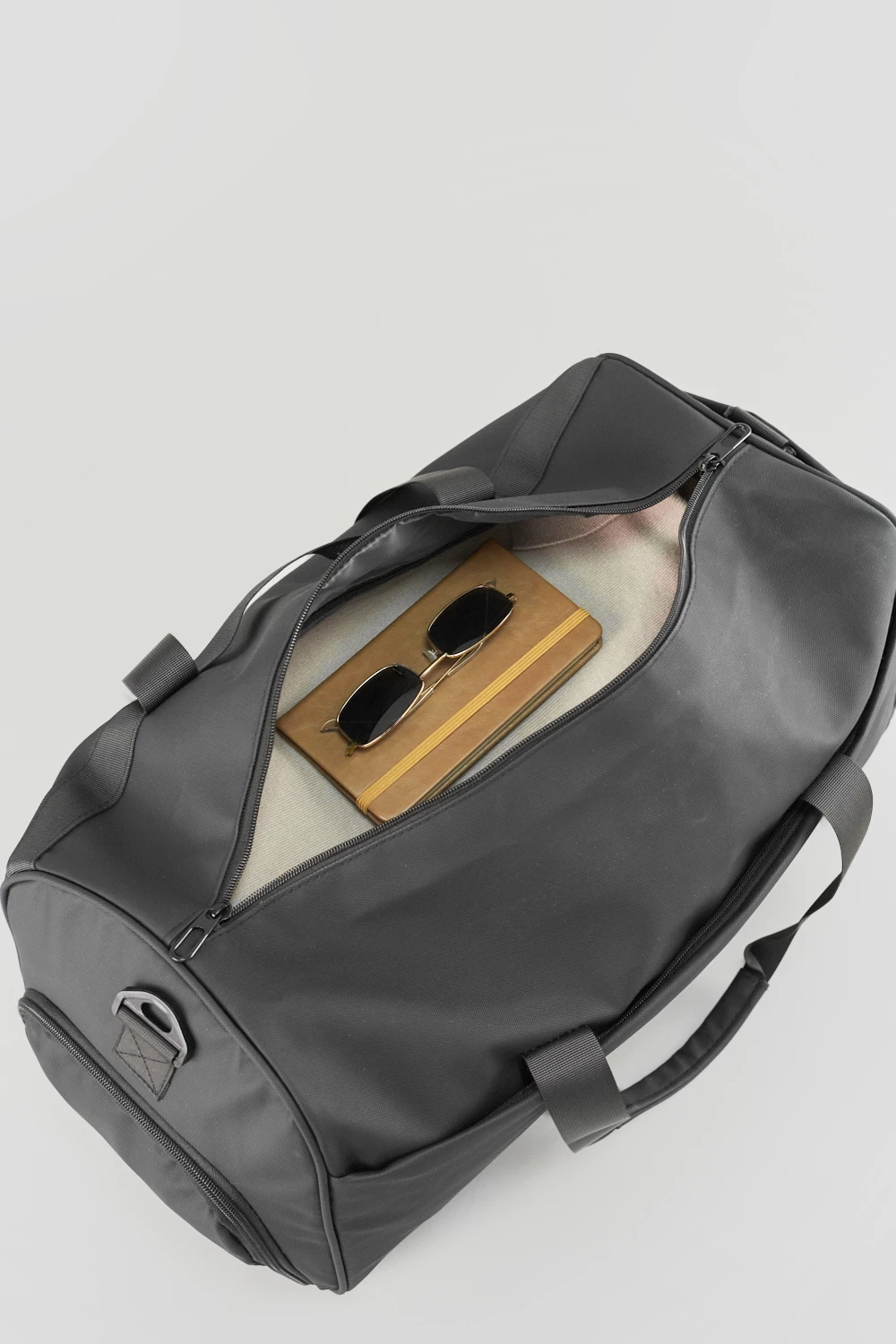 Дорожная сумка чёрного цвета вместительна и функциональна. Одно отделение дополнено внутренним карманом на молнии. Снаружи расположены два кармана: закрытый на молнию и открытый. Есть отдельный отсек для обуви сбоку. Сумка оснащена регулируемым текстильным ремнём.Размер