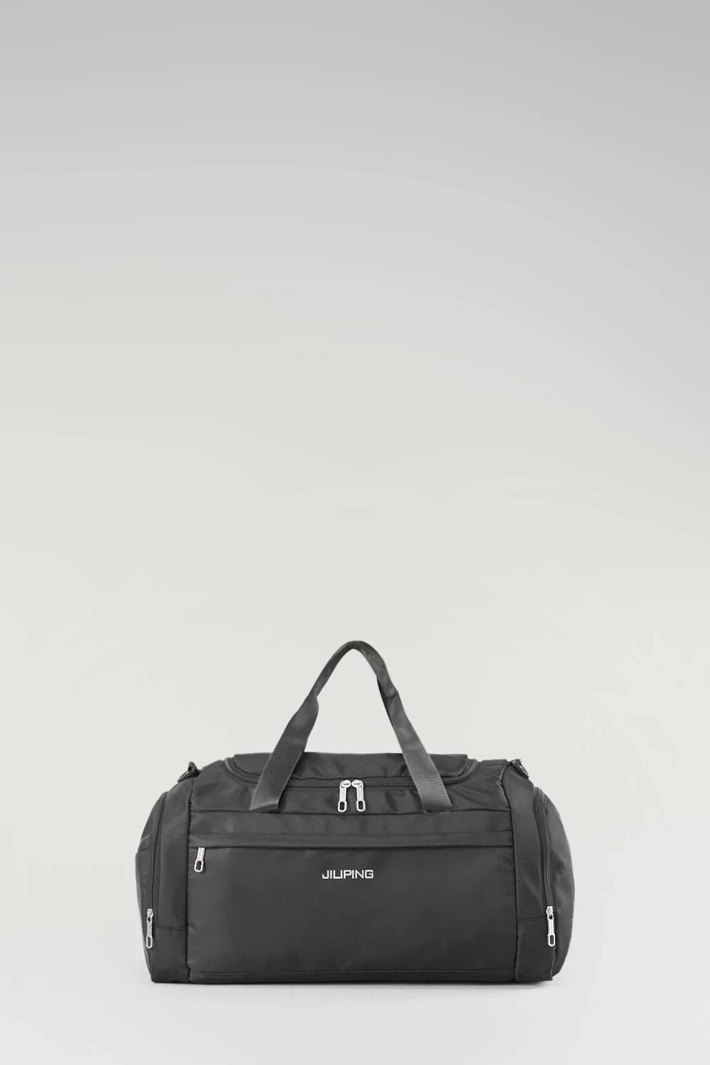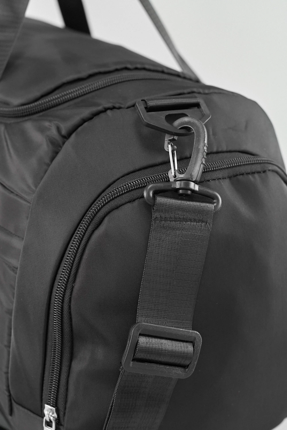 Черная дорожная сумка с одним отделением и внутренним карманом на молнии. Снаружи расположены два функциональных застегивающихся кармана. Отдельное пространство предусмотрено для обуви. В комплекте идет текстильный ремень. Отличный выбор для поездок и путешествий.Размер