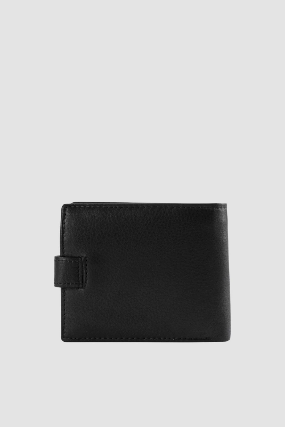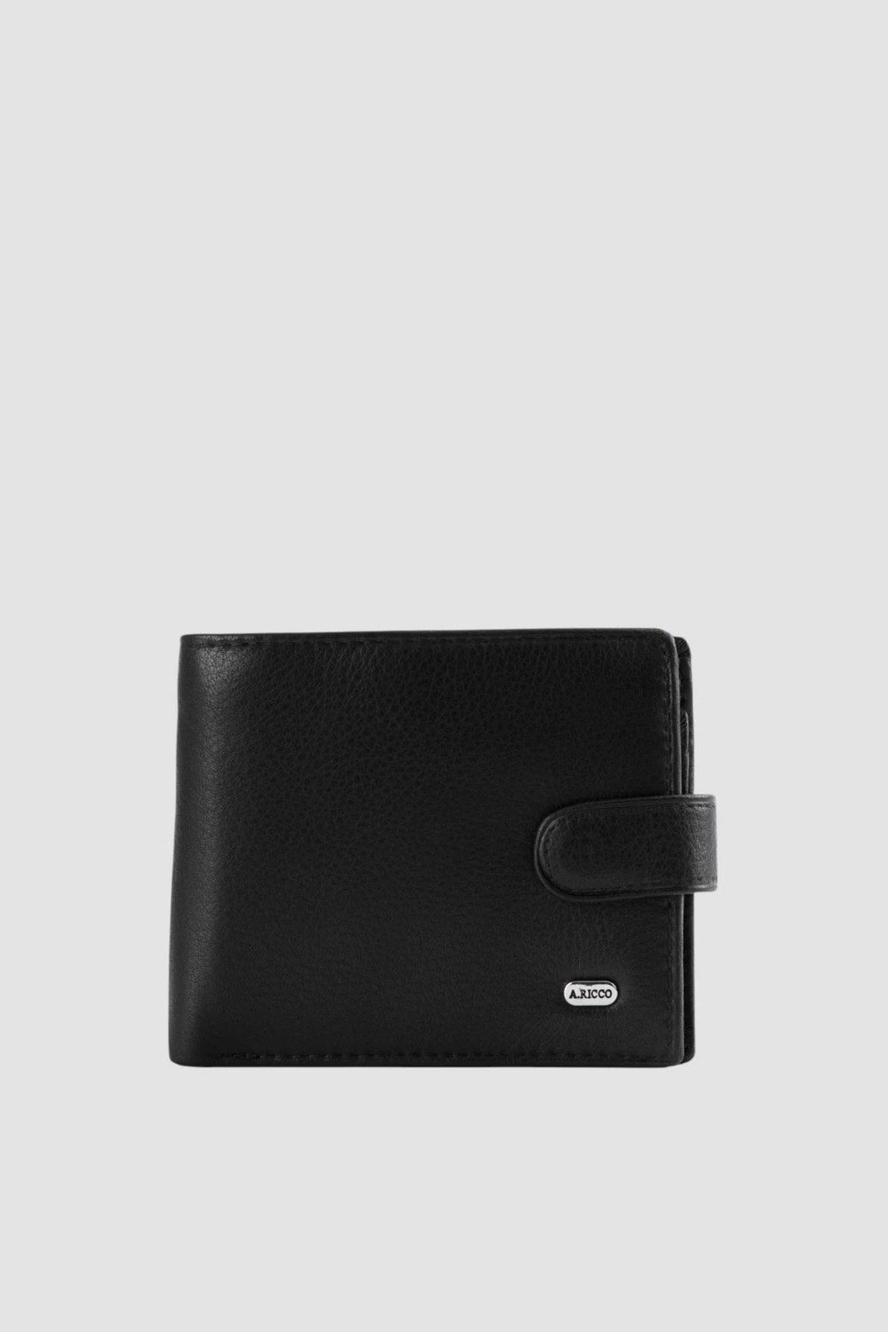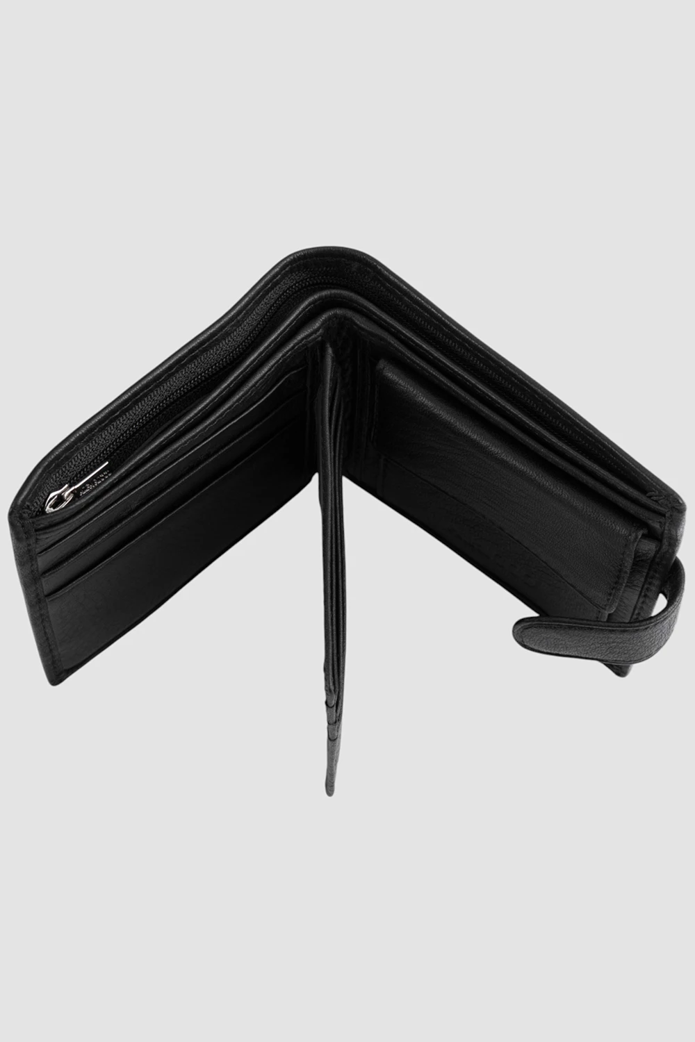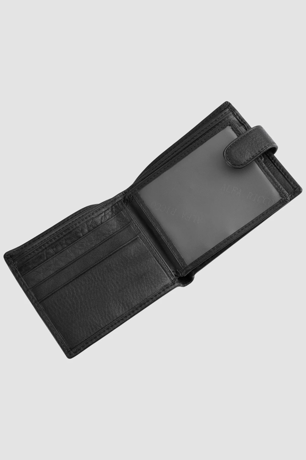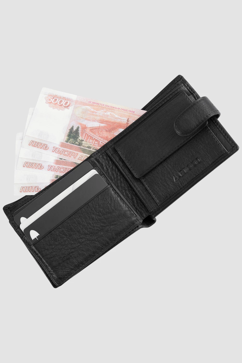 Мужской бифолд черного цвета на кнопке: два купюрника, кармашки для карт, магнитная монетница, потайной застегивающийся карман.