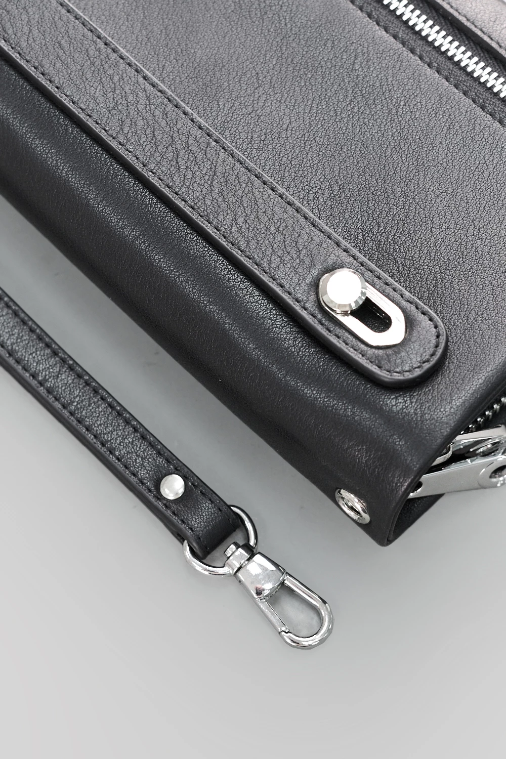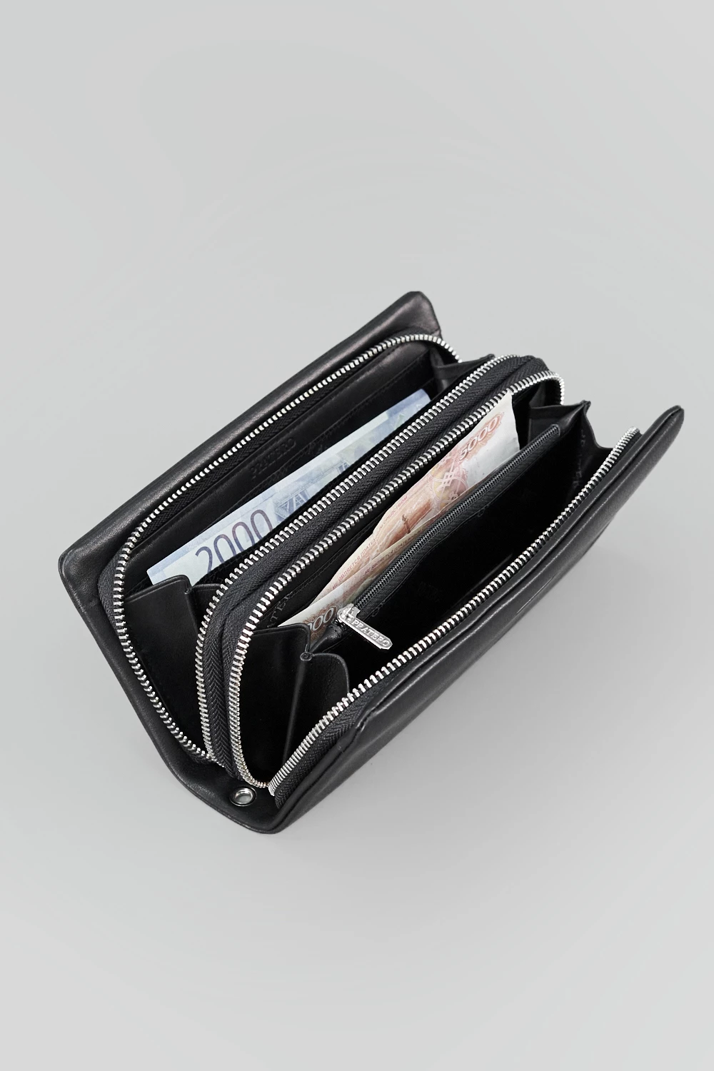 Мужской клатч черного цвета из натуральной кожи с двумя отделами на молнии. Один отдел оснащен специальным отделением для карт, также имеется дополнительный наружный карман на молнии. Комплектуется ремешком-хлястиком для надежной фиксации на руке.