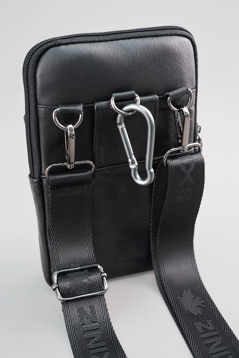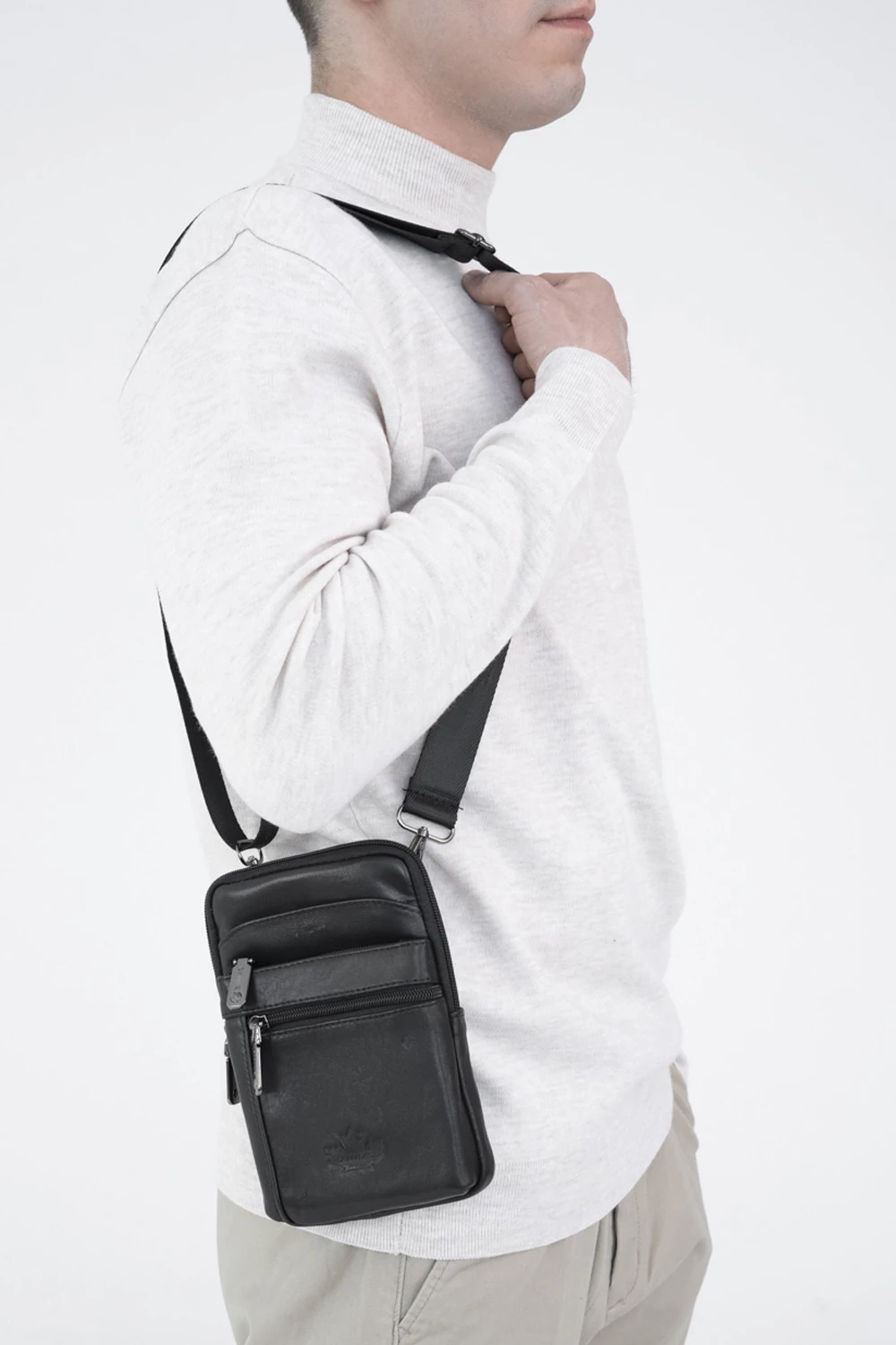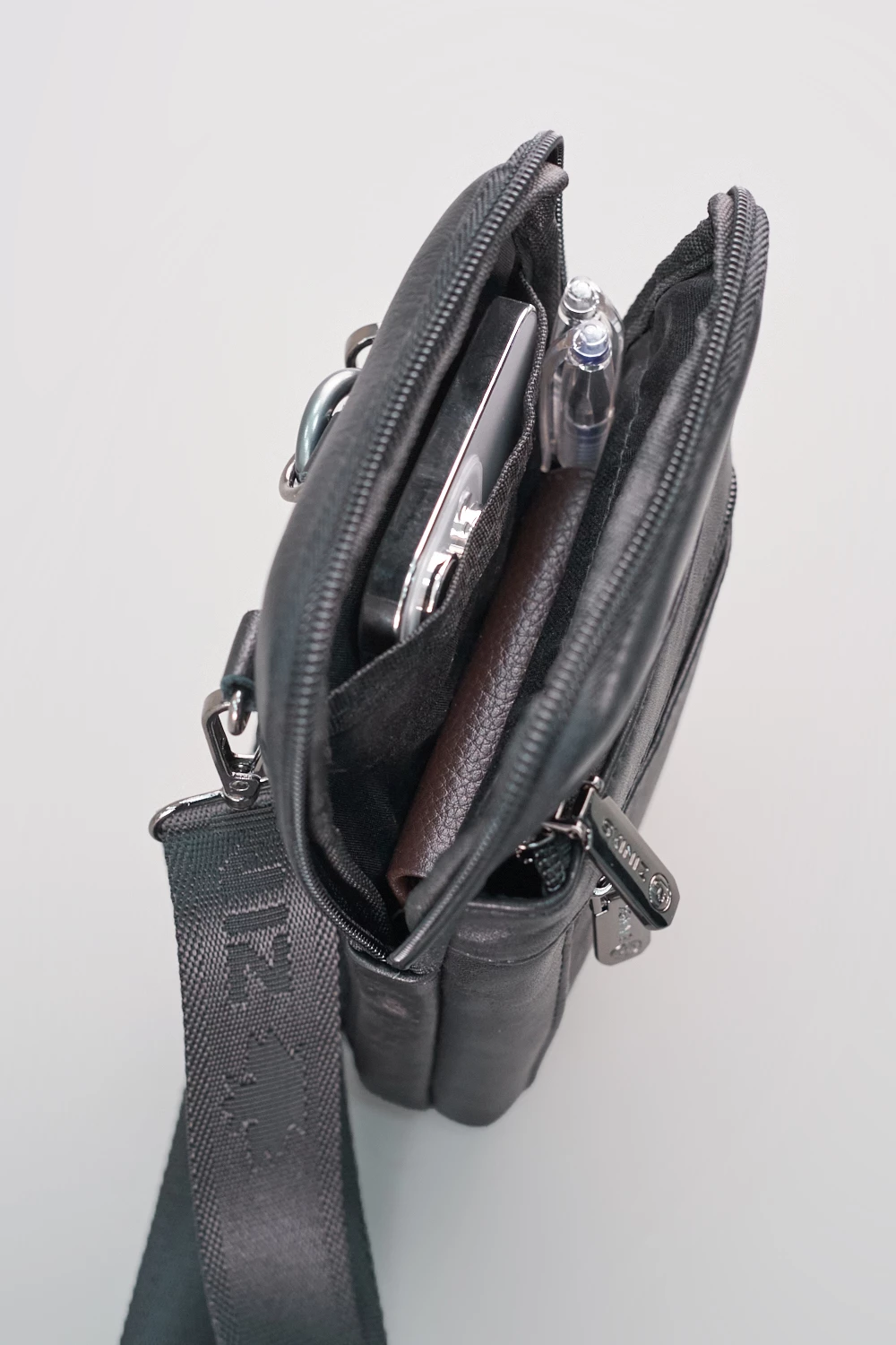 Мужская сумка через плечо из натуральной кожи чёрного цвета. Отделение на молнии с внутренним открытым карманом. Снаружи два кармана на молнии. Дополнительно укомплектована надёжным металлическим карабином.● внешние карманы на замке для мелочей