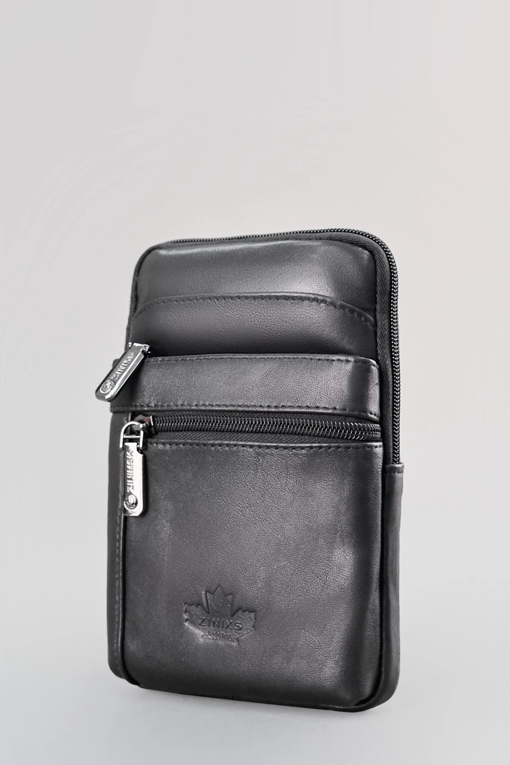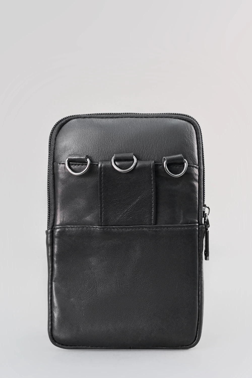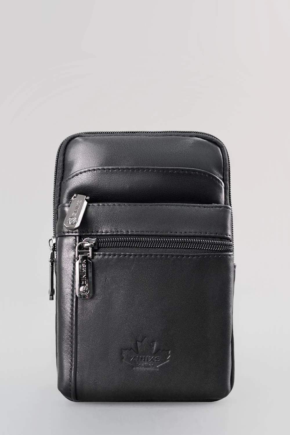 Мужская сумка через плечо из натуральной кожи чёрного цвета. Отделение на молнии с внутренним открытым карманом. Снаружи два кармана на молнии. Дополнительно укомплектована надёжным металлическим карабином.● внешние карманы на замке для мелочей
