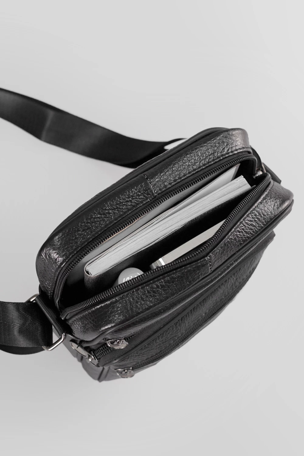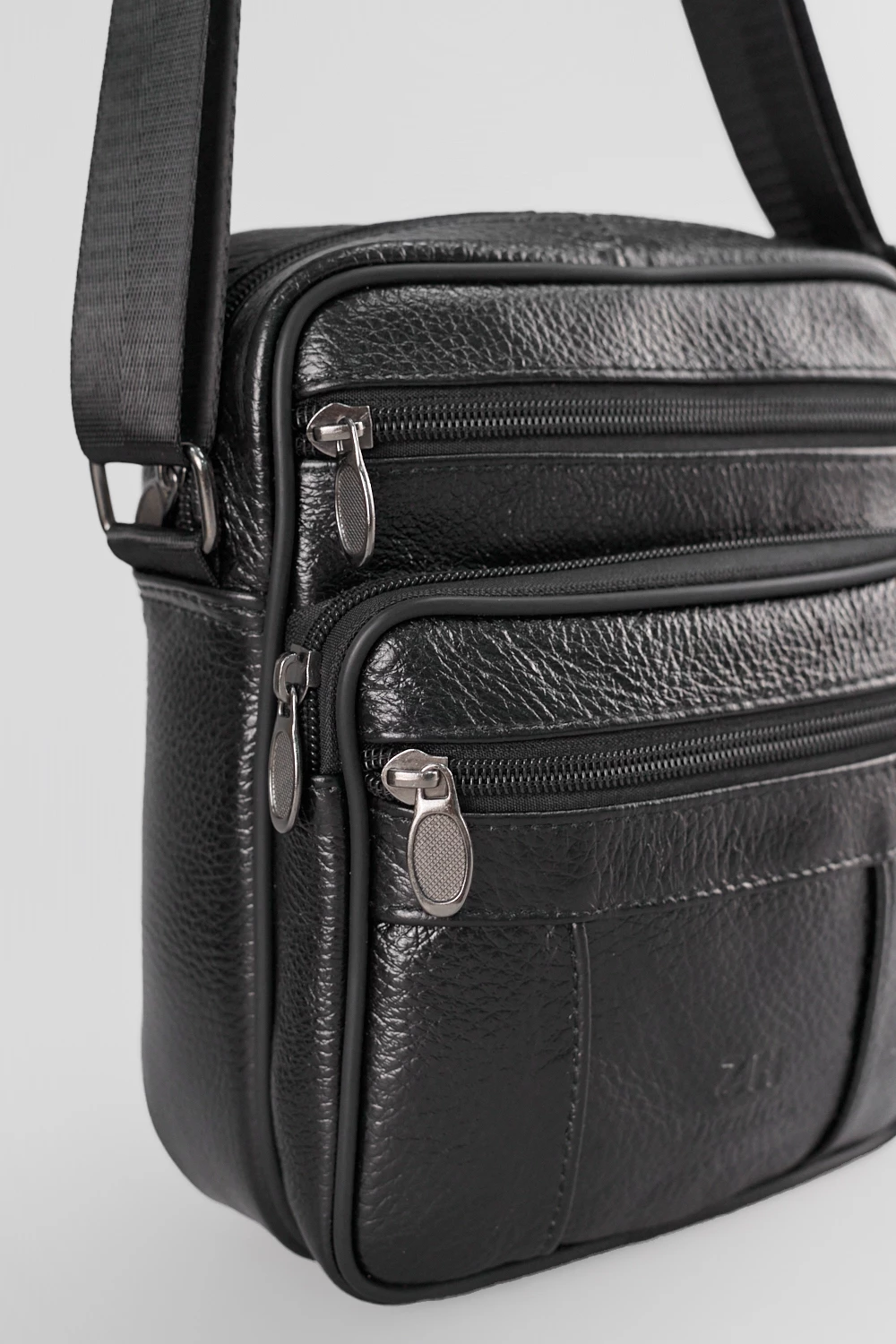 Мужская сумка через плечо из натуральной кожи чёрного цвета. Имеет два вместительных отделения на молниях и три внешних кармана.Практичная модель для ежедневного использования.● внешние карманы на замке для мелочей