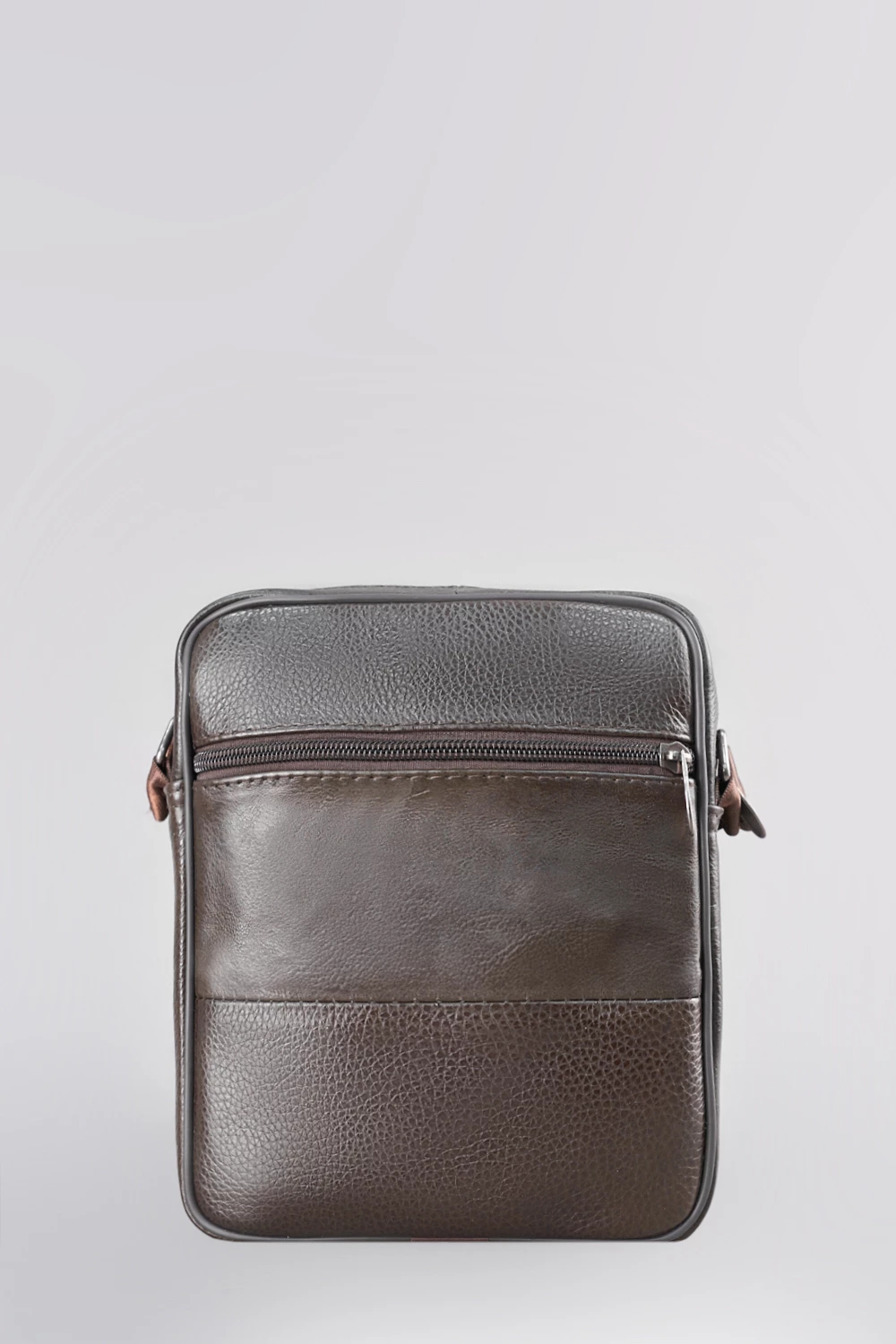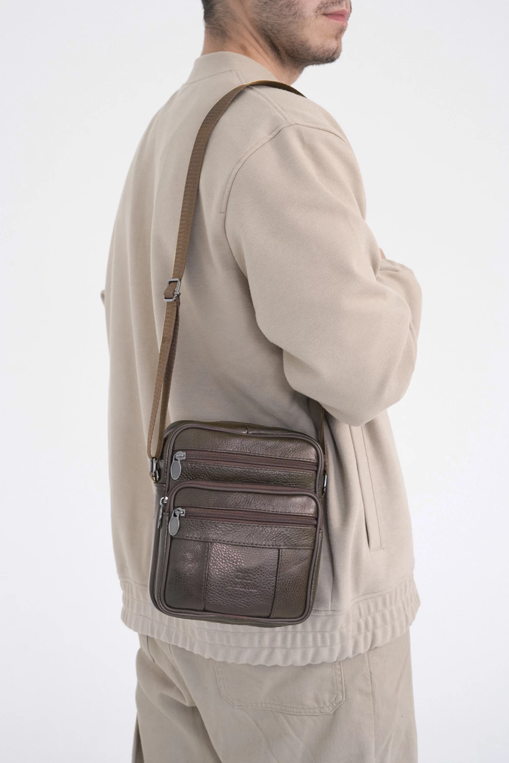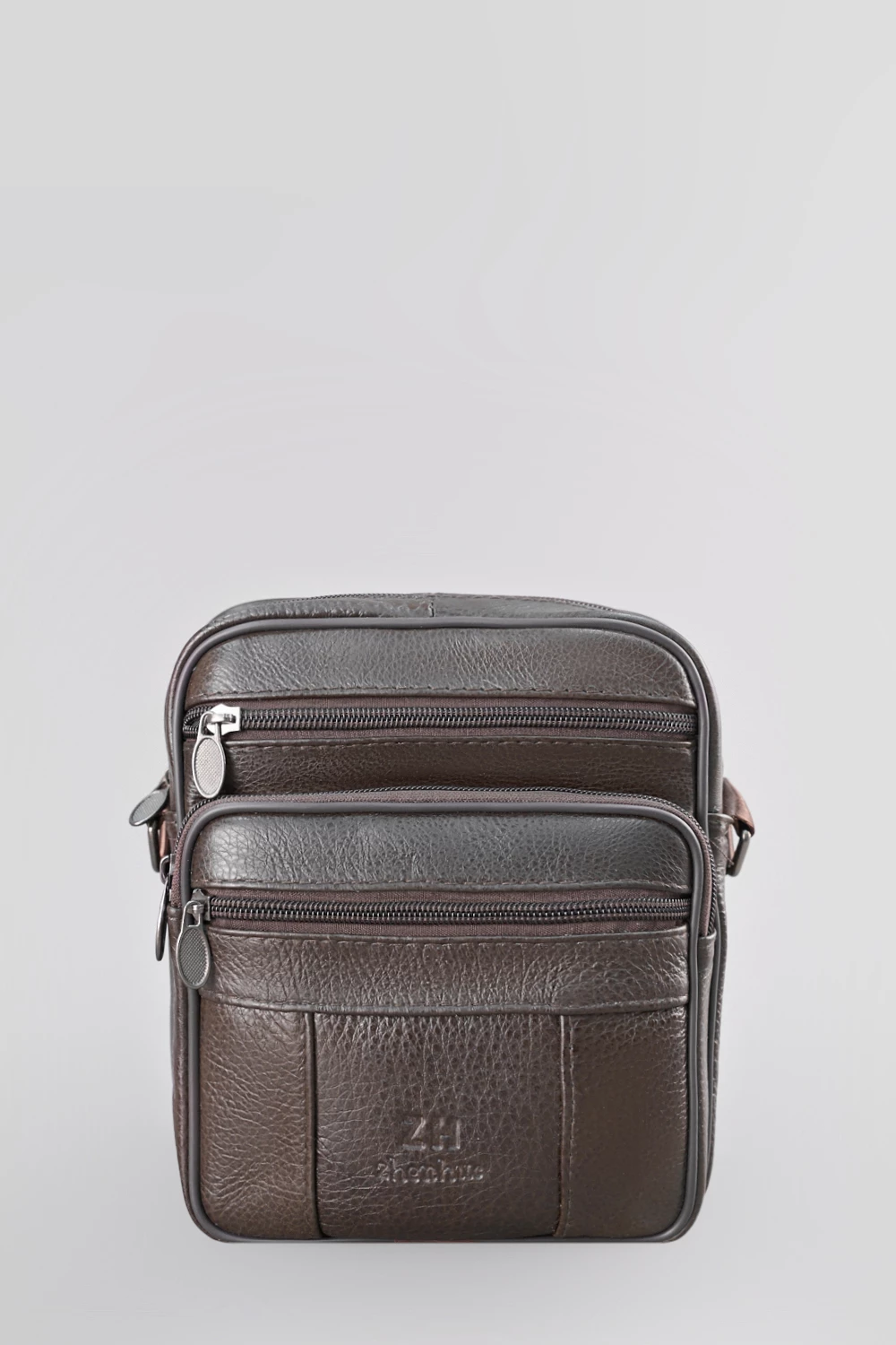 Мужская сумка через плечо из натуральной кожи коричневого цвета. Внутри два отделения на молниях, снаружи три кармана на молнии. Практичное решение для повседневной носки.● внешние карманы на замке для мелочей