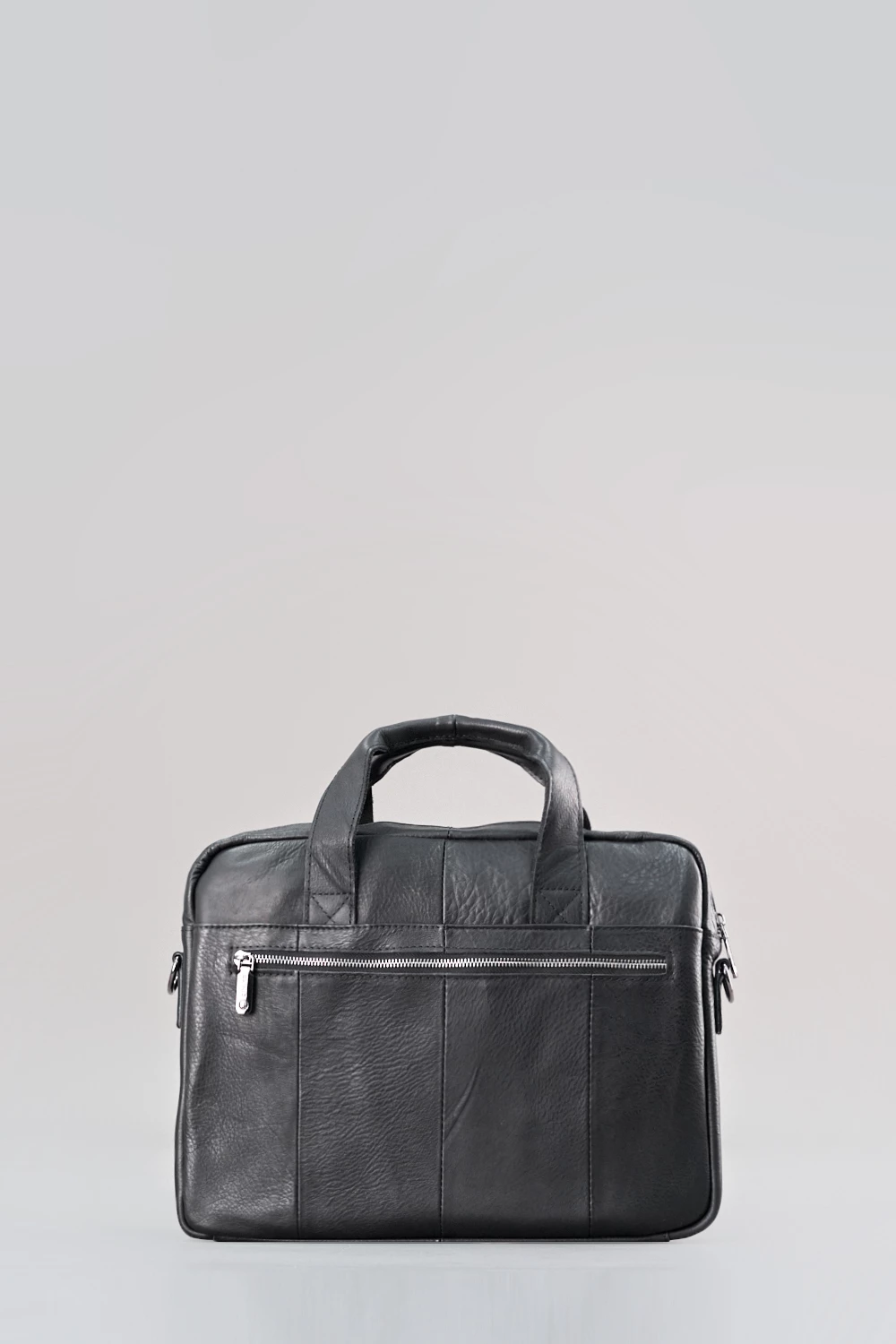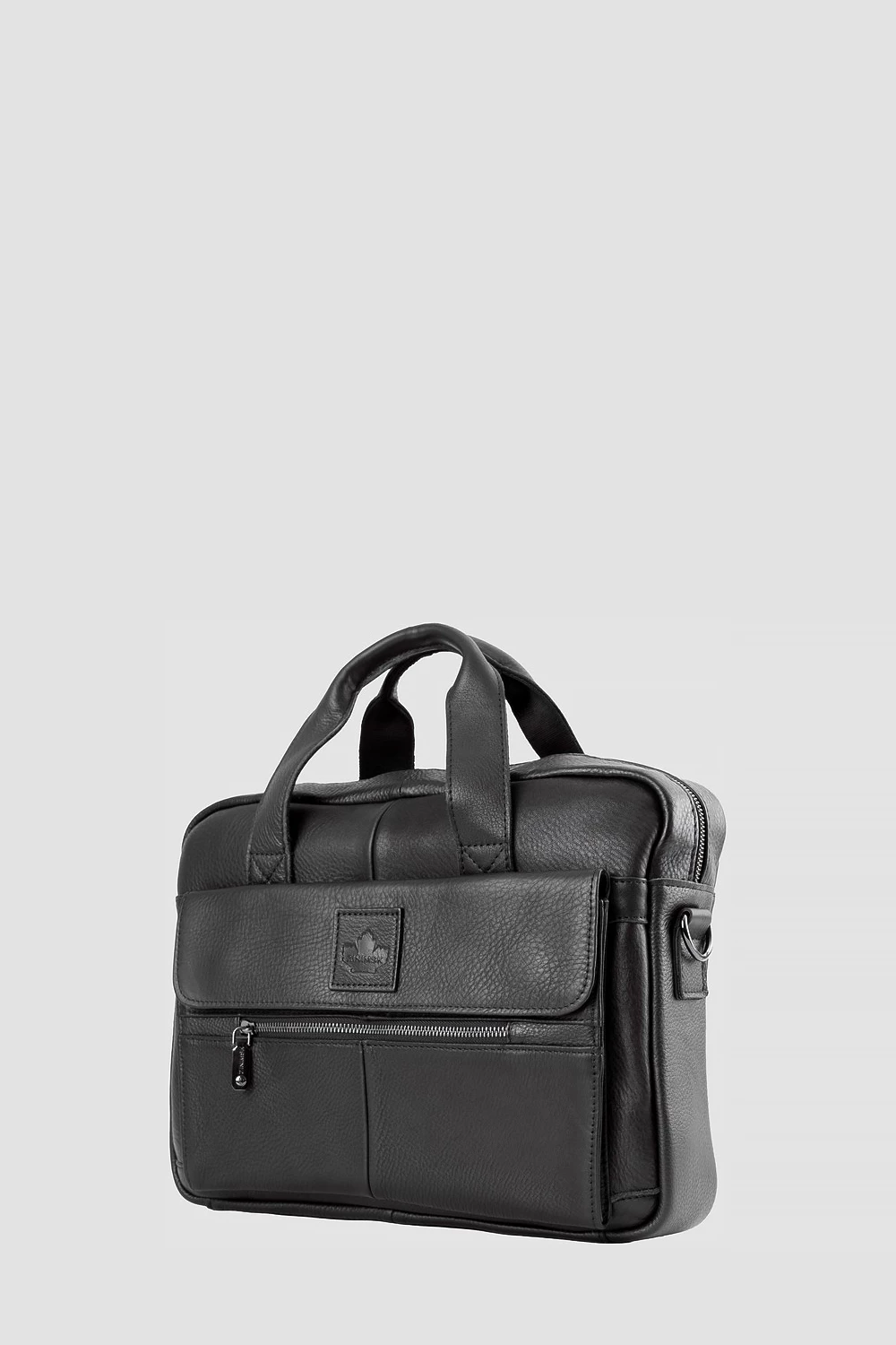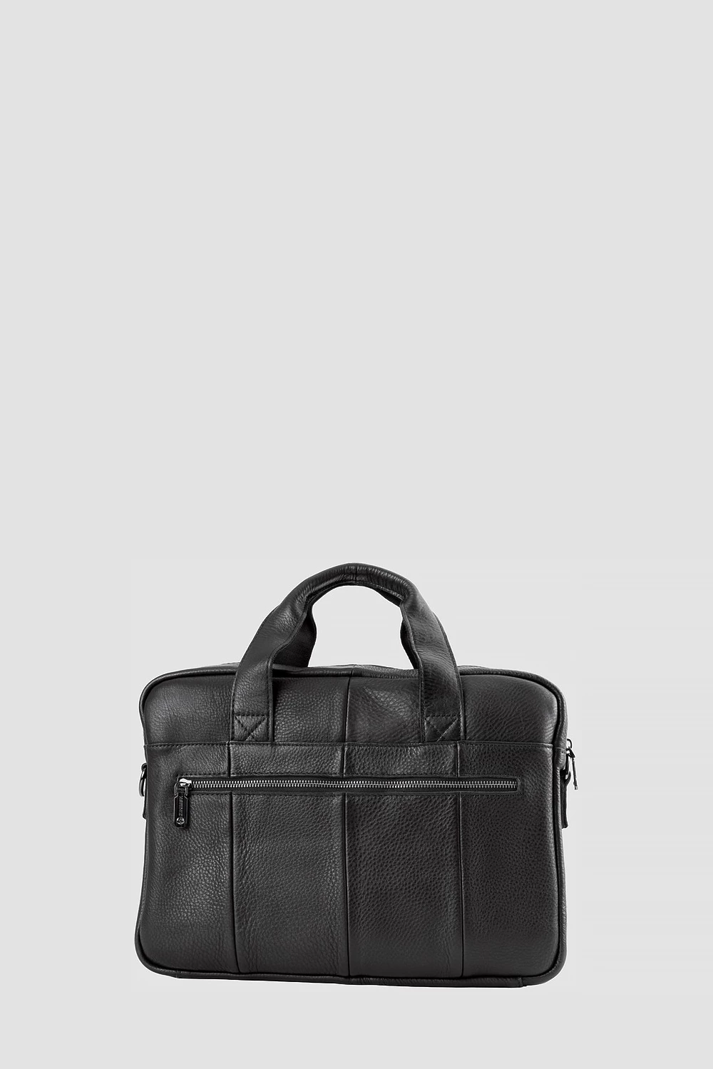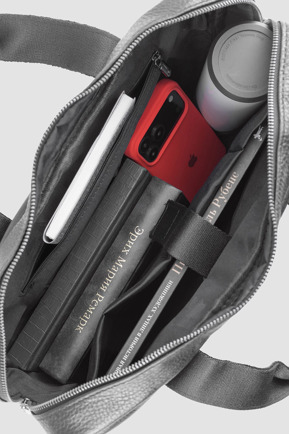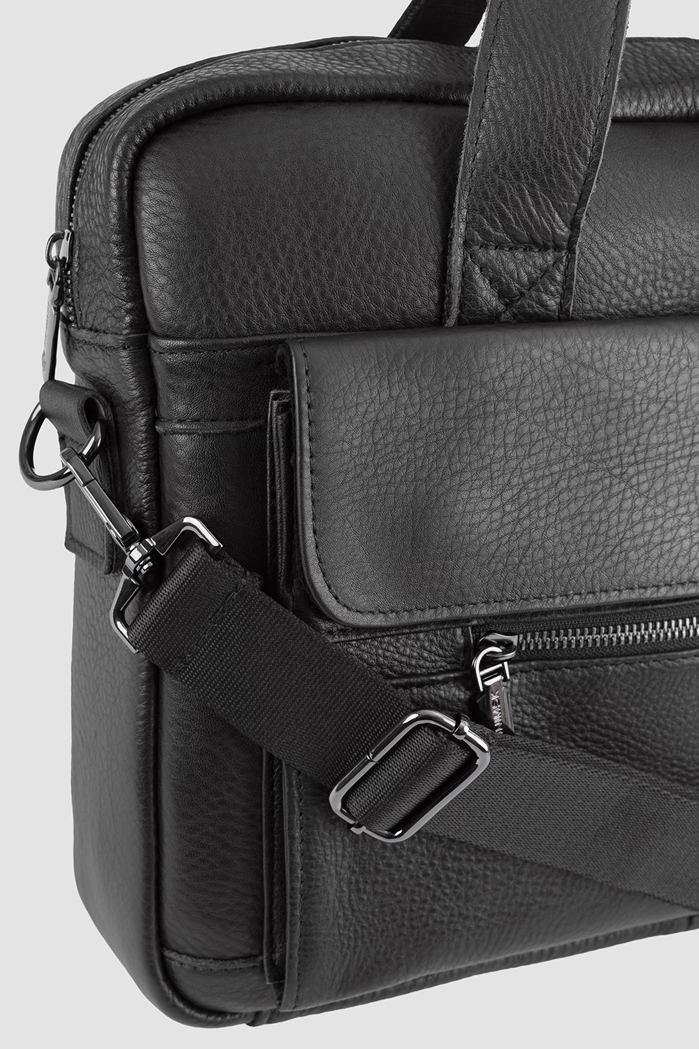 Мужская сумка-тоут из натуральной кожи чёрного цвета. Отделение на молнии с внутренним открытым карманом и дополнительным на молнии. Снаружи три кармана: два на молнии и один на магните. Комплектуется текстильным ремнём.● внешние карманы на замке для мелочей