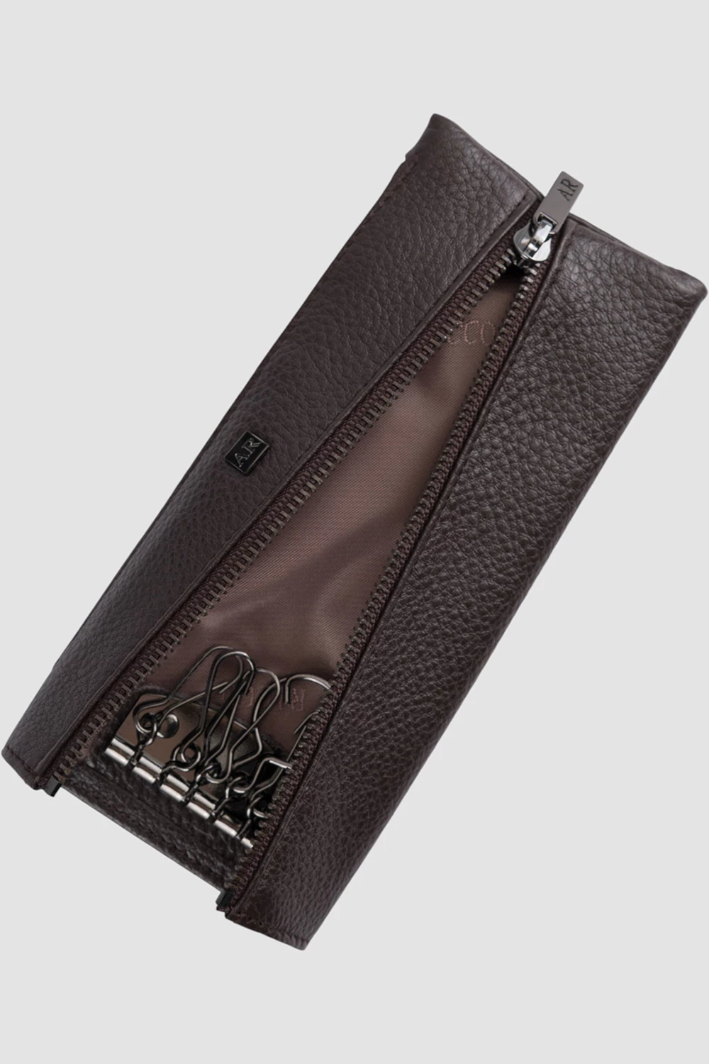 Ключница из натуральной кожи коричневого цвета. Оснащена шестью карабинами для ключей и дополнительным кармашком на молнии.
