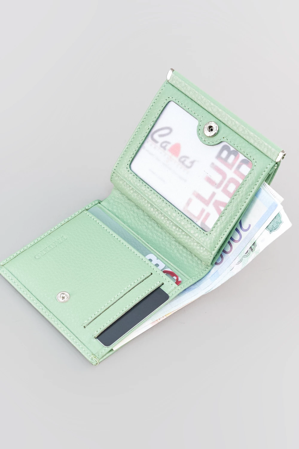 Женский компактный кошелек зеленого цвета, оснащённый кнопочной защёлкой. Внутри расположены два отделения для купюр и специальное место для карт. Внешняя монетница на кнопке облегчает доступ к мелочи. Приятный цвет и практичное исполнение сделают кошелек любимым аксессуаром каждой девушки.
