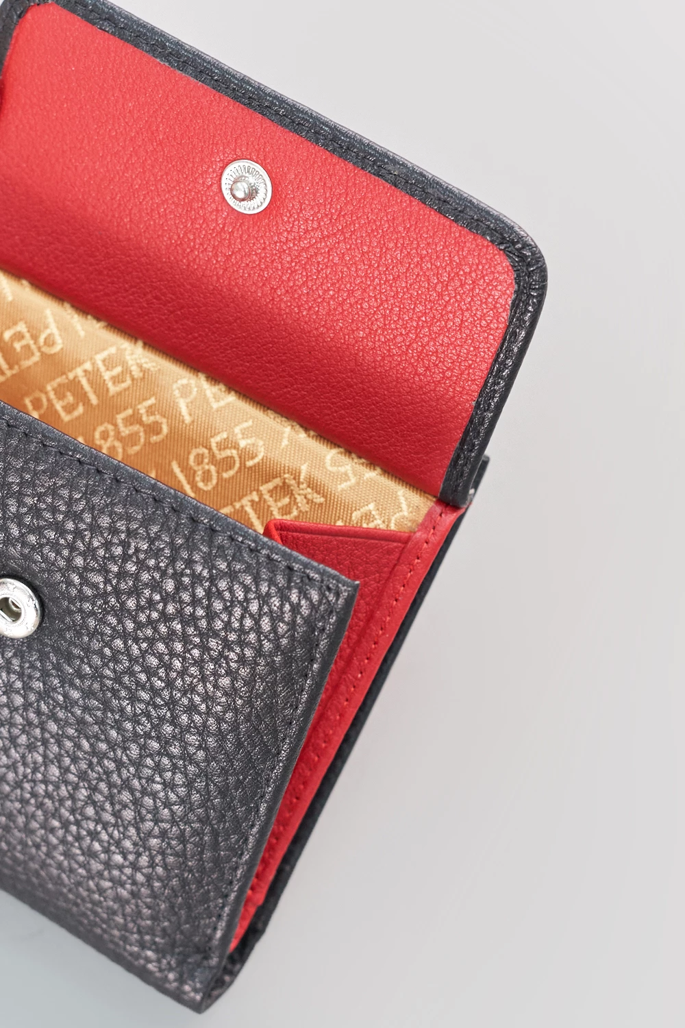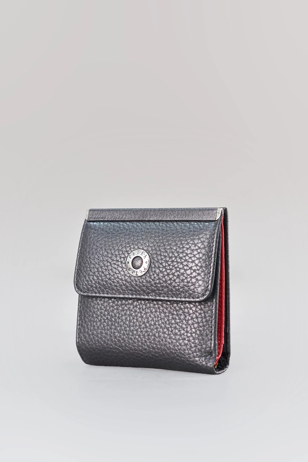 Этот компактный кожаный кошелек вмещает купюры. Материал изготовления - натуральная кожа. Внутреннее пространство включает специальные слоты для пластиковых карт, два кармана для купюр и наружную монетницу, закрывающуюся на кнопку.