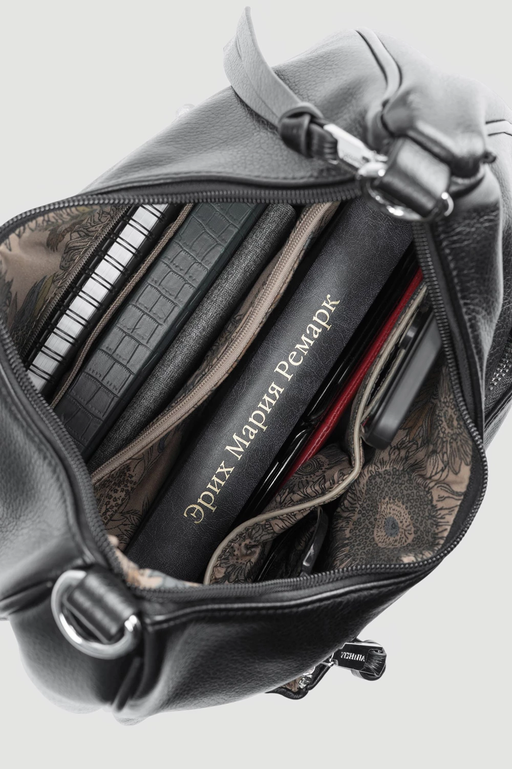 Элегантная сумка-мессенджер чёрного цвета - воплощение стиля и функциональности. Изготовлена из экокожи, оснащена тремя вместительными отделениями на молниях, двумя открытыми внутренними карманами и тайным отделом на молнии.Фасад украшен парой аккуратных накладных карманов, а сзади спрятан потайной карман. Подойдет как для ежедневных путешествиях и деловых встречах.