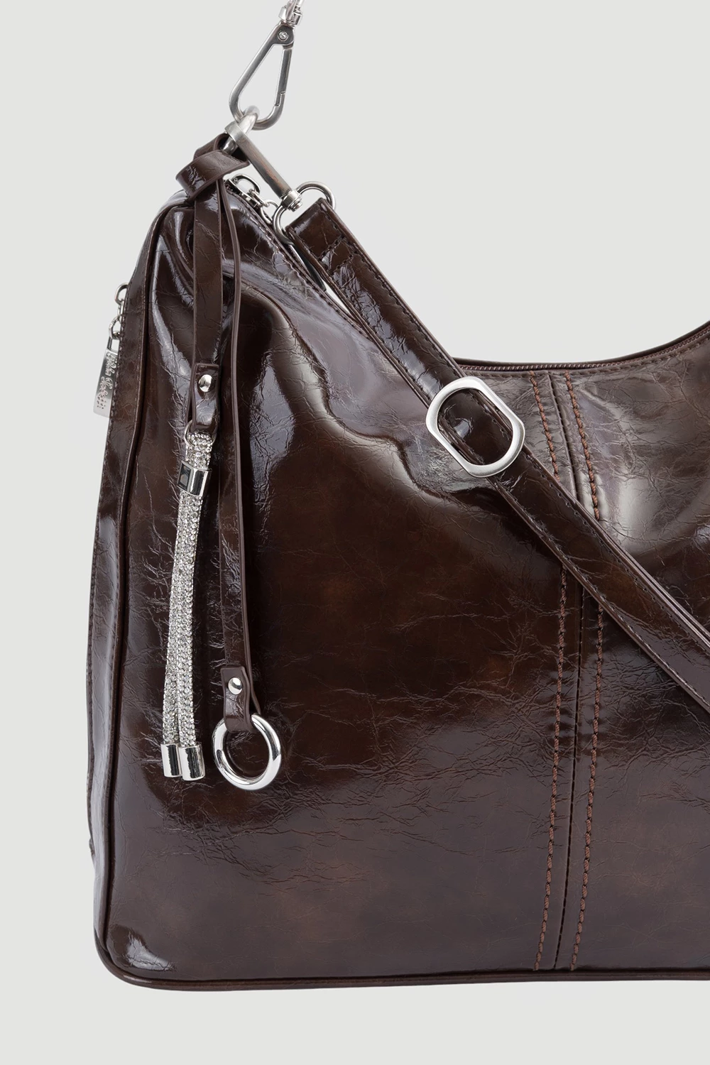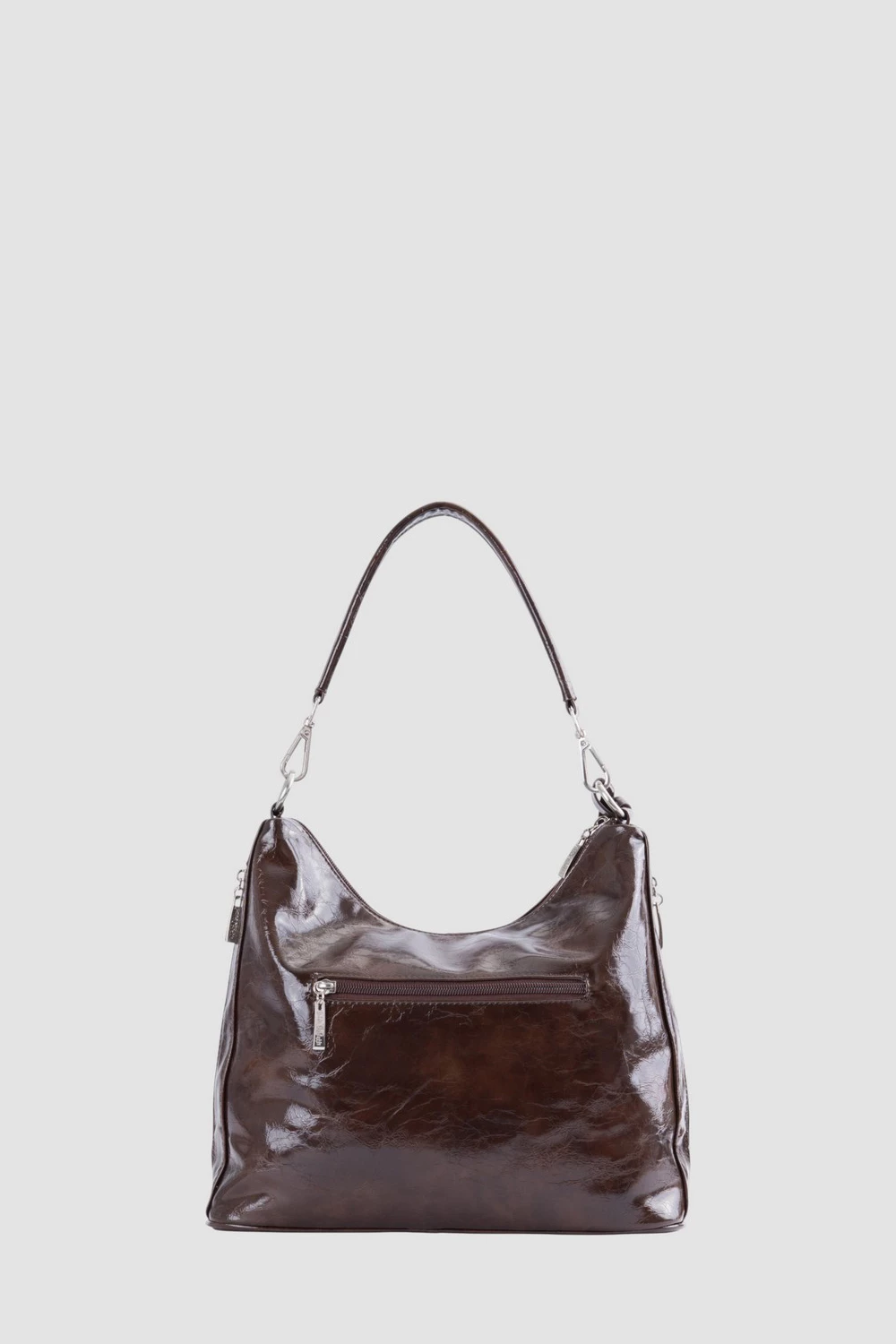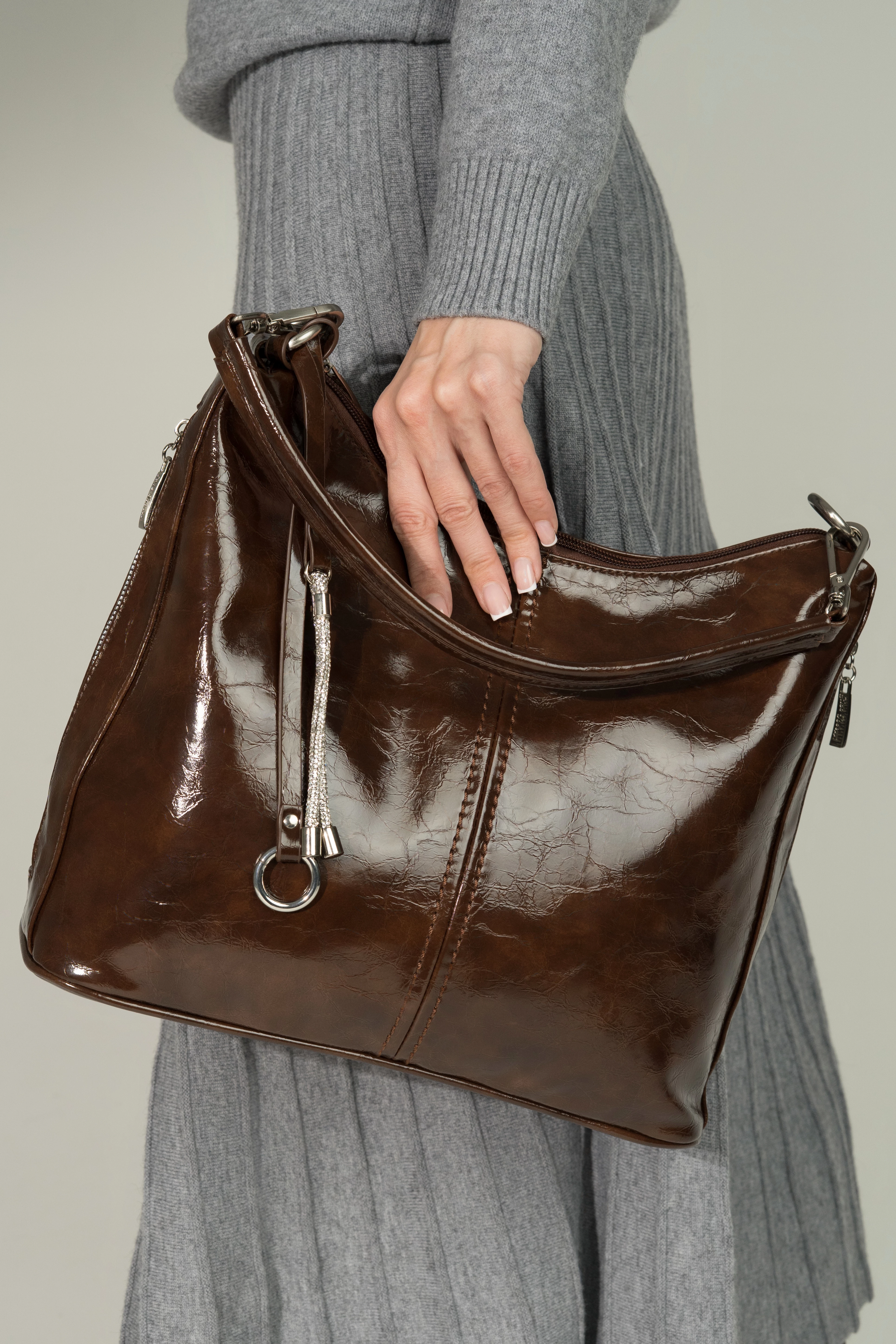 Сумка-мешок коричневого цвета выполнена из экокожи. Внутри два отделения, разделённые карманом на молнии, также имеются дополнительный внутренний карман на молнии и два открытых кармана.Снаружи предусмотрен задний карман на молнии. В комплект входят длинный и короткий ремни. Подходит для повседневных прогулок, выездов на природу, занятий спортом и путешествий.