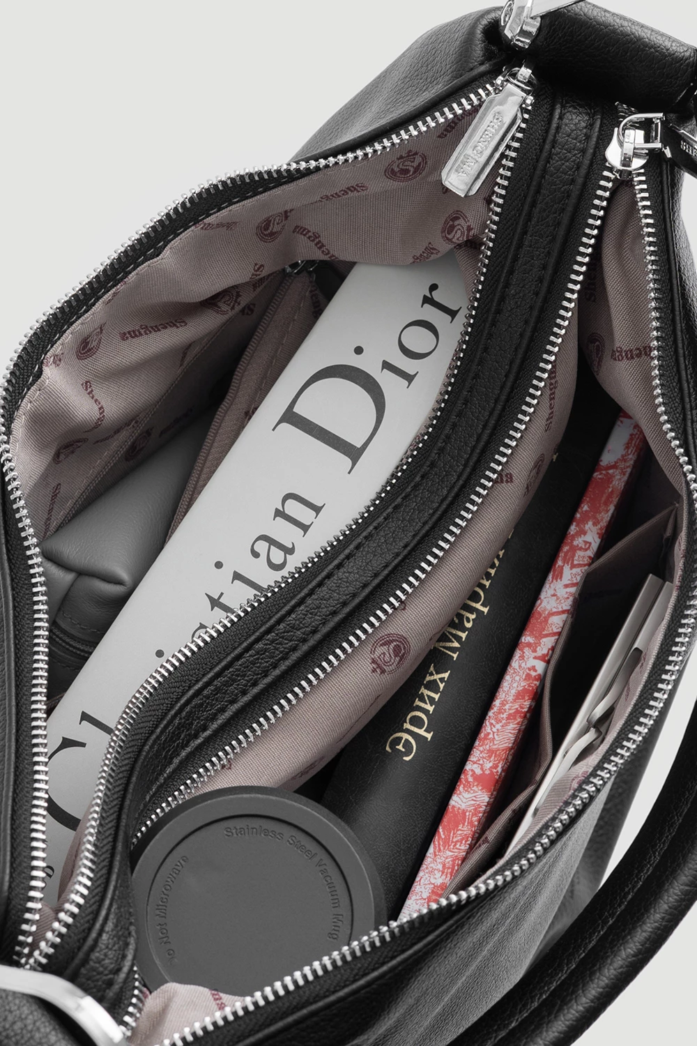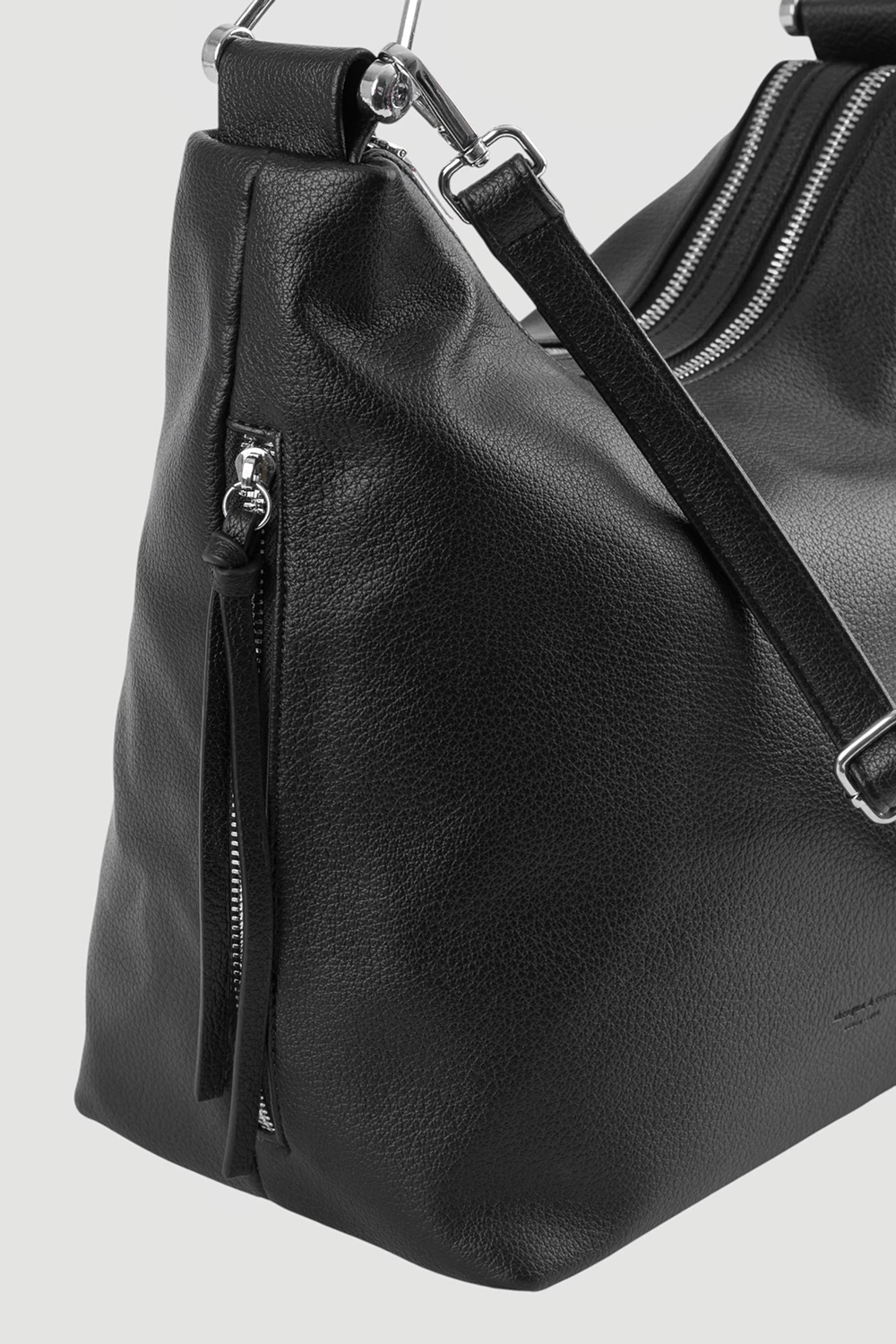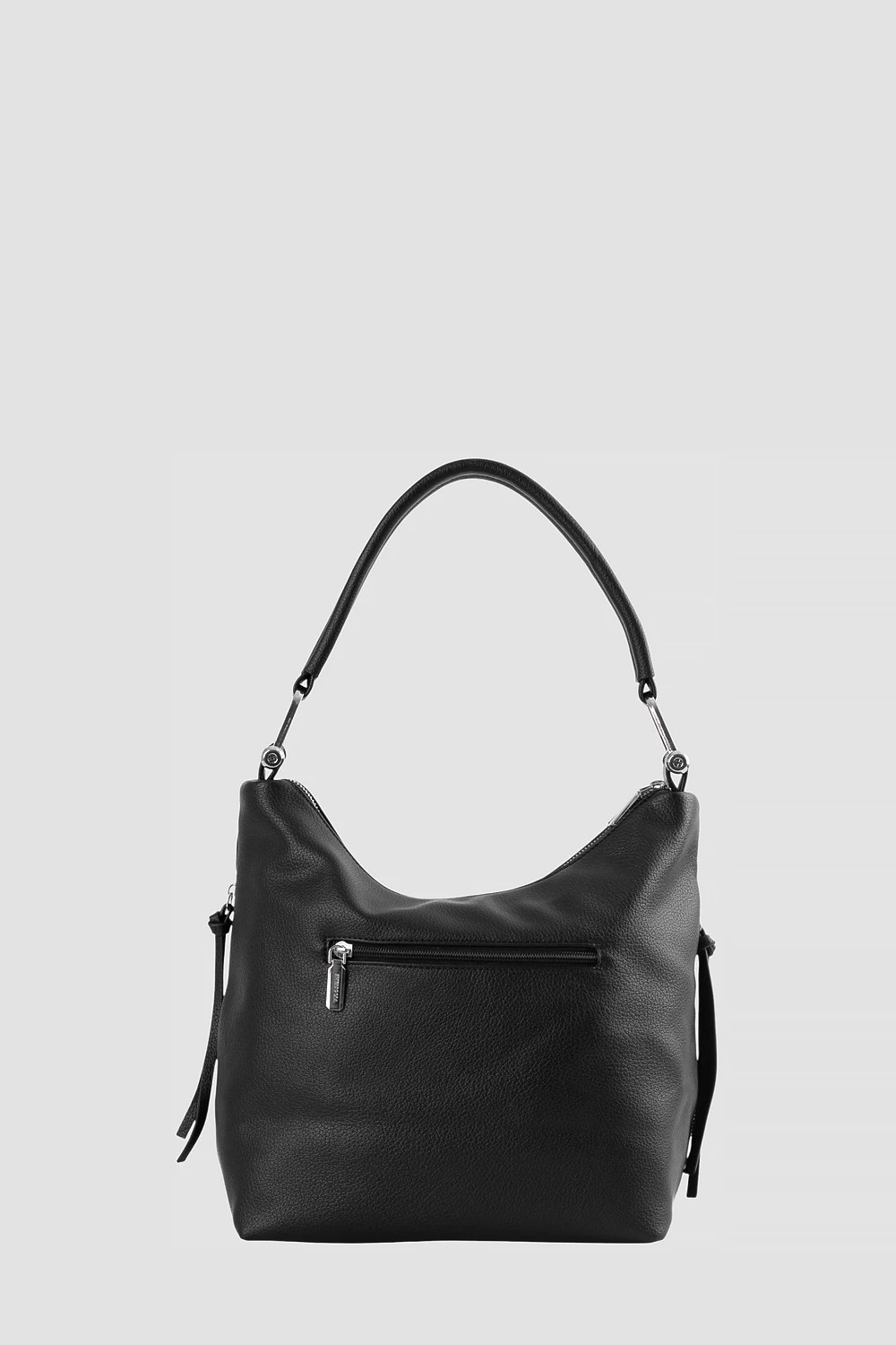 Черная сумка мешок, отличаясь простотой дизайна и утонченностью форм. Оснащена двумя секциями на молнии и двумя внешними боковыми карманами. Особенности внутренней конструкции включают один открытый карман и один закрытый на молнии.В комплект входит один регулируемый длинный ремешок. Внешний карман на молнии расположен на задней стороне изделия.