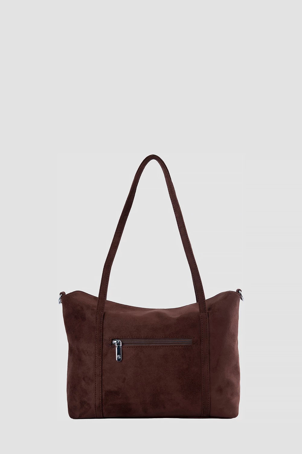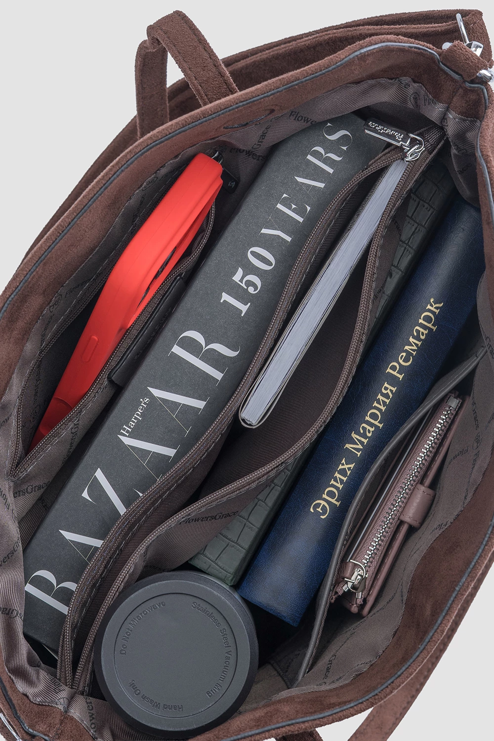 Сумка тоут коричневого цвета. Внутри просторное отделение поделено карманом на молнии, дополнительно оснащены два кармашка, закрыт молнией. Внешне украшена функциональным карманом на застёжке. В комплект входит съёмный регулируемый ремешок.● карман на молнии и открытый карман внутри