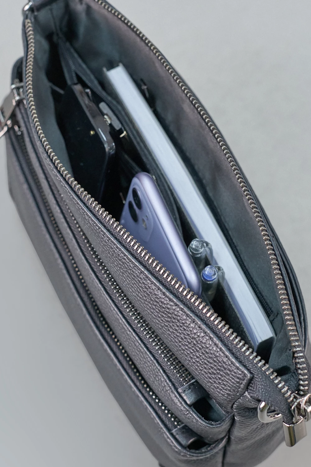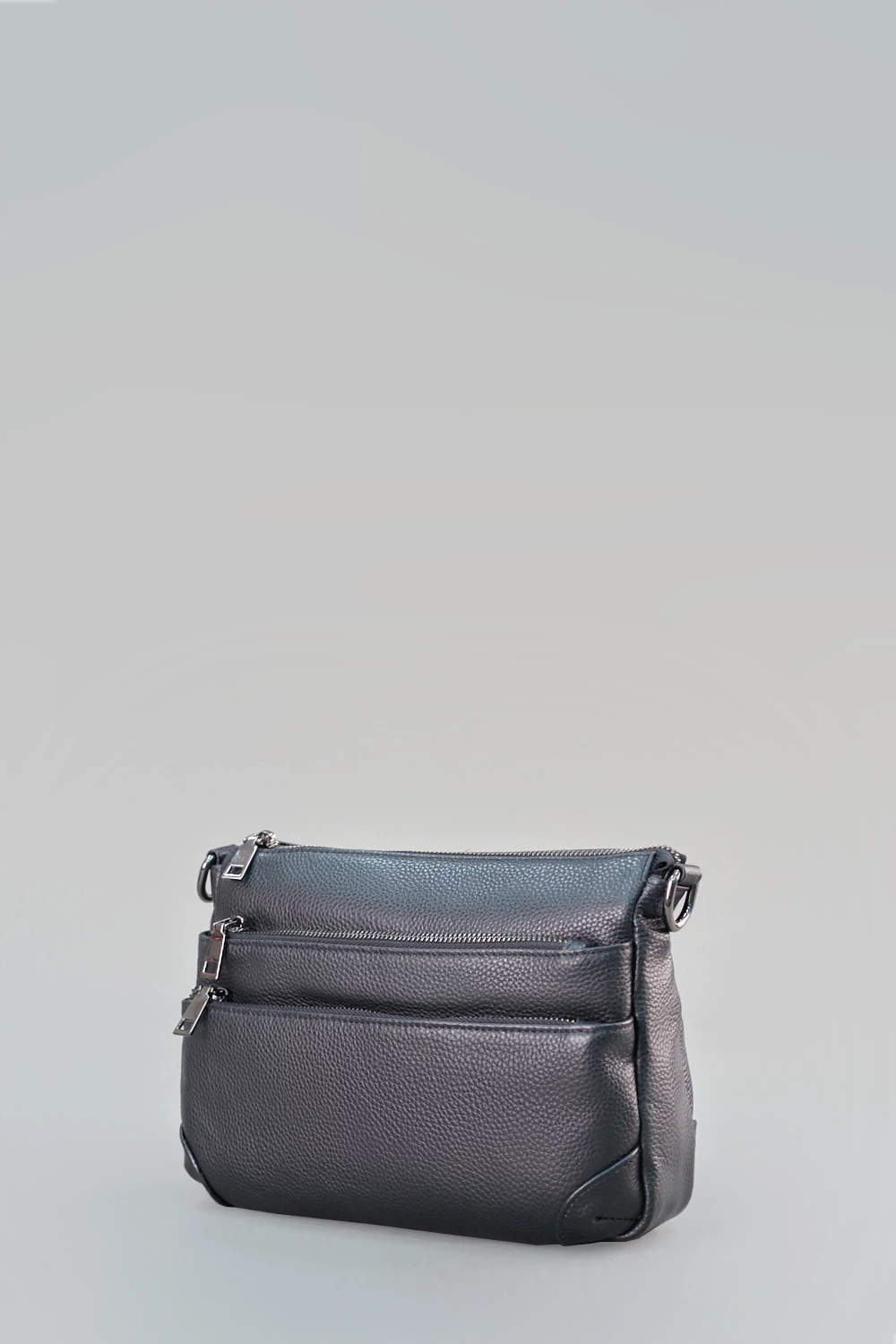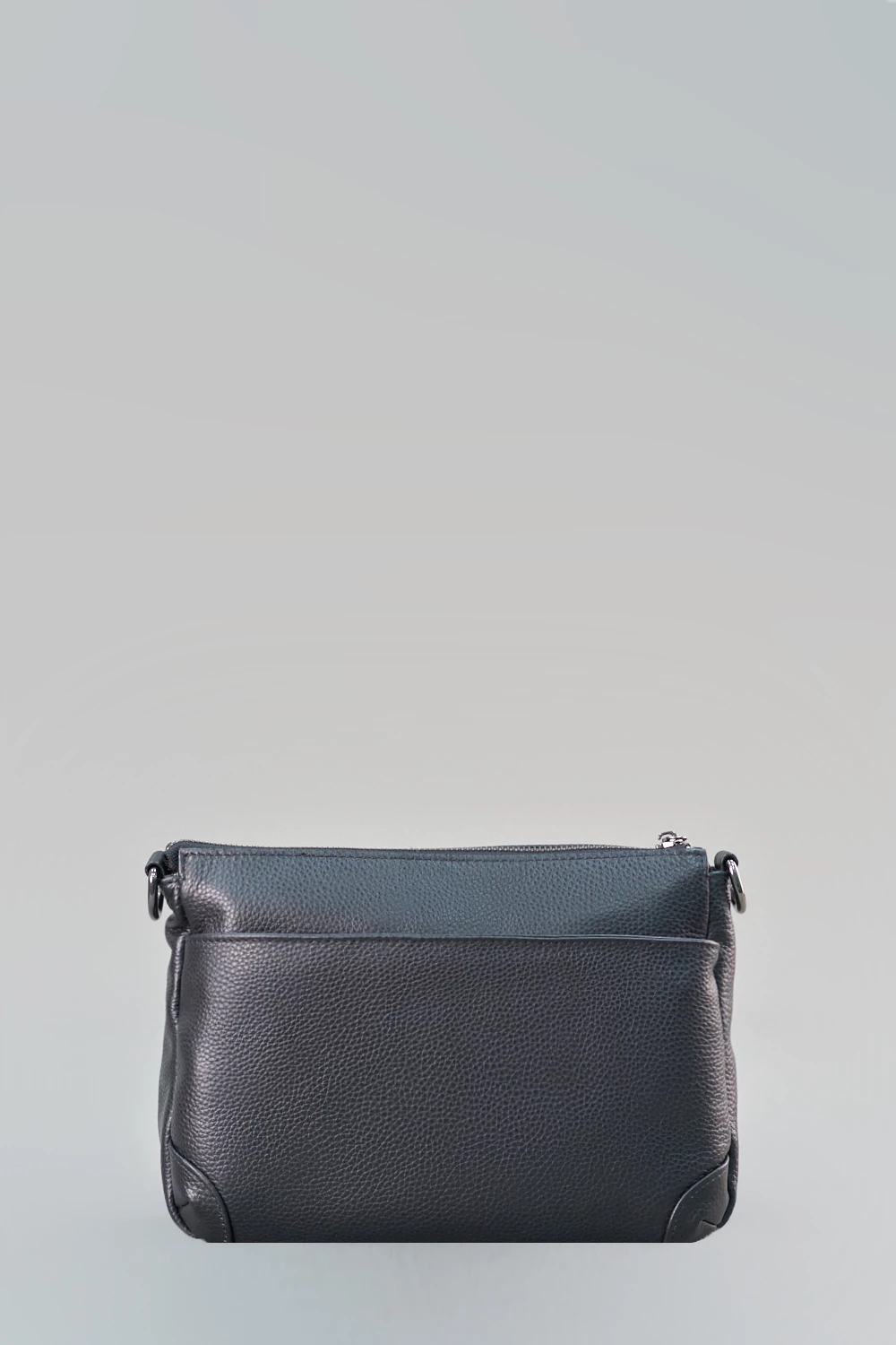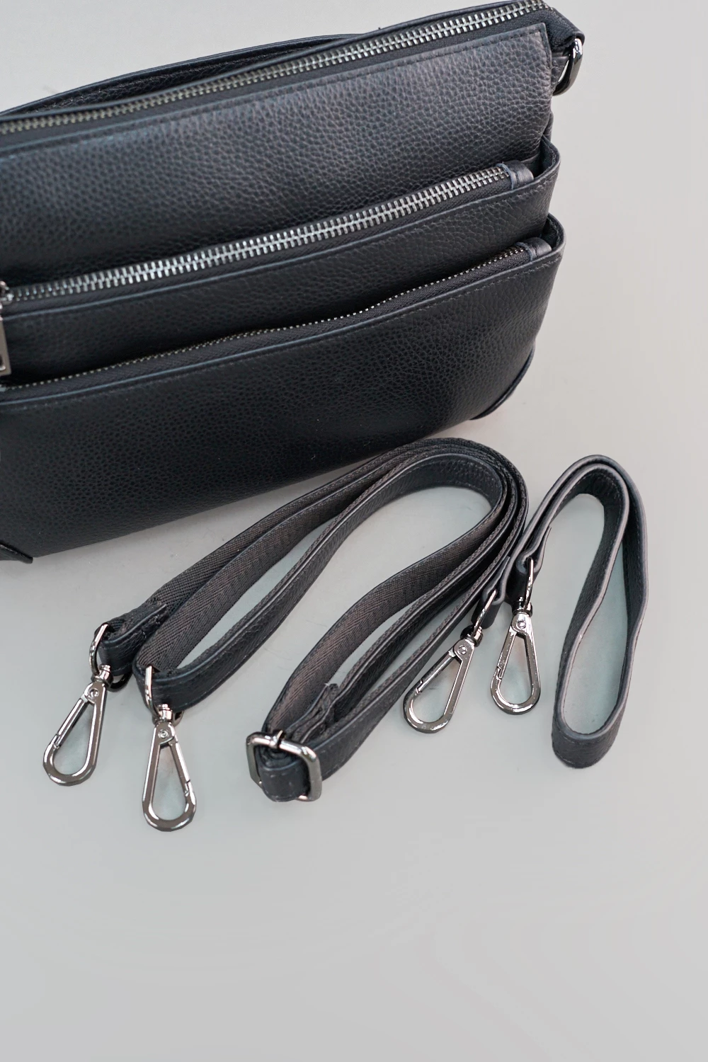 Просторная черная сумка-мессенджер с просторным центральным отделением, оснащенным карманом на молнии. Дополнительные удобства обеспечивают два боковых отсека и внутренний карман.Фронтальная сторона украшена дополнительным карманом на застёжке. Универсальность обеспечивает два ремня: короткий и длинный регулируемый.