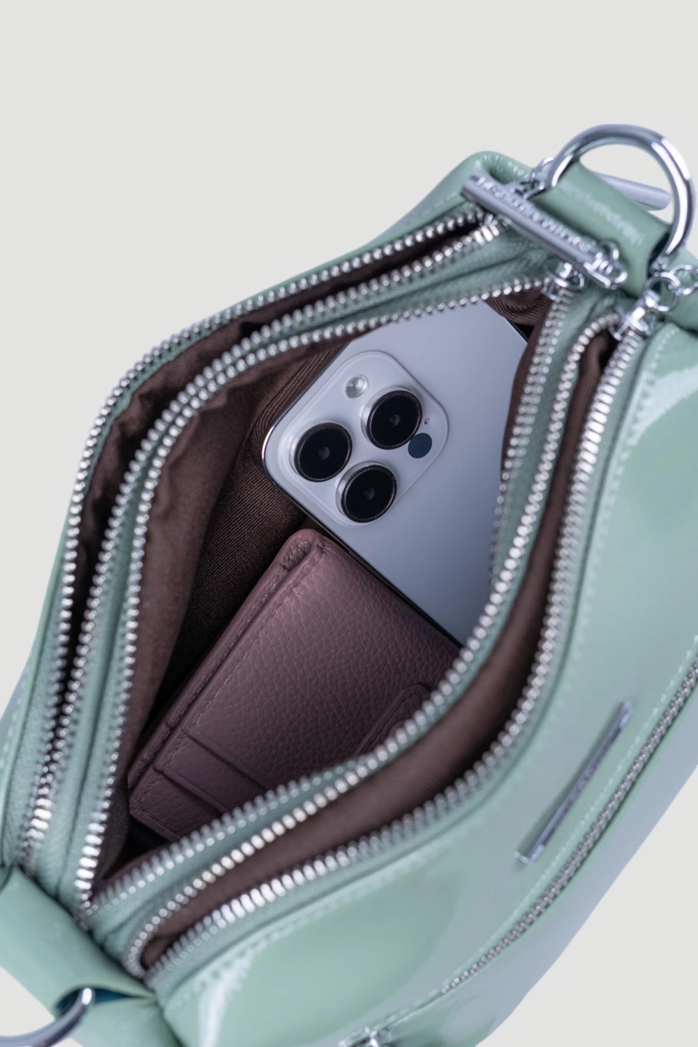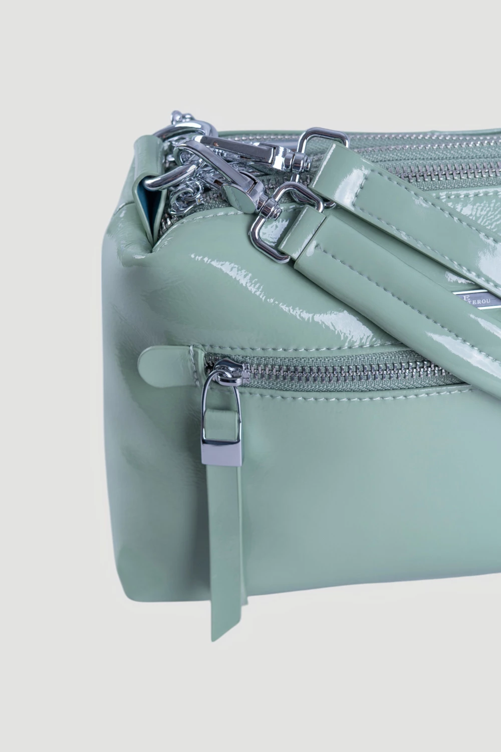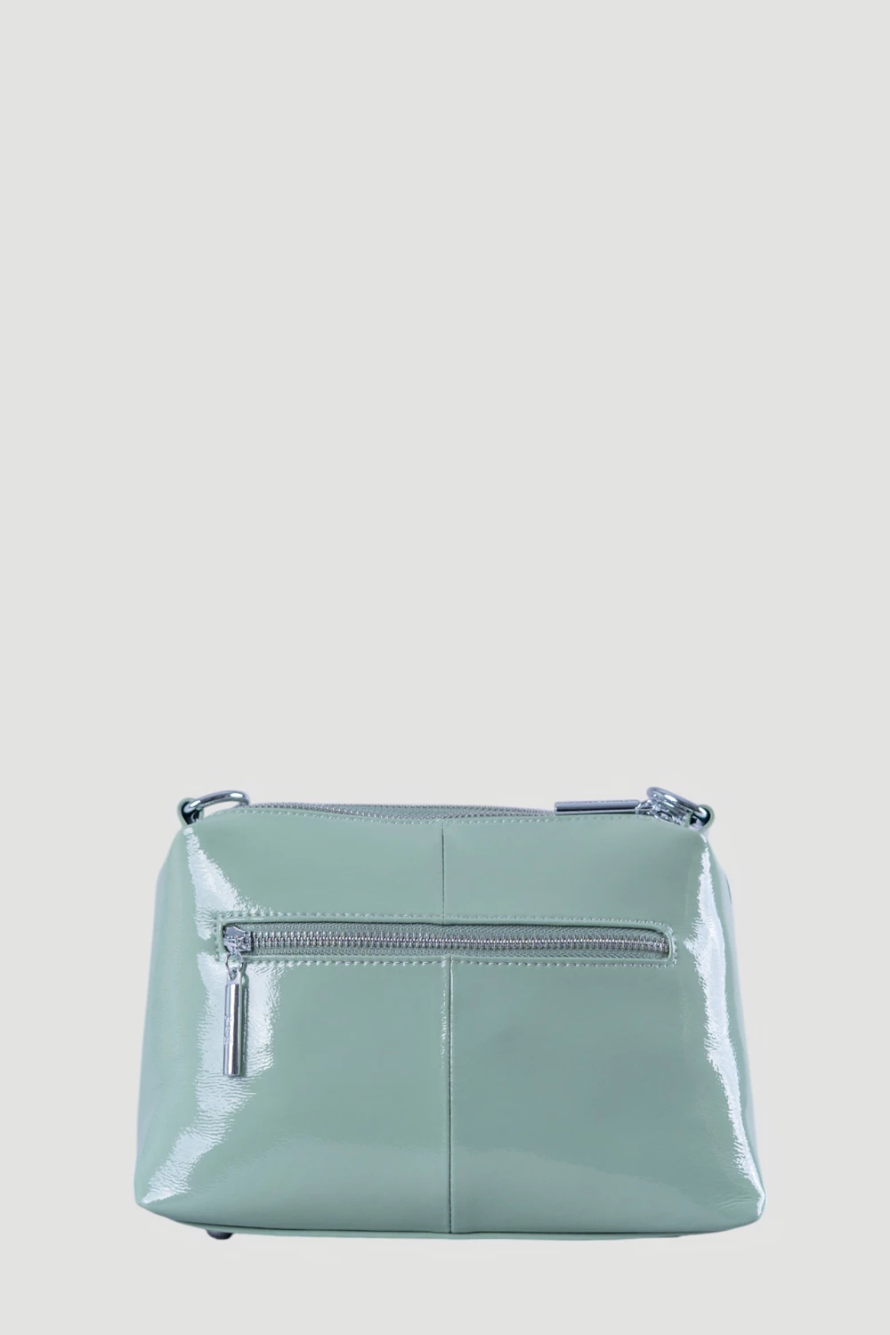 Сумка-мессенджер зелёного цвета из натуральной кожи с лаковым покрытием. Имеет три внутренних отделения на молнии. Снаружи расположены два вместительных кармана с замком. В комплекте предусмотрен регулируемый ремень.● внутри два открытый кармана и один карман на молнии