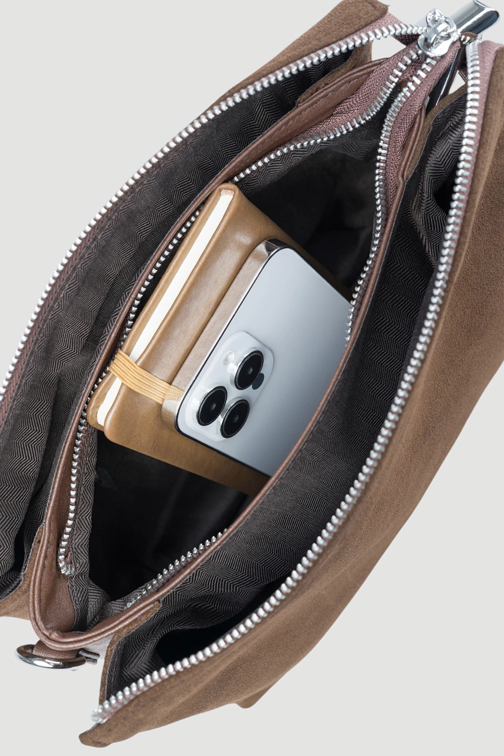 Женская сумка-мессенджер из качественной натуральной замши (велюр) коричневого цвета. Носится на длинном ремешке через тело, что позволяет быстро доставать содержимое одной рукой, не снимая сумку с плеча. А также можно держать в руках как стильный клатч. Элегантное сочетание мягкости и комфортна для любого случая.● съёмным, тонкий плечевой ремень, легко адаптируется под ваш образ и настроение