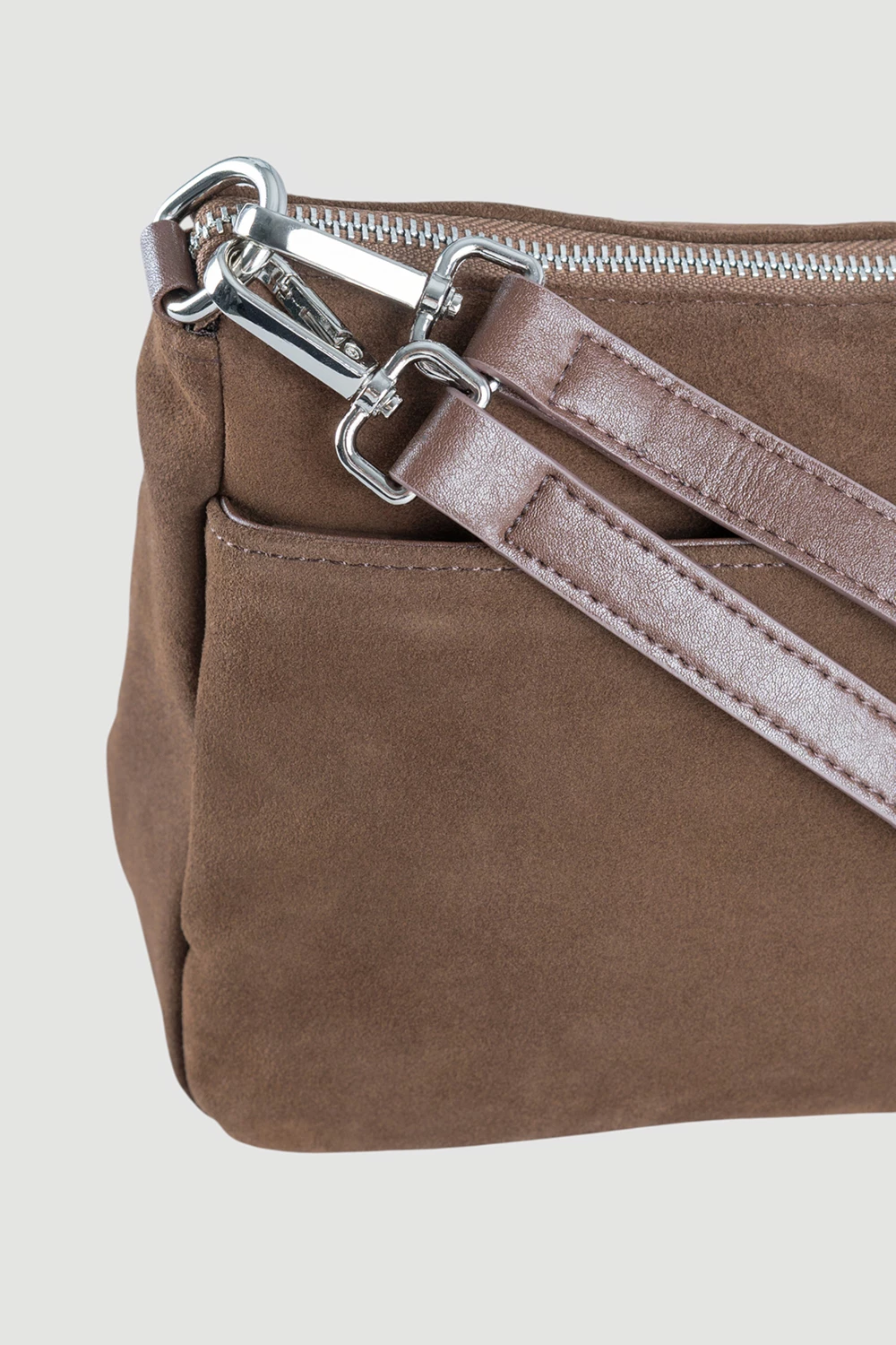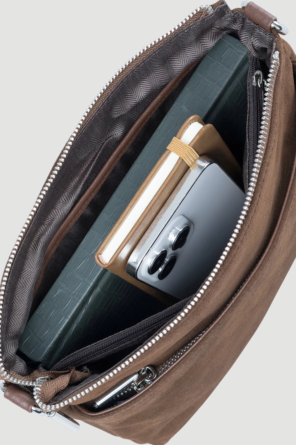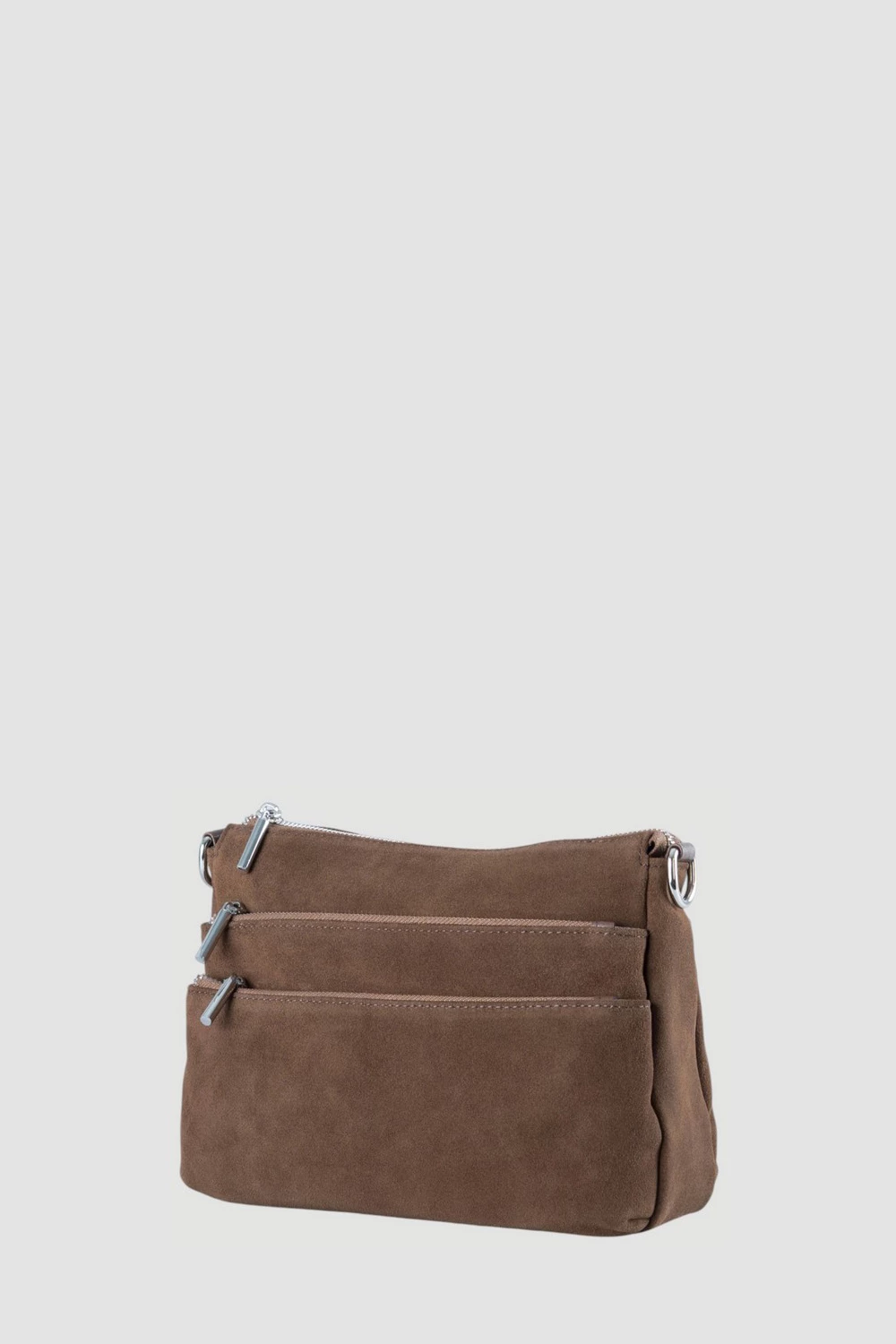 Коричневая сумка-мессенджер из мягкого велюра. Просторное центральное отделение с карманом-молнией дополнено двумя боковыми отсеками и внутренним карманом. Спереди - дополнительный карман на застежке. Регулируемый ремень для носки на плече или через плечо. Выбор для прогулок, учебы и путешествий.● текстильный подклад