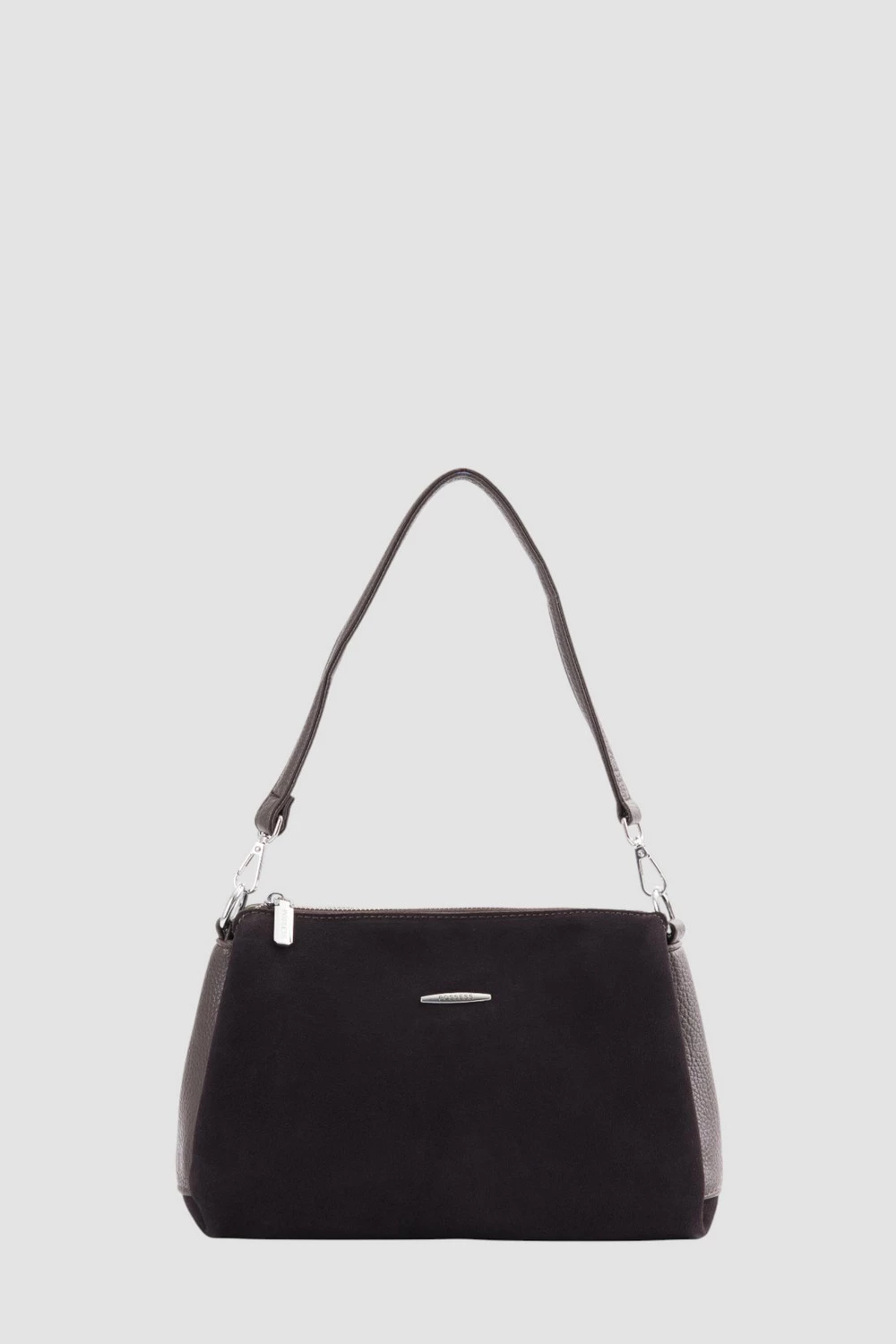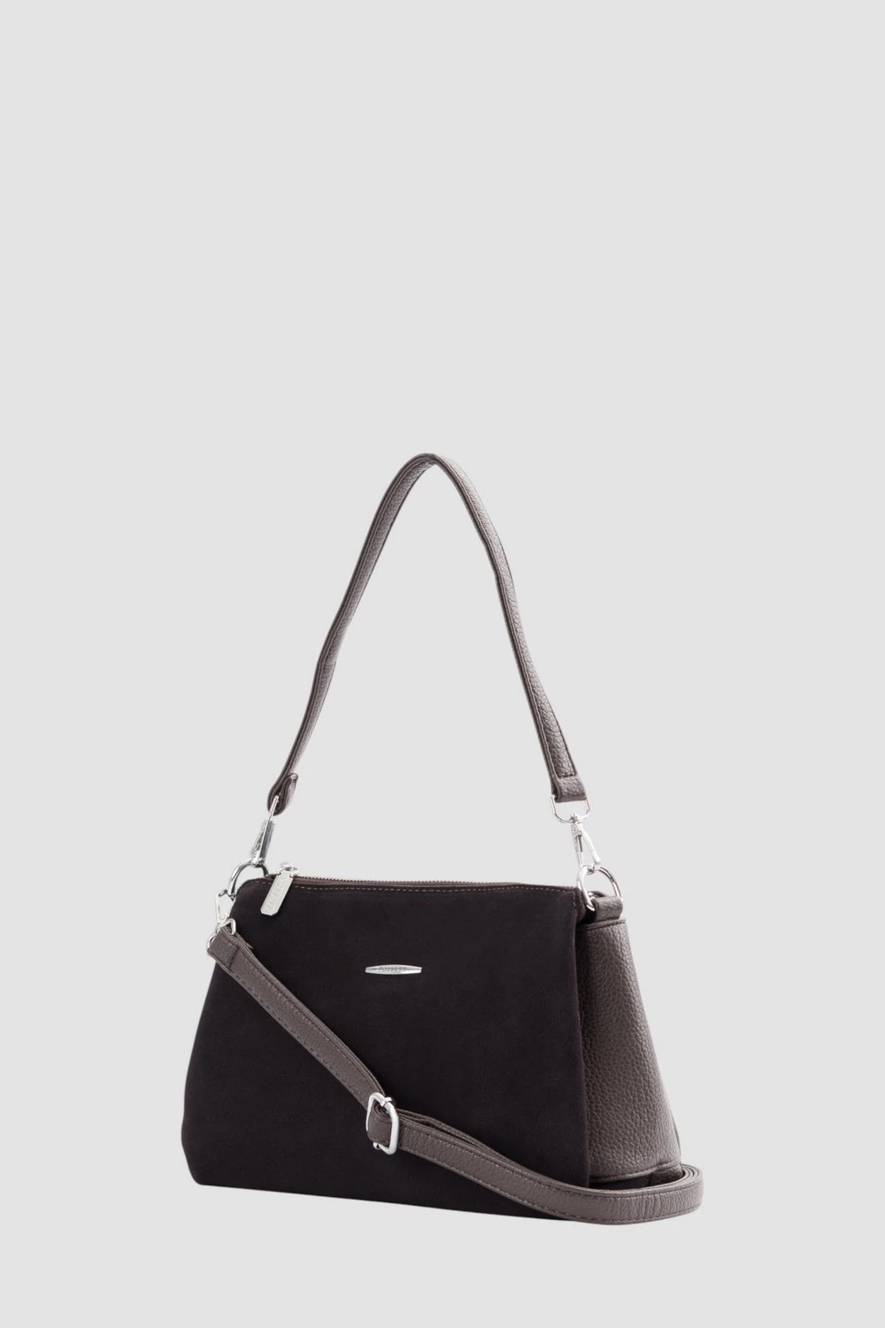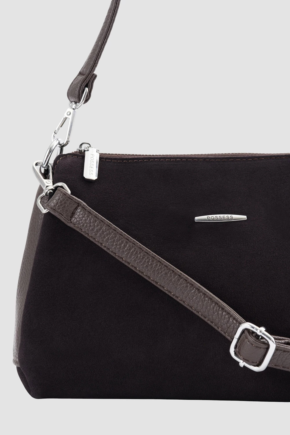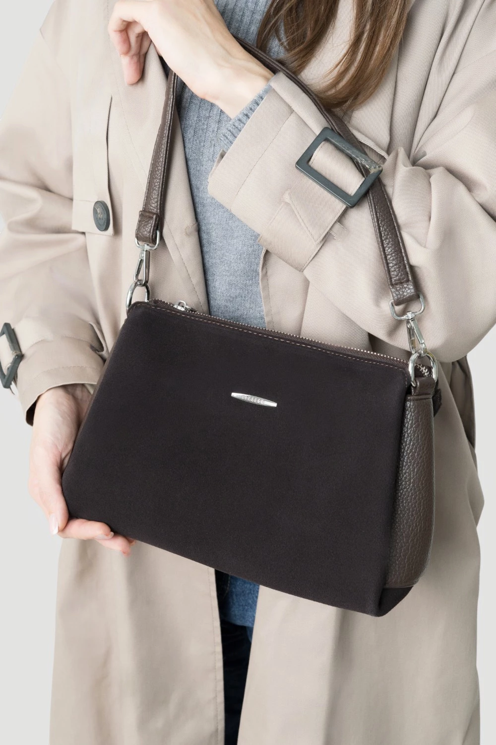 Коричневая сумка-мессенджер из велюра и экокожи. Три отделения - центральное отделение закрывается на надежную молнию. Один карман на молнии и дополнительный открытый карман.Задняя сторона сумки оснащена скрытым карманом на молнии для дополнительного пространства и защиты ценностей. Эта универсальная сумка легко адаптируется к образу, подчеркивая стиль и индивидуальность.