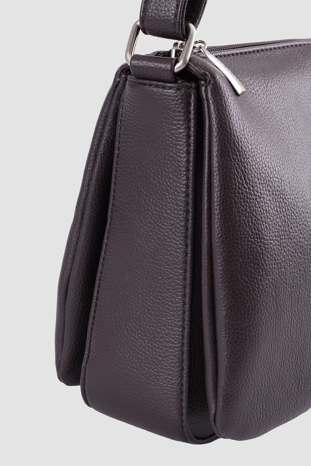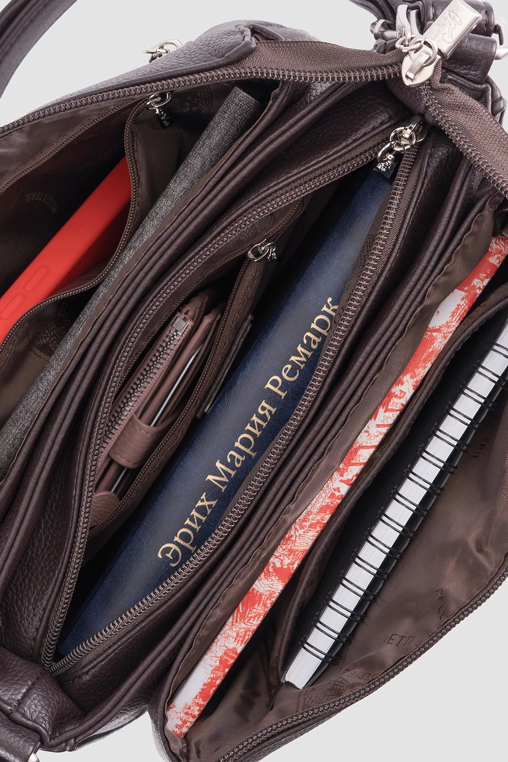 Коричневая сумка-мессенджер из экокожи - элегантный и функциональный аксессуар. Модель оснащена тремя отделениями, в которых находятся два кармана на молнии и один открытый карман.Дополнительно на задней стороне расположен карман на молнии для доступности к мелочам. Дизайн подходит как для повседневной носки, так и для путешествий, подчеркивая стиль владельца.