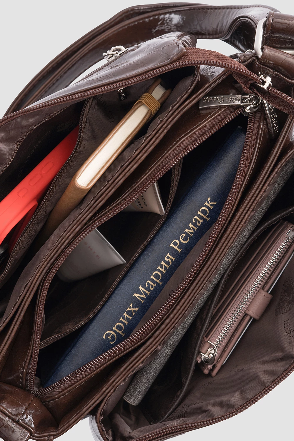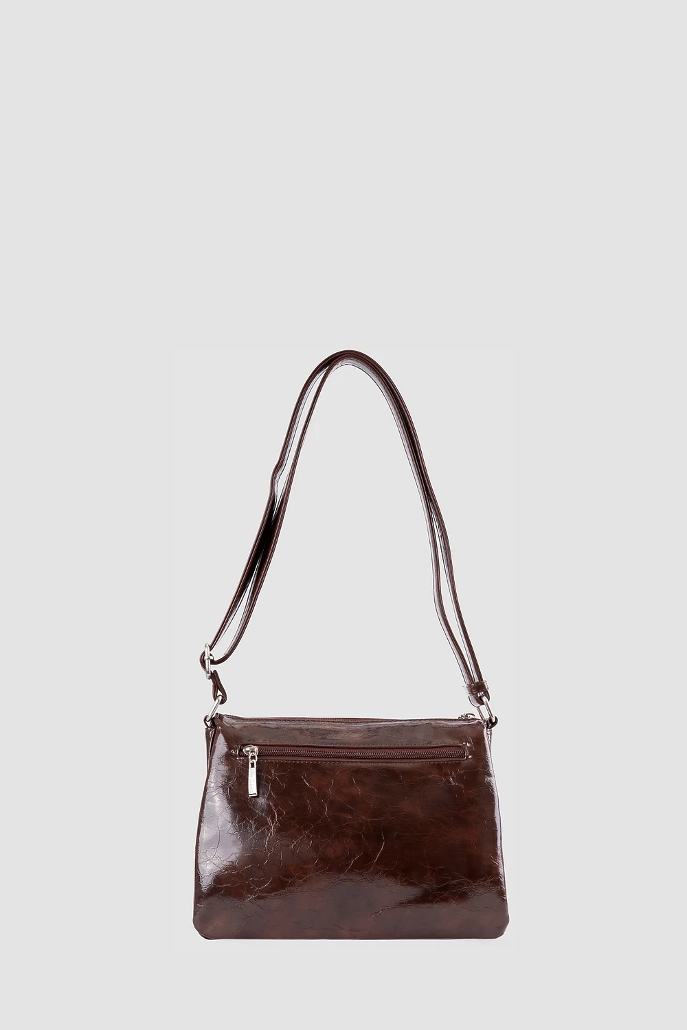 Коричневая сумка-мессенджер из экокожи с масляной обработкой. Три отделения дополняются двумя карманами на молнии и одним открытым внутри, а также задним наружным карманом на молнии.Подходит как для городского ритма, так и для деловой активности, удачно объединяя эстетику и удобство.