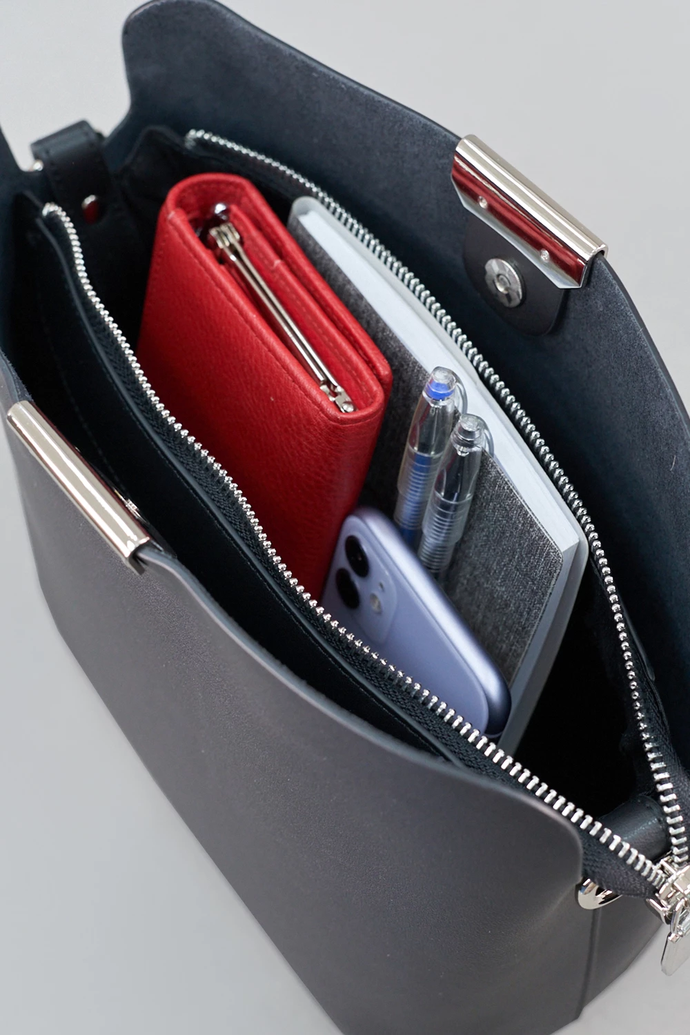 Мягкая сумка-мессенджер с двумя съемными ремнями.Внутри имеется один отдел на молнии, дополнительно защищенный клапаном.
