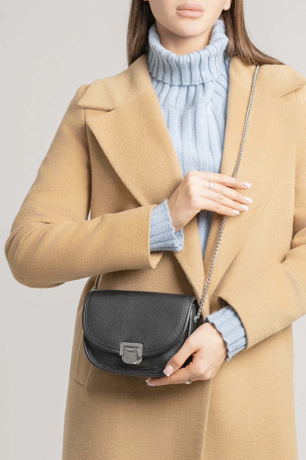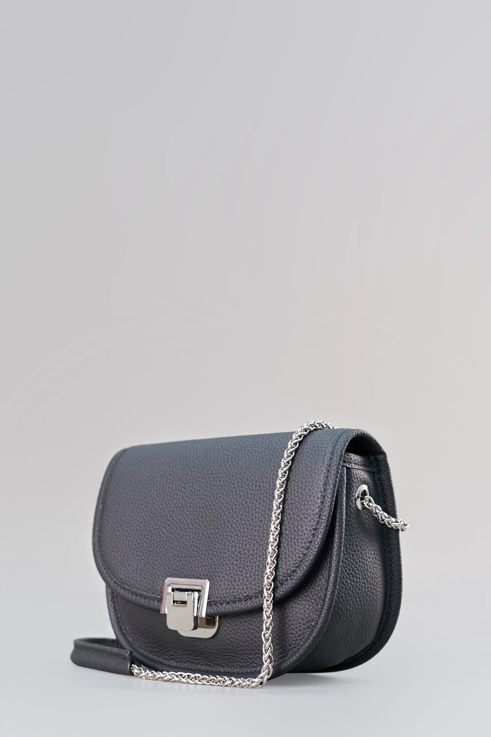 Сумка сэдл с металлической цепочкой вместо ремня. Женская сумочка выполнена из натуральной кожи. Аксессуар с поворотным металлическим замком. Вместительное отделение для телефона, бумажника, косметики и личных мелочей.● поворотный металлический замок