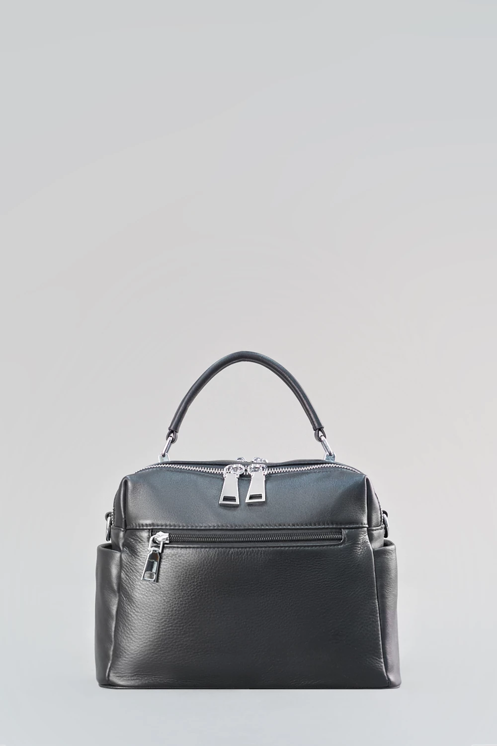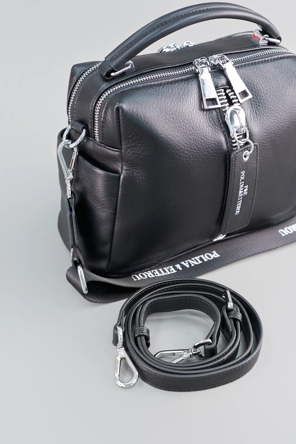 Черная сумка-мессенджер из натуральной кожи с двумя отсеками на молниях, внутри - открытый карман и отделение на замке.По бокам предусмотрены дополнительные карманы: один открытый, другой на молнии. В комплект входят съемные ремешки - кожаный и текстильный. Практична и вместительна.