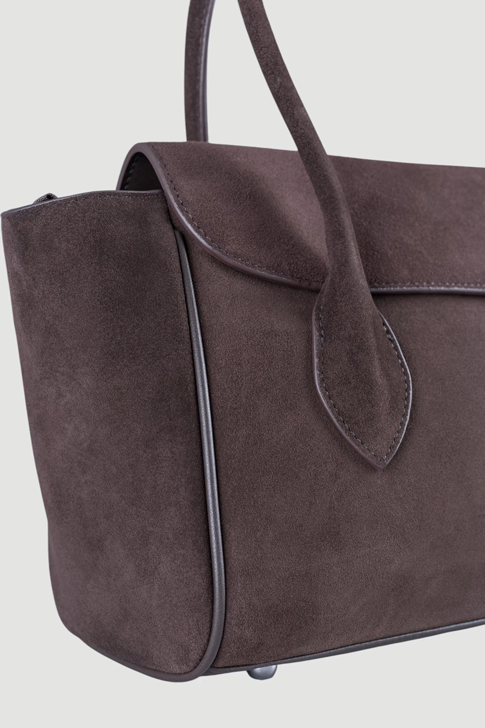 Сумка-сэтчел коричневого цвета выполнена из натуральной кожи и велюра. Внутри расположен один вместительный отсек с двумя открытыми карманами и одним на молнии.Изящный внешний вид и натуральные материалы делают сумку идеальным выбором для любителей классического стиля.