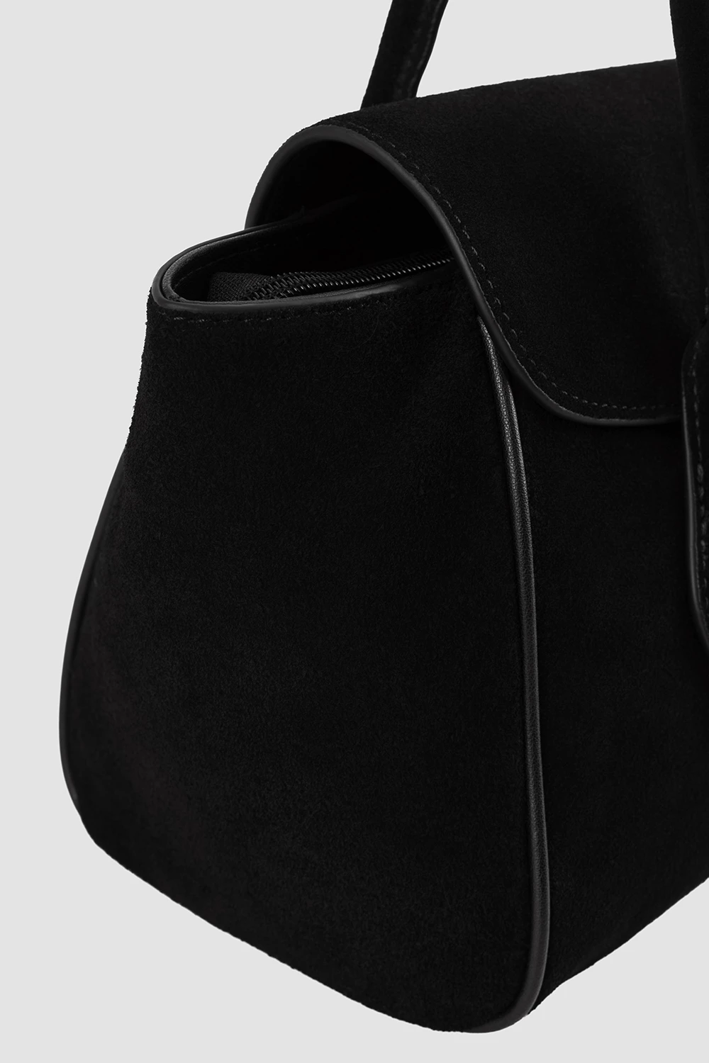 Строгая чёрная сумка-сэтчел выполнена из комбинации натуральной кожи и велюра.Просторный внутренний отсек разделён на три части: два открытых кармана и один на молнии для хранения вещей. Универсальная классика подходит как для повседневного использования, так и для официальных мероприятий.