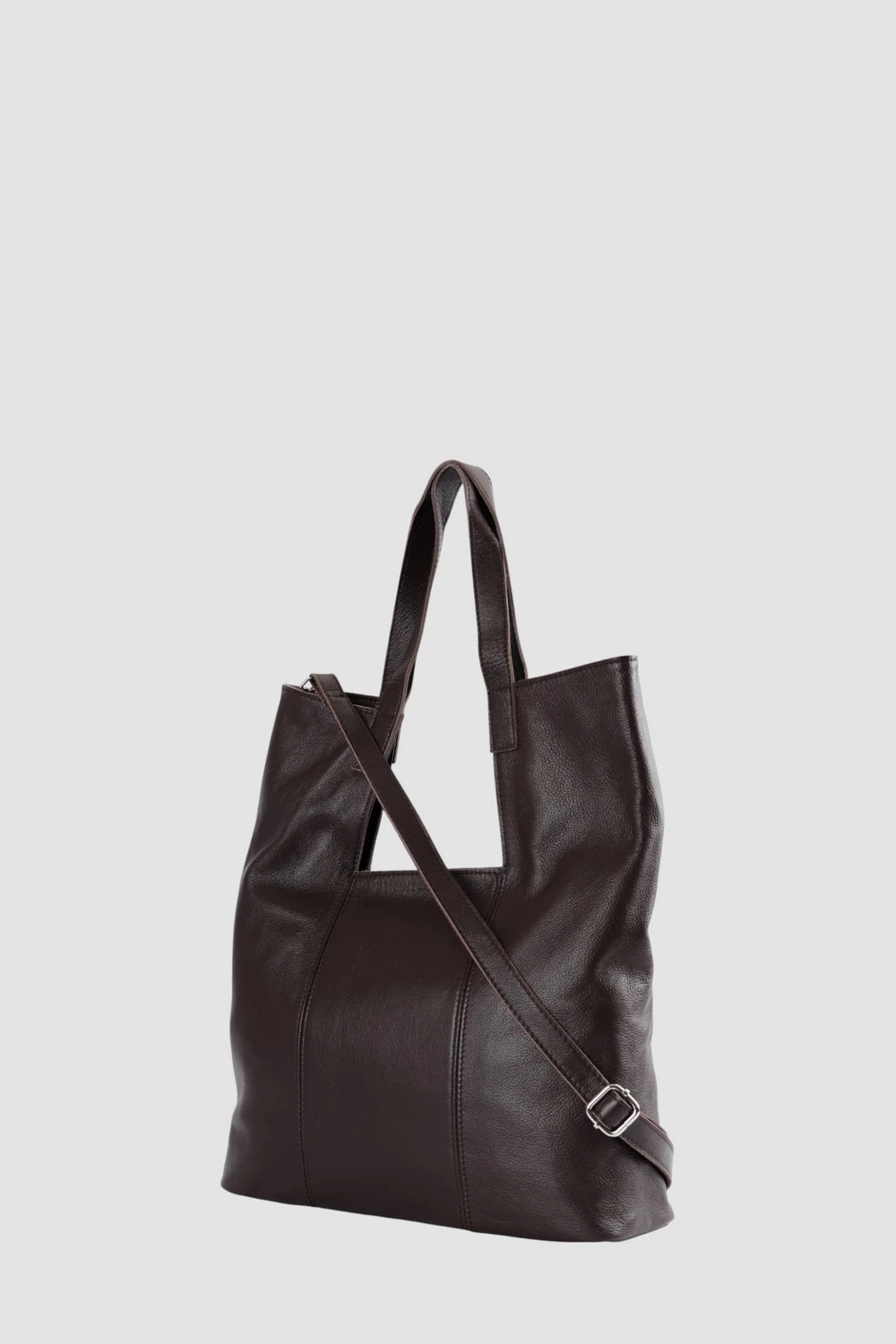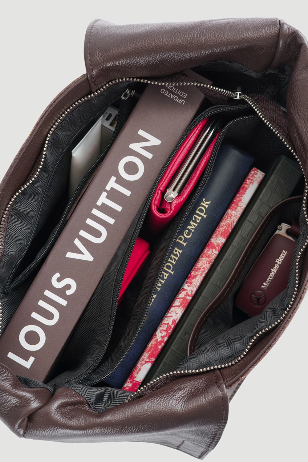 Трендовая сумка-шоппер из натуральной кожи насыщенного коричневого цвета станет дополнением образа. Просторный дизайн предусматривает два отделения, объединенных центральным карманом на молнии.Интерьер сумки оборудован открытым карманом для мелких предметов и отдельным безопасным отделом на молнии.