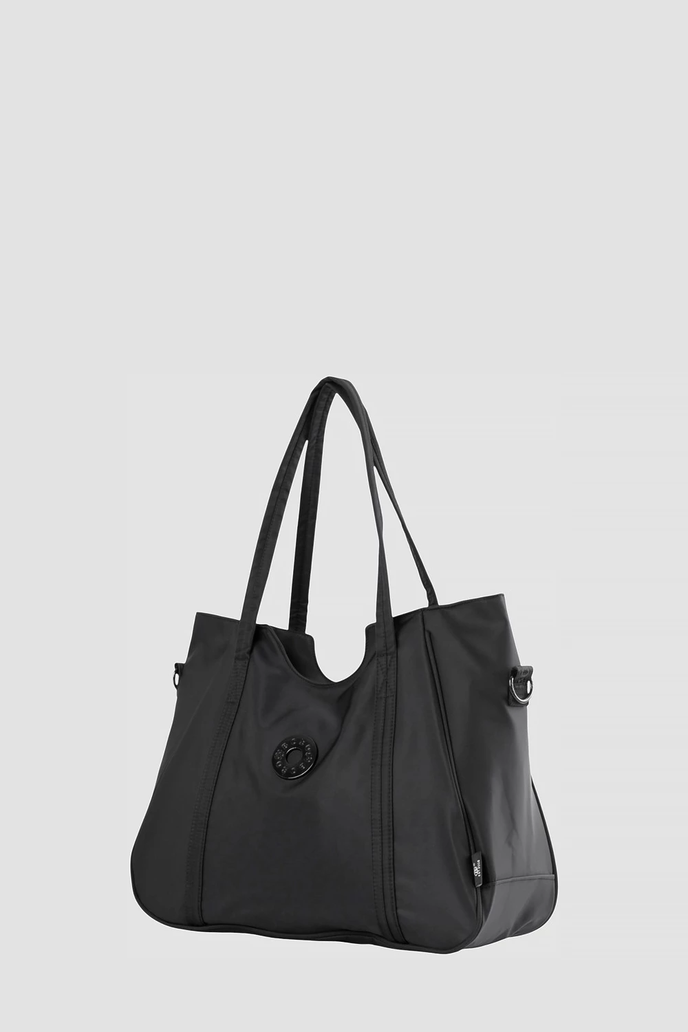 Женская текстильная сумка черного цвета. Одно основное отделение на молнии, дополнительно два закрытых и два открытых внутренних кармана. Наружный карман для мелочей. Комплектуется съемным текстильным ремнём.● текстильный подклад
