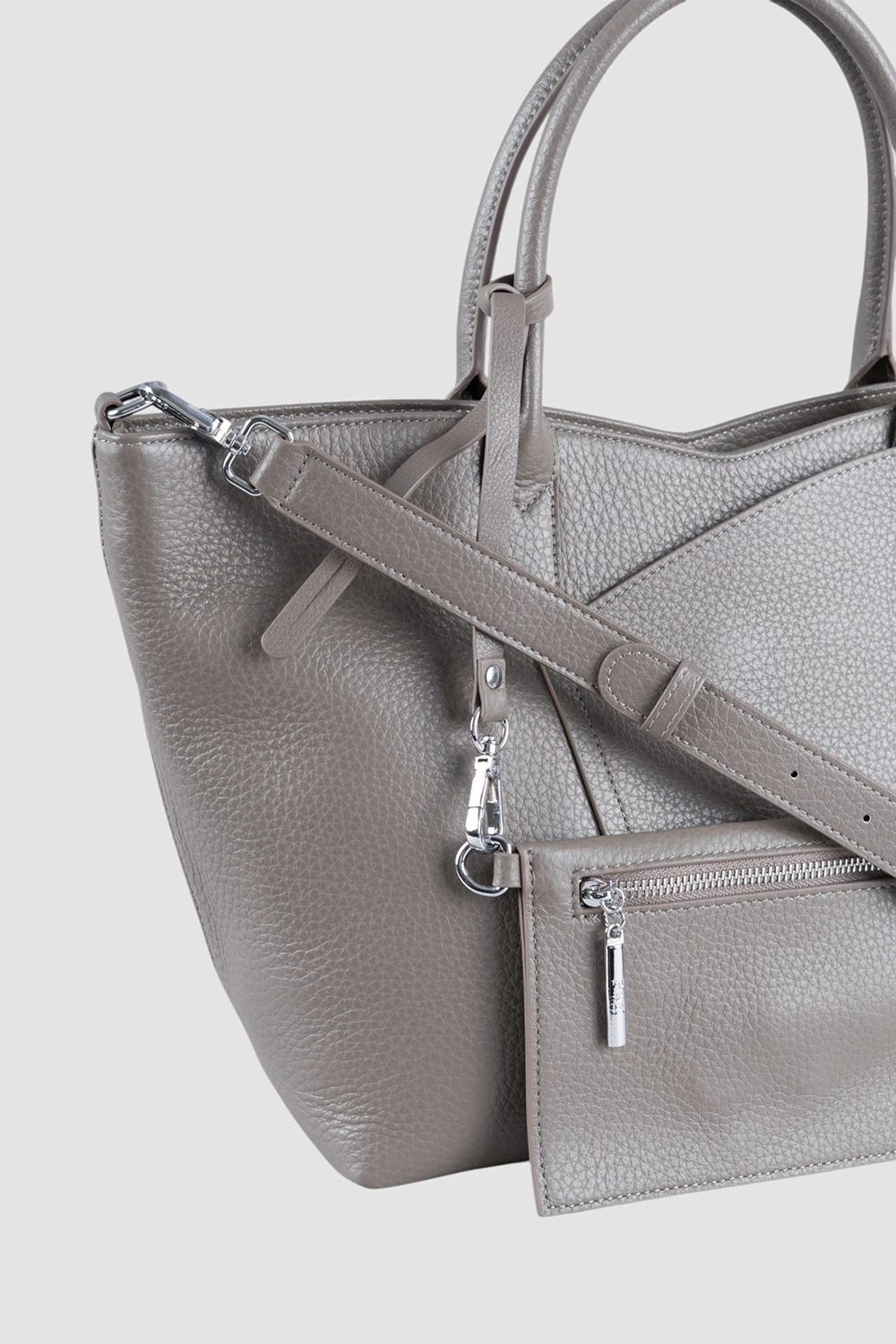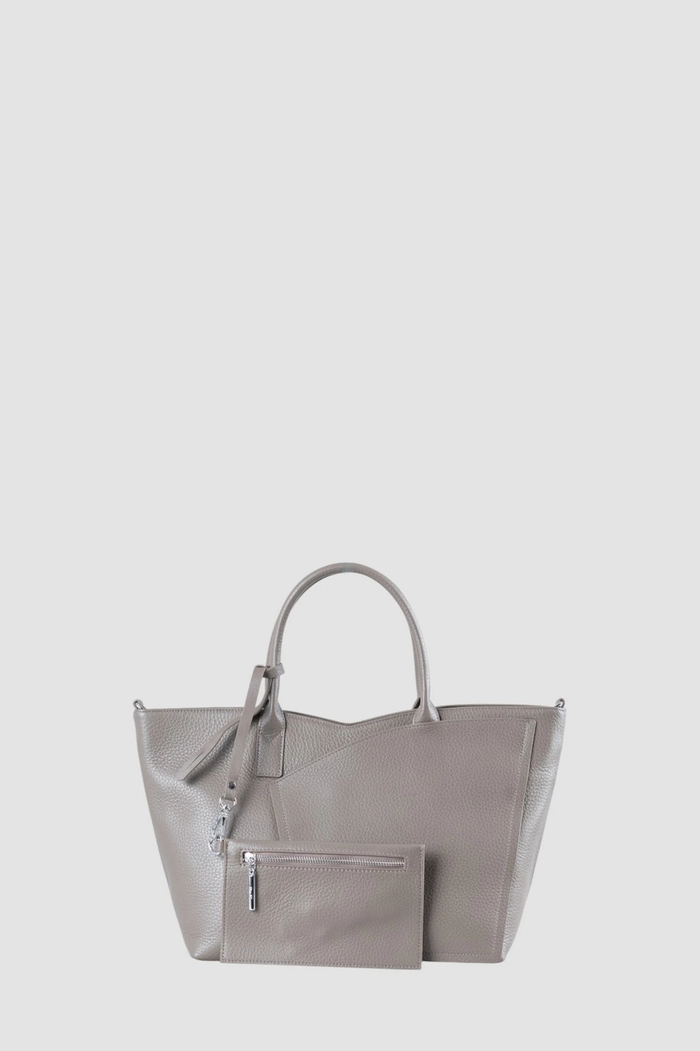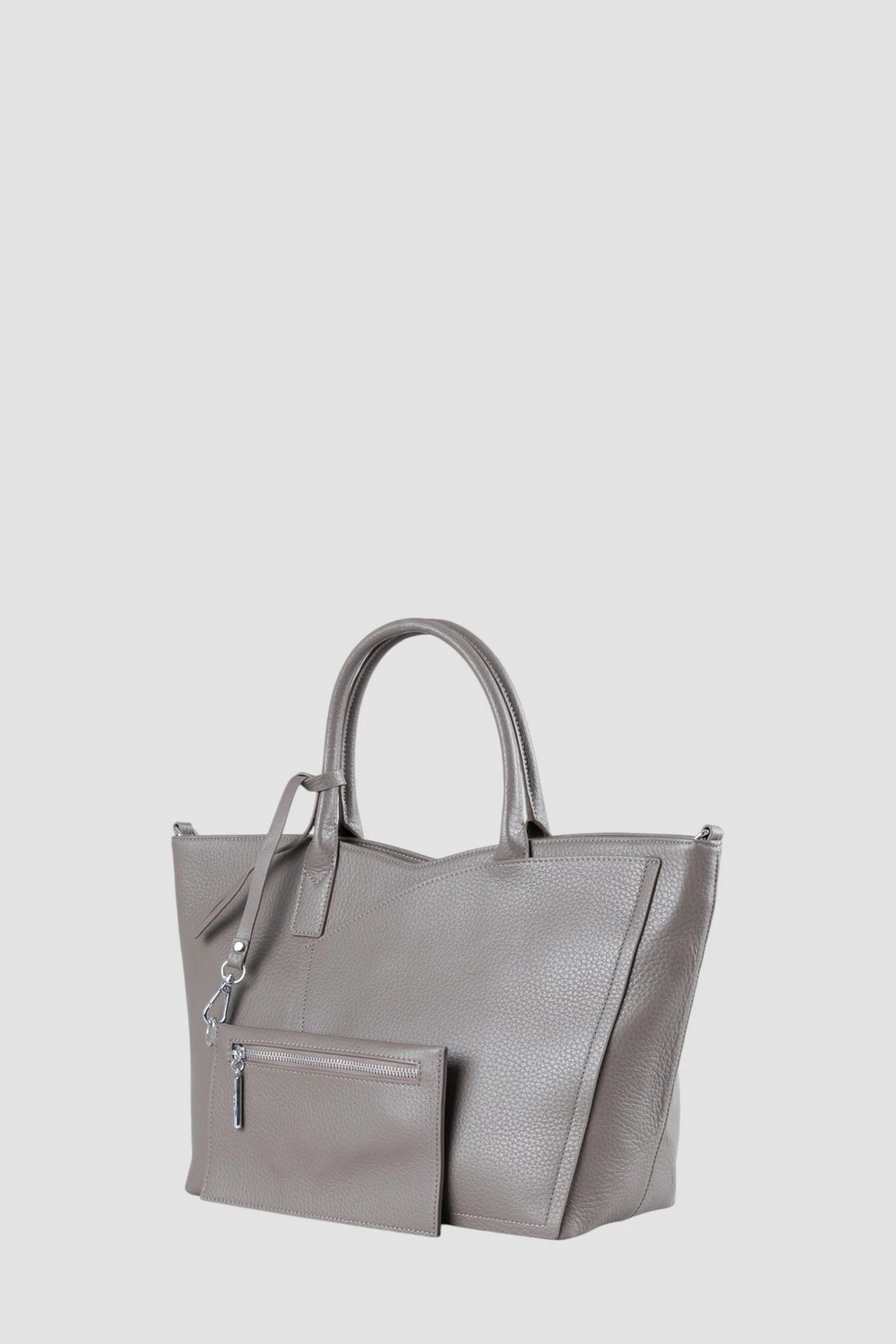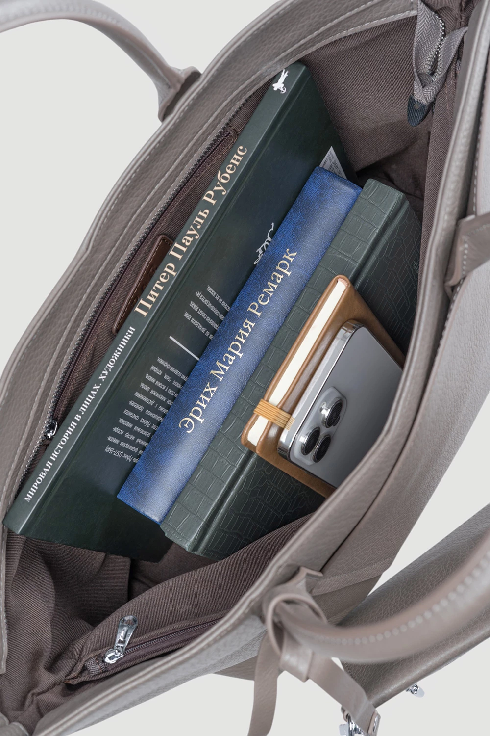 Женская сумка-тоут в бежевом оттенке. Она изготовлена из натуральной мягкой кожи, что обеспечивает ей долговечность и элегантность. В комплекте с этой сумочкой идёт небольшой футляр-клатч для различных мелочей. Сумка имеет вместительный внутренний объём, что делает её практичной для повседневного использования.● футляр-клатч в комплекте для мелочей