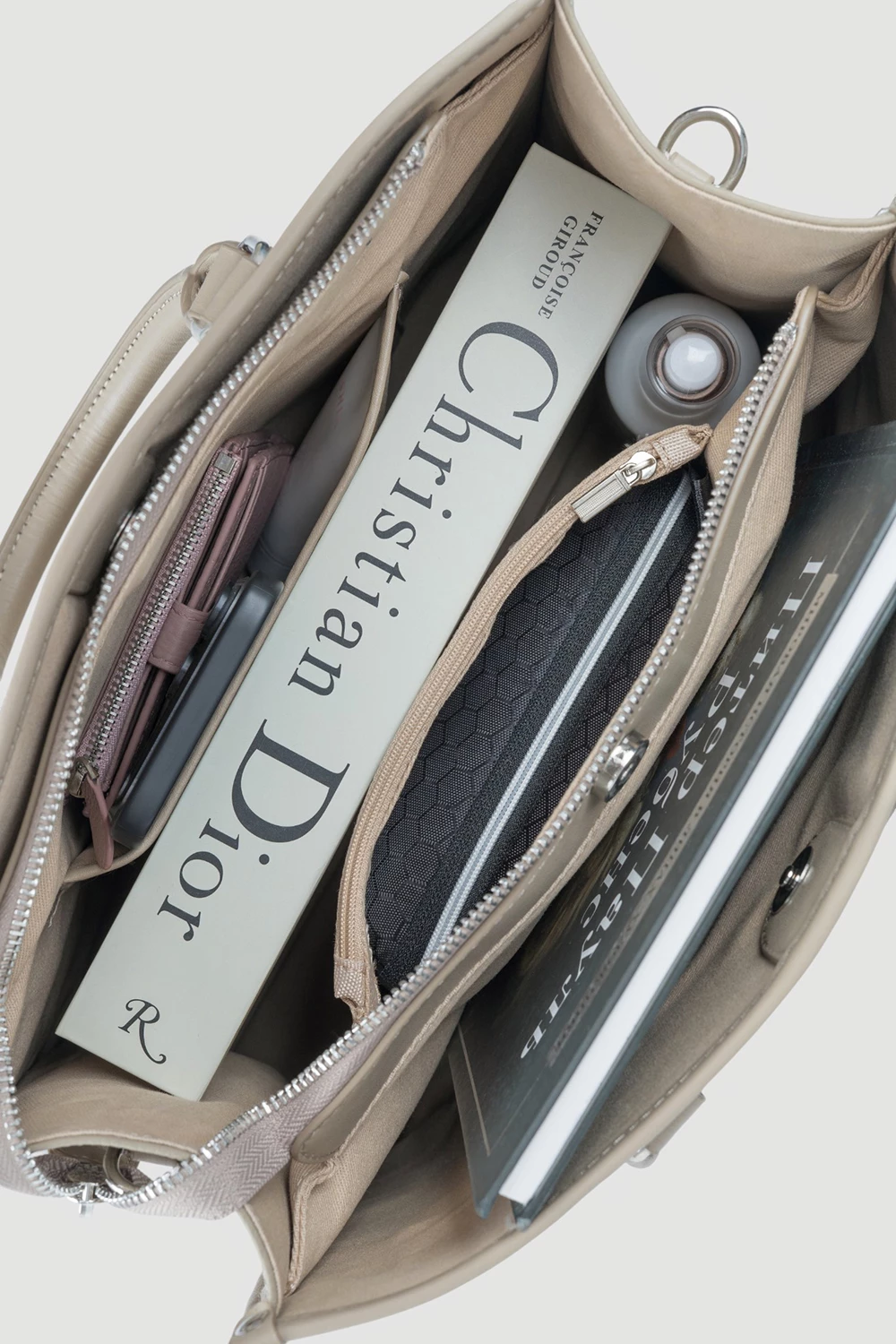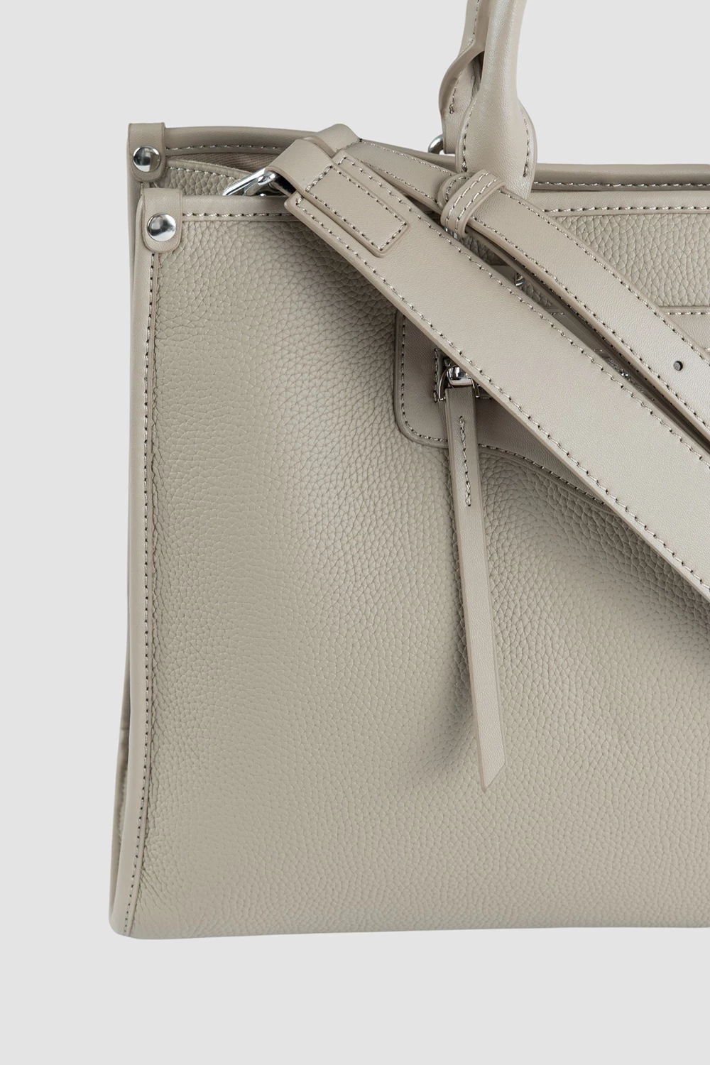 Бежевая сумка-тоут подарит ощущение комфорта и стиля одновременно. Внешний карман на молнии облегчит доступ к мелочам. Сумка делится на три секции, одна из которых закрыта молниями, а внутри расположены два открытых кармана и одно отделение на молнии. Комплектуется двумя ремнями - широким и узким длинным.● текстильный подклад