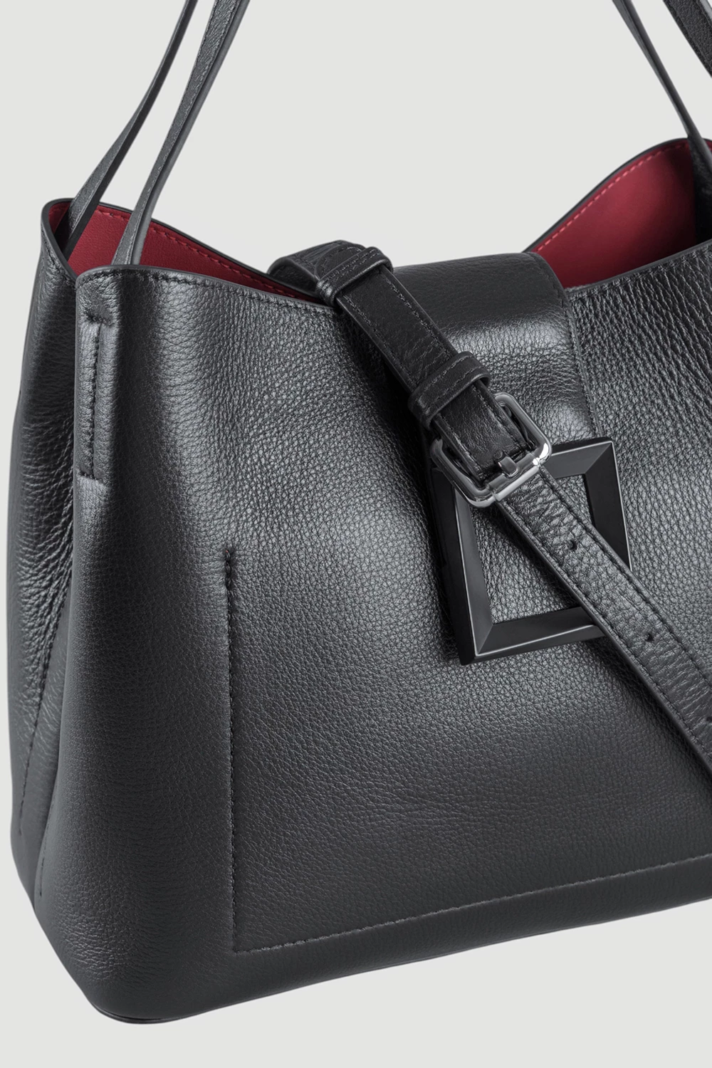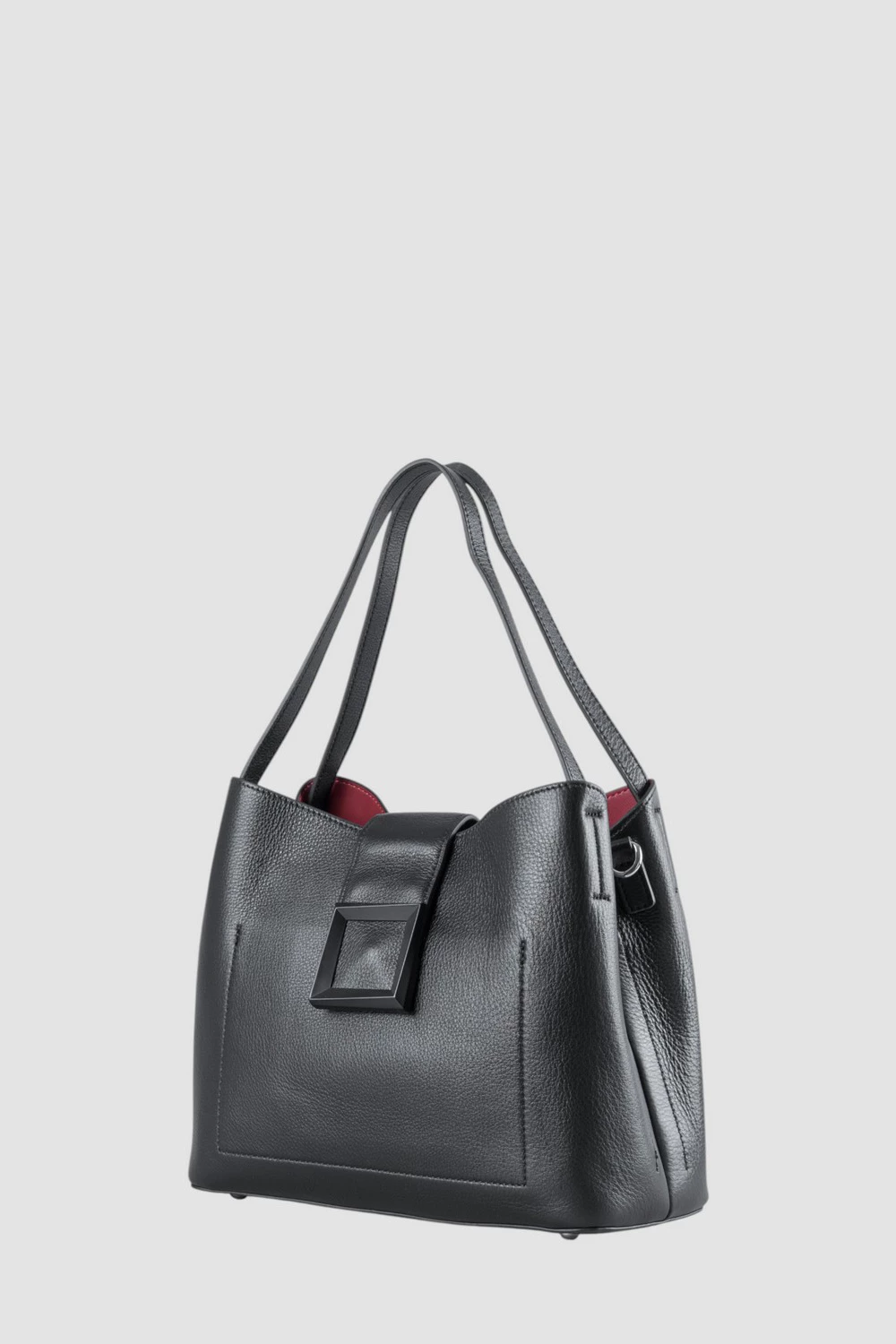 Классическая и универсальная сумка тоут черного цвета из натуральной кожи подчеркнет изысканный вкус и чувство стиля. Просторная внутренняя конструкция включает три отдельных отсека, центральный из которых оснащен надежной застежкой-молнией. Красная подкладка дополняется карманом на молнии. Сумка оснащена комфортным регулируемым ремешком.● магнитная застежка