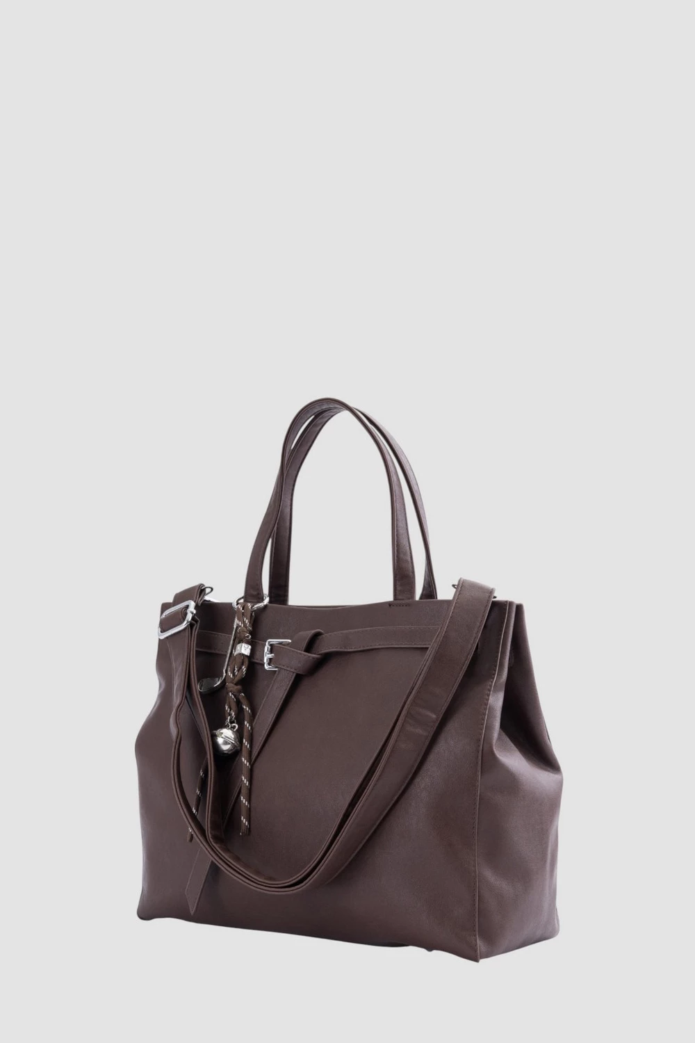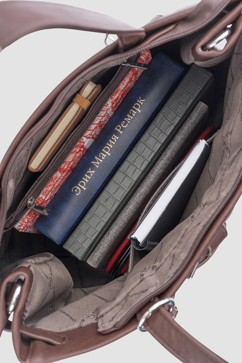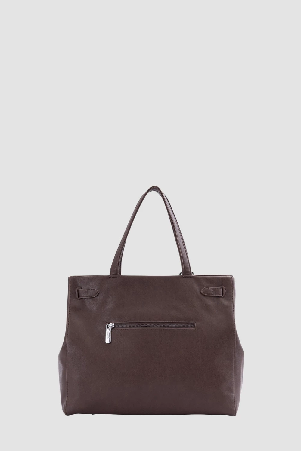 Коричневая сумка-тоут изготовлена из эко-кожи. Основной отсек надежно защищён прочной молнией. Организация внутреннего пространства представлена средним карманом на застёжке-молнии и двумя небольшими отделениями: открытым и закрытым на замок.Для дополнительной безопасности предусмотрен секретный карман на задней стороне изделия. Благодаря регулируемому плечевому ремню, эту модель комфортно носится. Такой функциональный аксессуар дополнит гардероб любителей городского стиля и деловых мероприятий.
