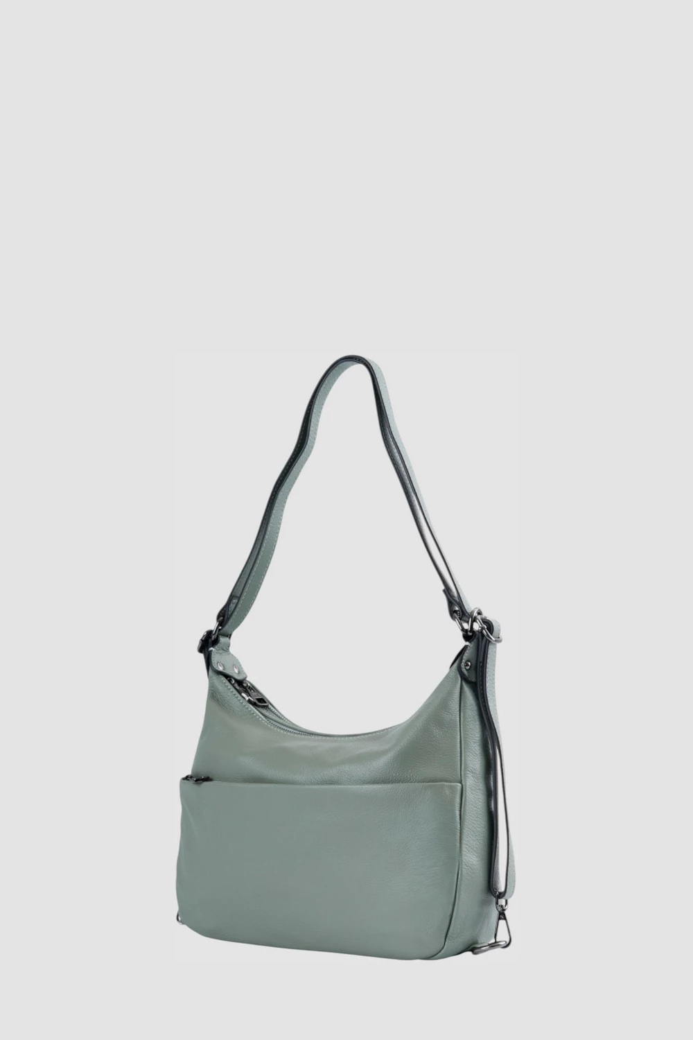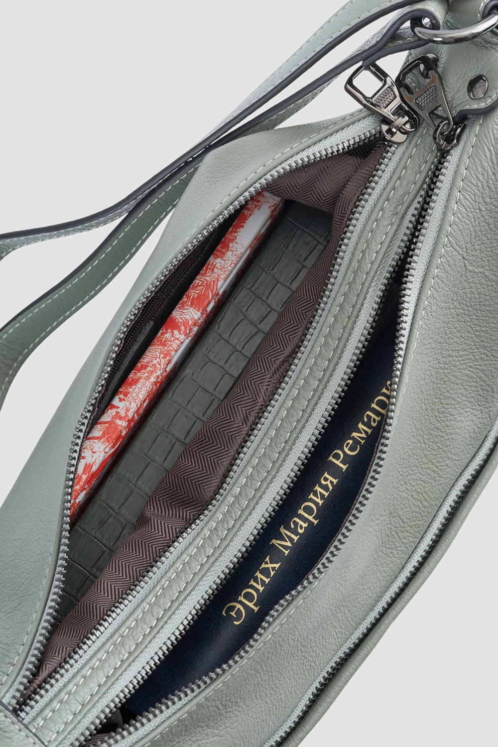 Зелёная сумка-трансформер с двумя отделами на молнии. Внутри предусмотрены два кармана: один закрытый на замок, другой открытый. Спереди расположен внешний карман, а сзади скрыт потайной на молнии для организации мелочей.● закрывается на молнию