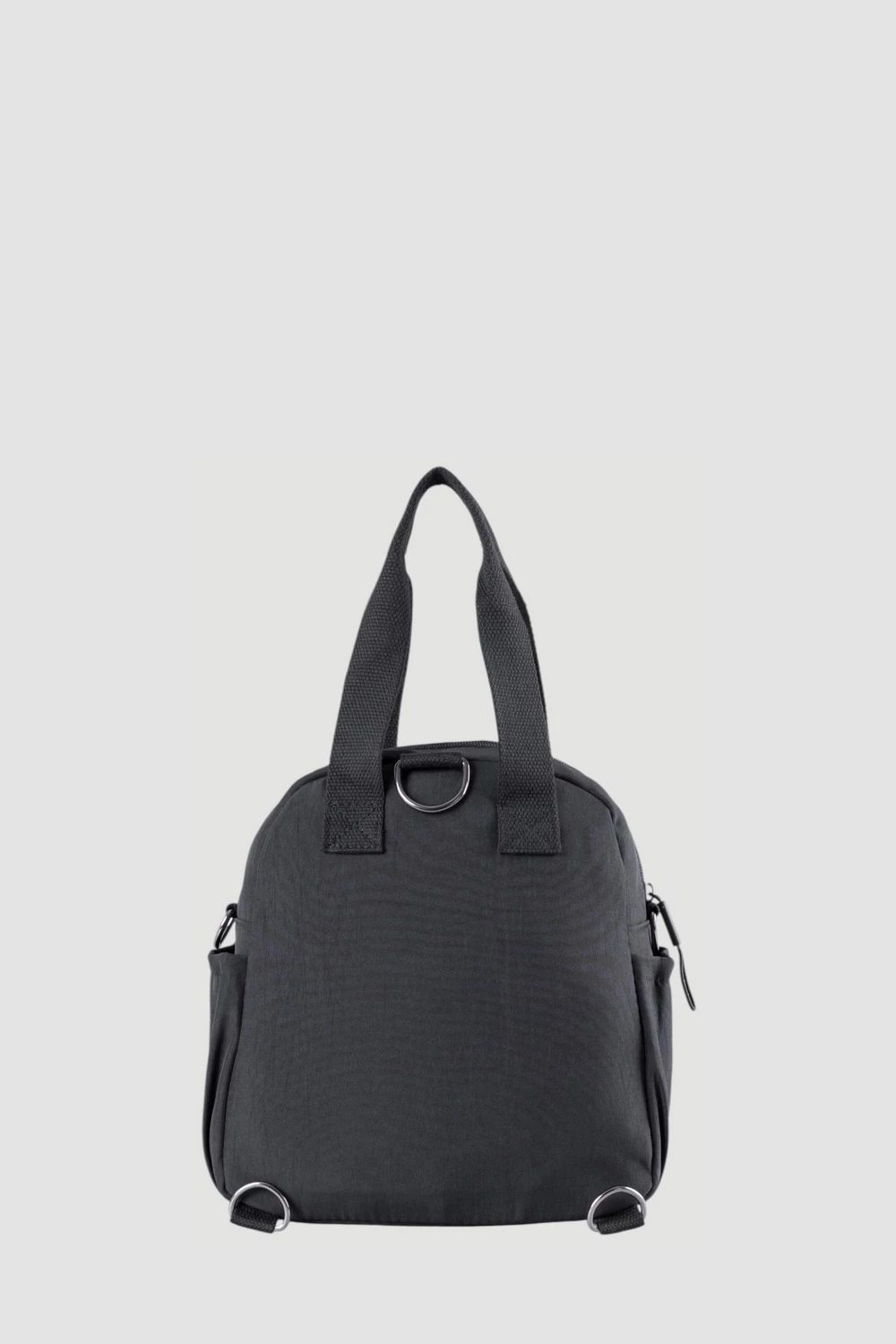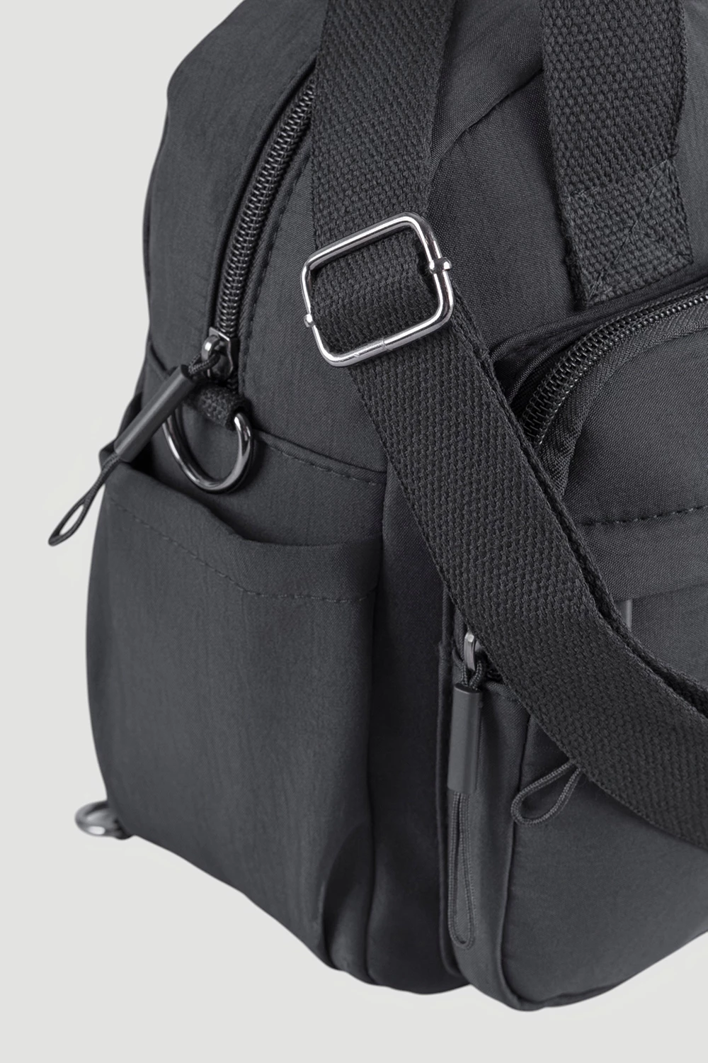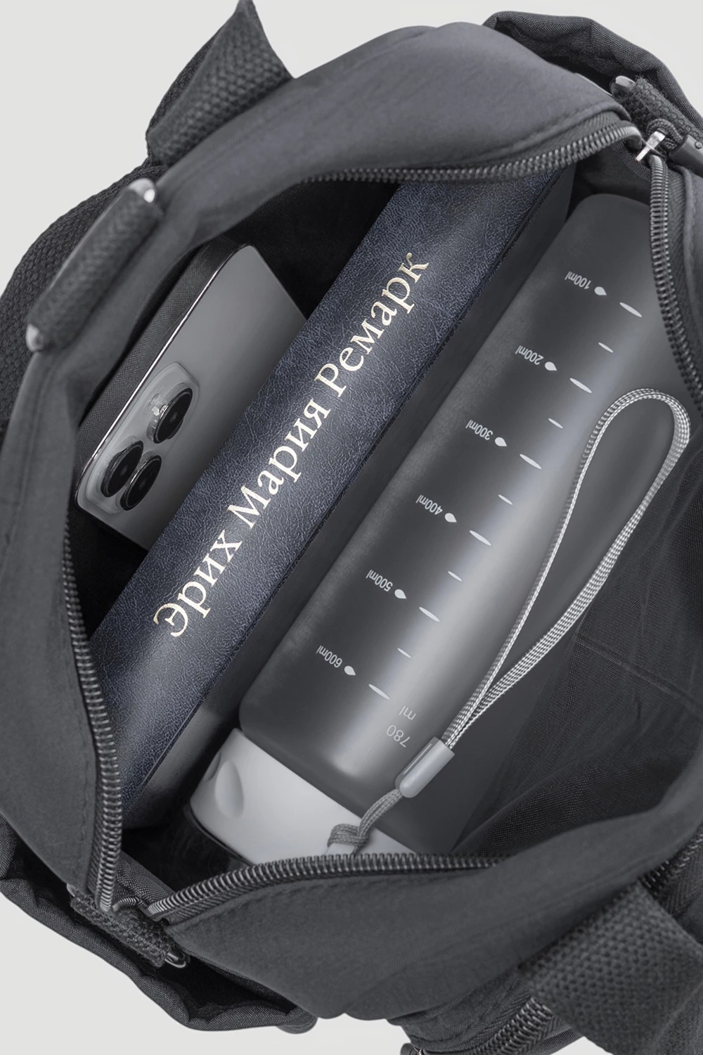 Чёрная сумка-трансформер. Стильная и функциональная чёрная текстильная сумка станет незаменимым аксессуаром на прогулке, в спортзале или в дальнем путешествии. Благодаря съёмному ремню и удобным ручкам, рюкзак легко адаптируется под любые ситуации: удобная хохяйственная сумочка или вместительный рюкзак. Изготовлена из прочного материала, обеспечивающего долговечность и надёжность. Можно носить в руке, через тело или как рюкзак.● регулируемый плечевой ремень