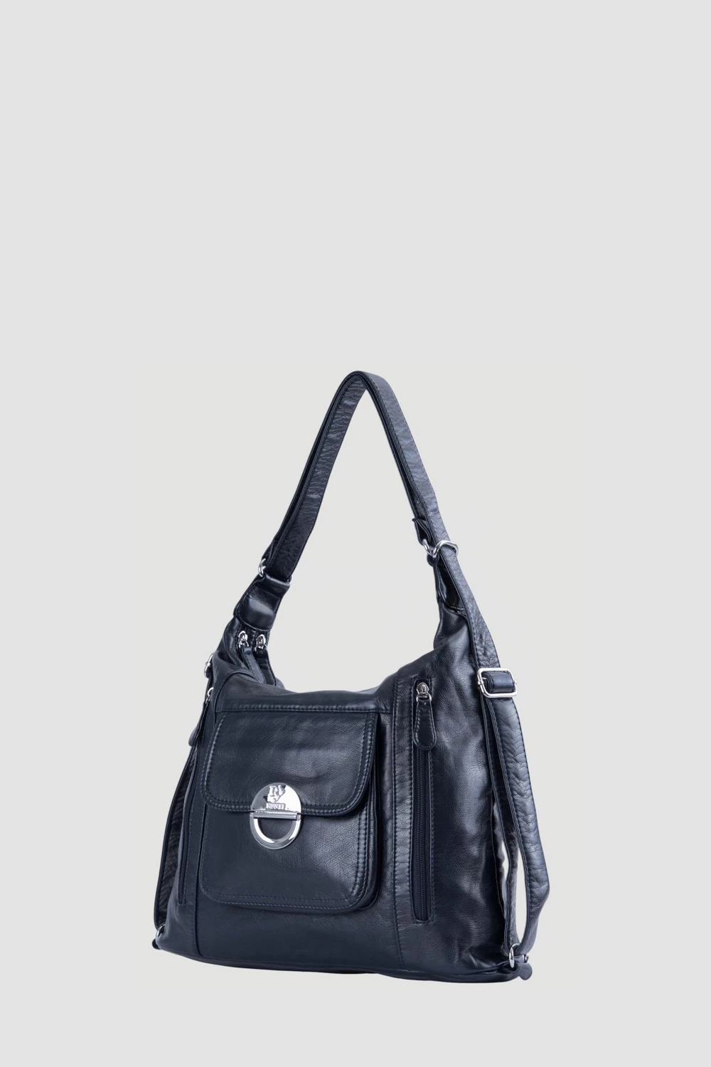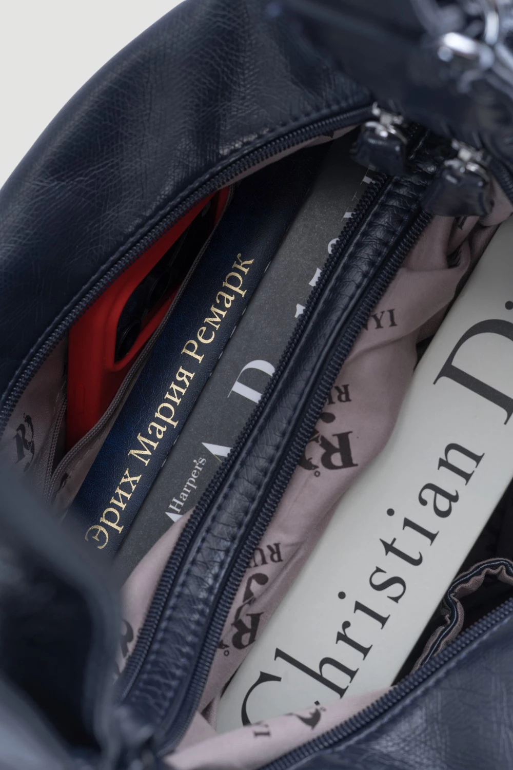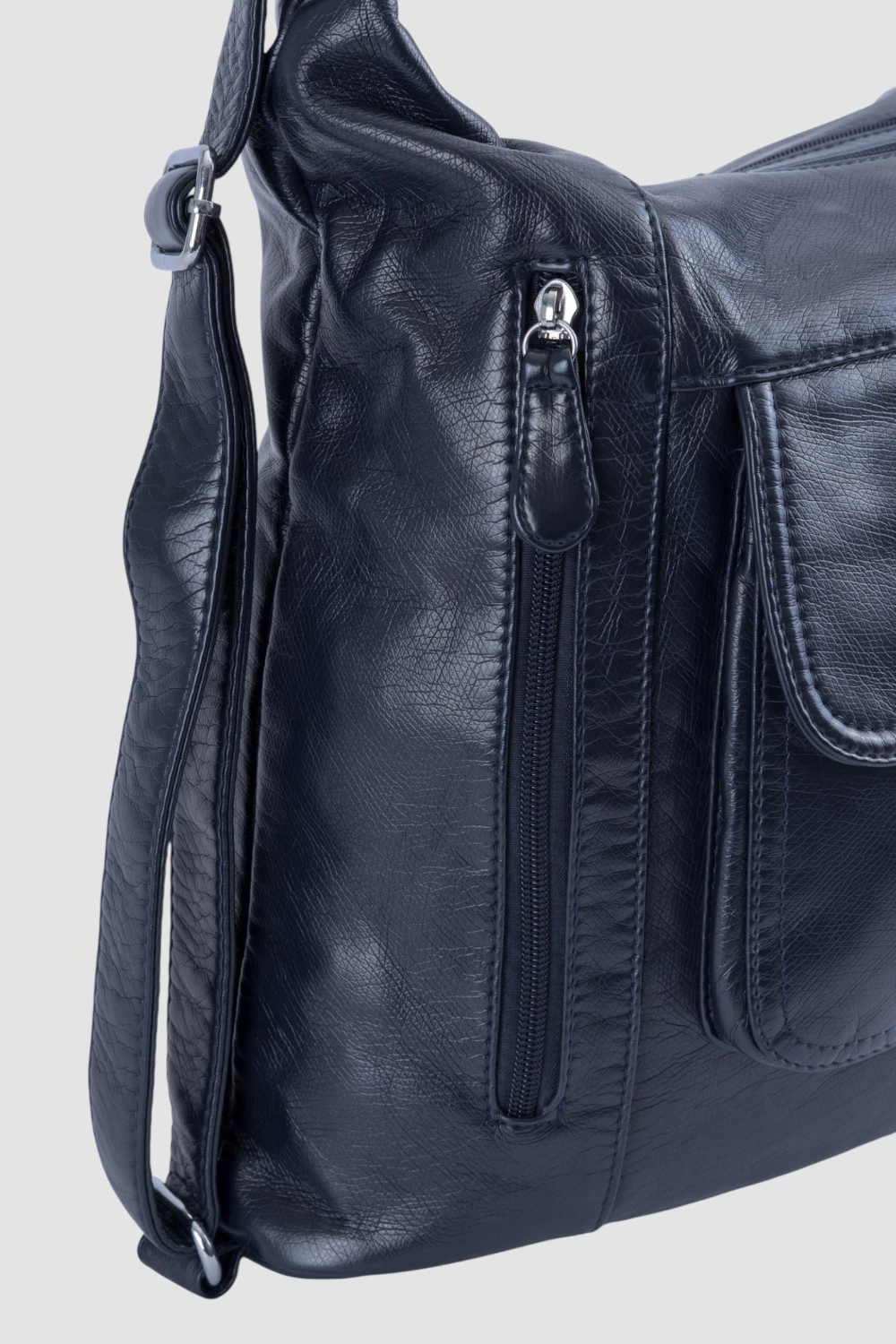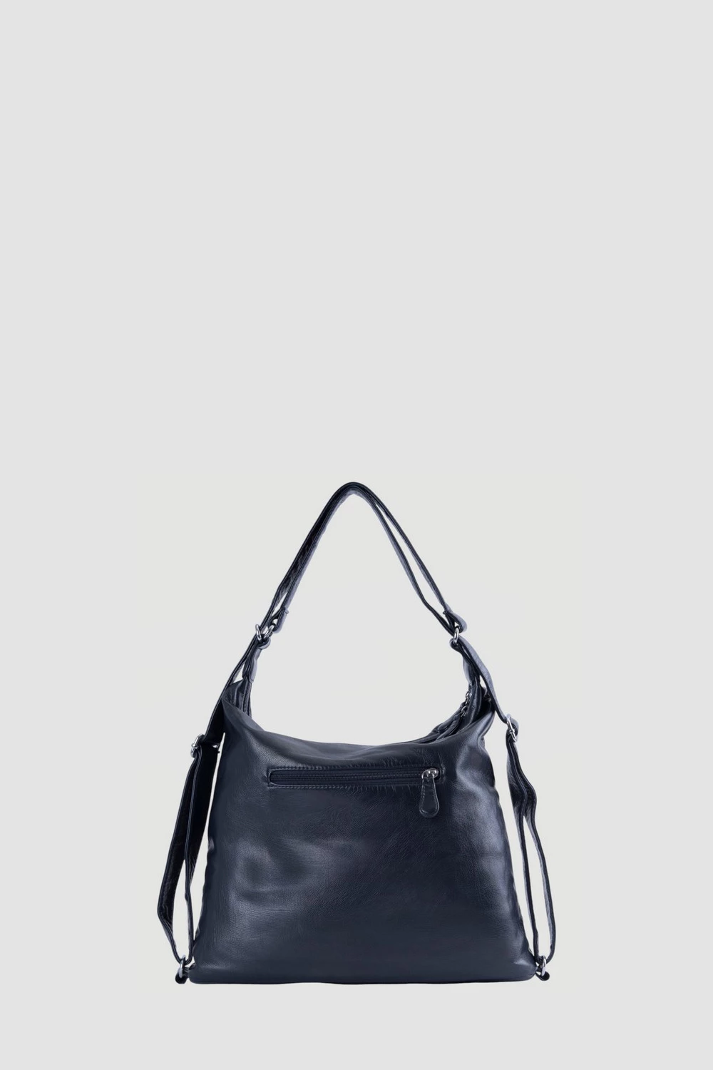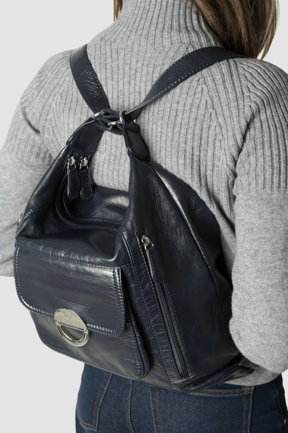 Темно-синяя сумка-рюкзак, оснащенная двумя большими отделениями на молниях. Во внутреннем пространстве каждого отделения предусмотрены два открытых кармана и один карман на молнии.Передняя часть рюкзака представлена двумя вместительными карманами на молниях и одним карманом на магнитной кнопке. Дополнительный карман на молнии расположен на задней поверхности для хранения мелочей.