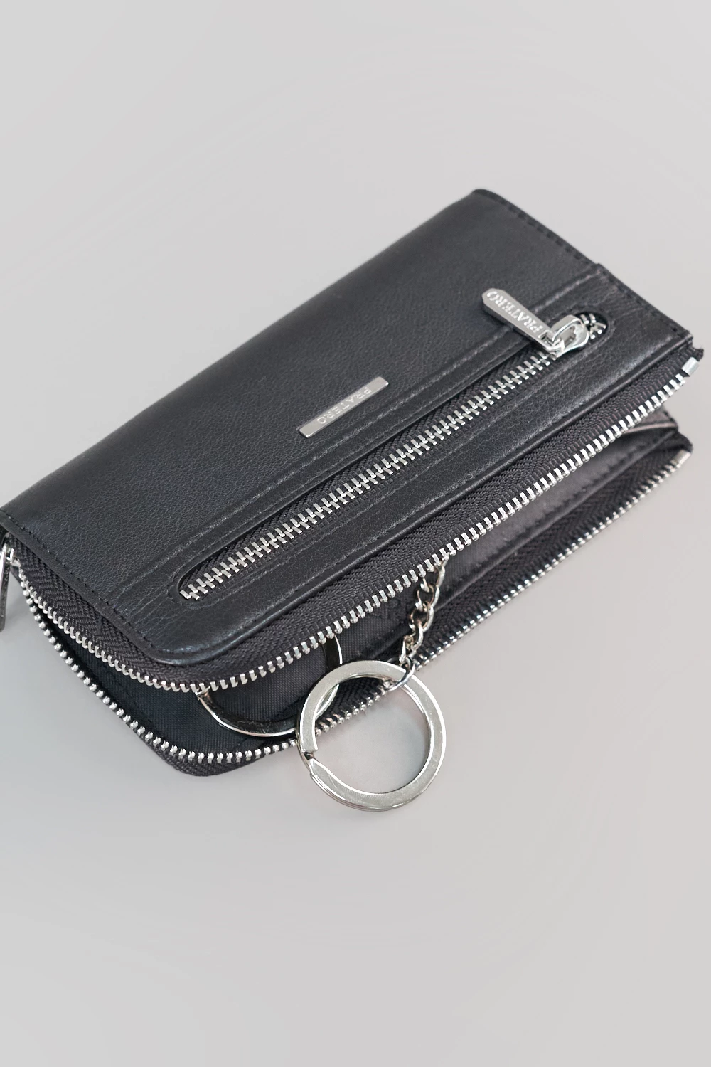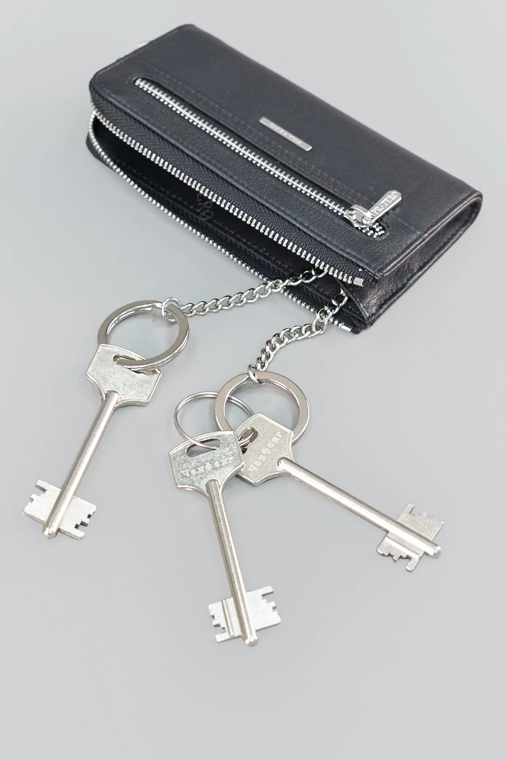 Черная мужская ключница с дополнительным наружным карманом для организации мелочей. Внутри два надежных кольца на цепочке для крепления ключей. Материал - натуральная кожа.