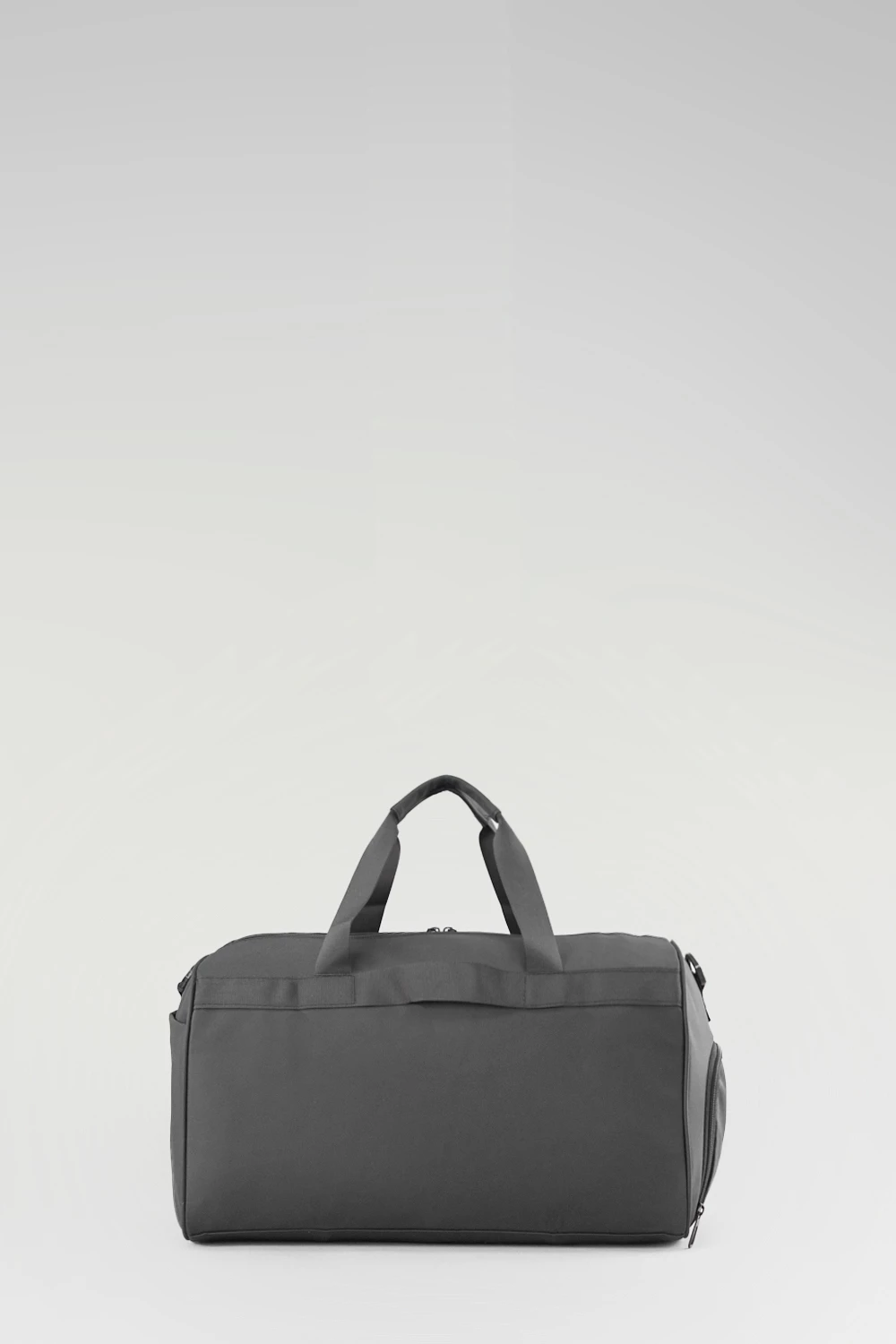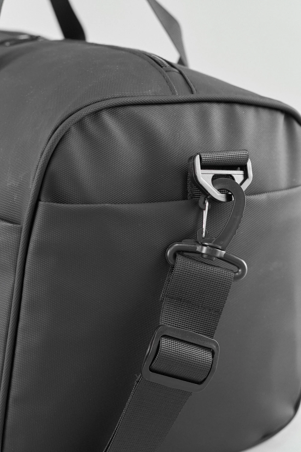 Дорожная сумка чёрного цвета вместительна и функциональна. Одно отделение дополнено внутренним карманом на молнии. Снаружи расположены два кармана: закрытый на молнию и открытый. Есть отдельный отсек для обуви сбоку. Сумка оснащена регулируемым текстильным ремнём.Размер