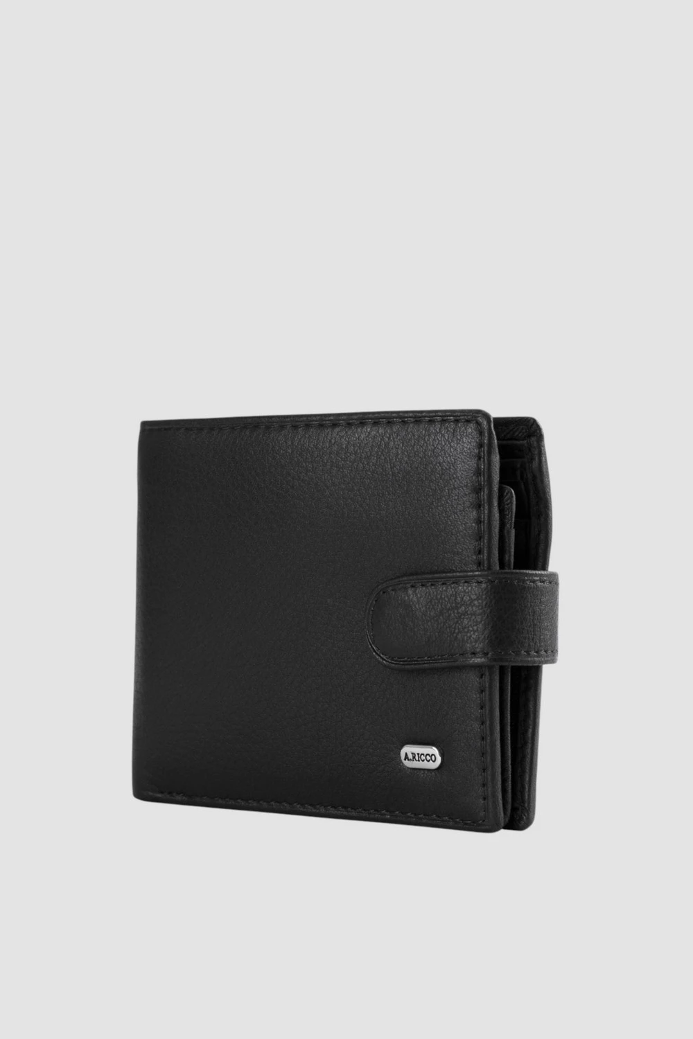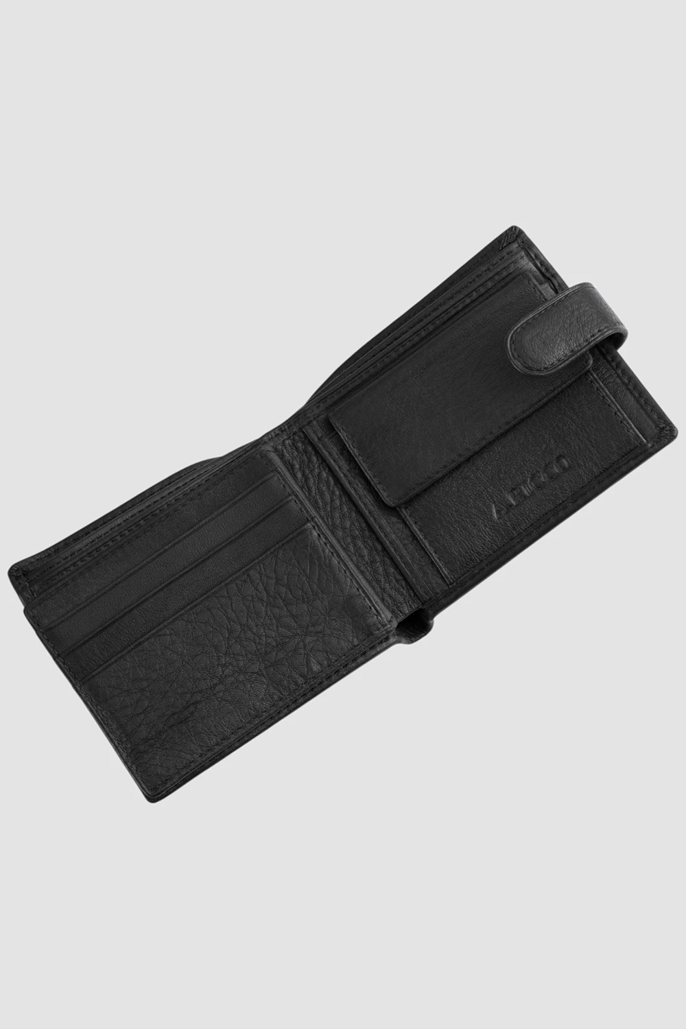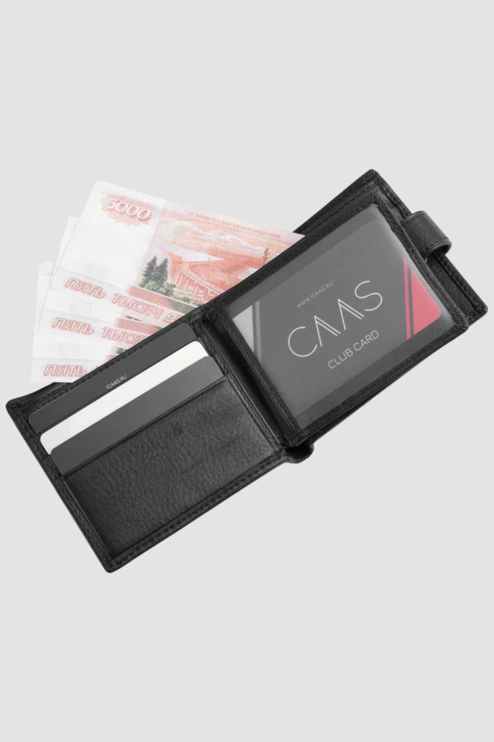 Мужской бифолд черного цвета на кнопке: два купюрника, кармашки для карт, магнитная монетница, потайной застегивающийся карман.