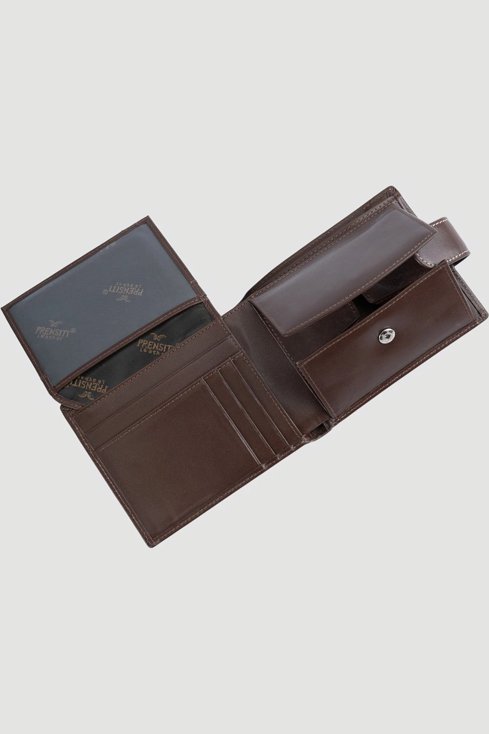 Коричневый мужской кошелек с двумя отделениями для купюр, потайным карманом на молнии, отделом для карт и удобной монетницей на кнопке. Стильно, функционально и надежно.