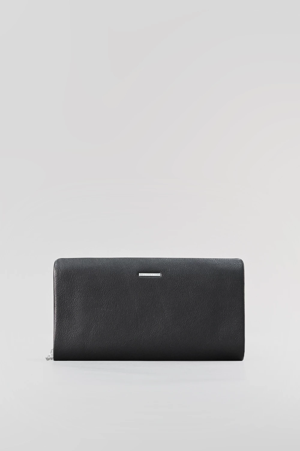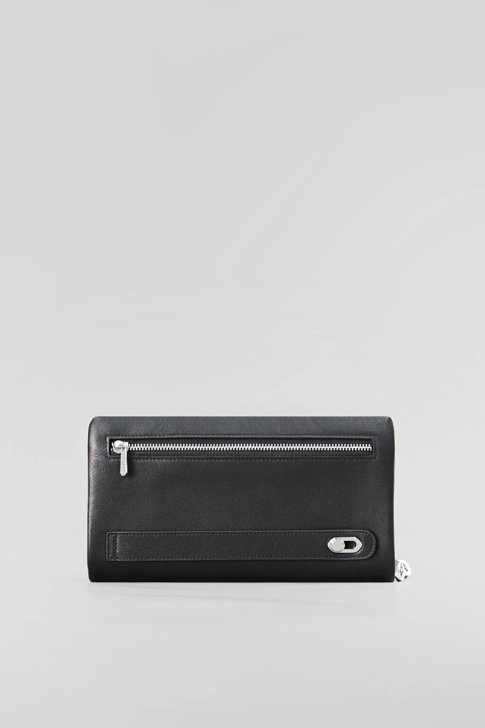 Мужской клатч черного цвета из натуральной кожи с двумя отделами на молнии. Один отдел оснащен специальным отделением для карт, также имеется дополнительный наружный карман на молнии. Комплектуется ремешком-хлястиком для надежной фиксации на руке.