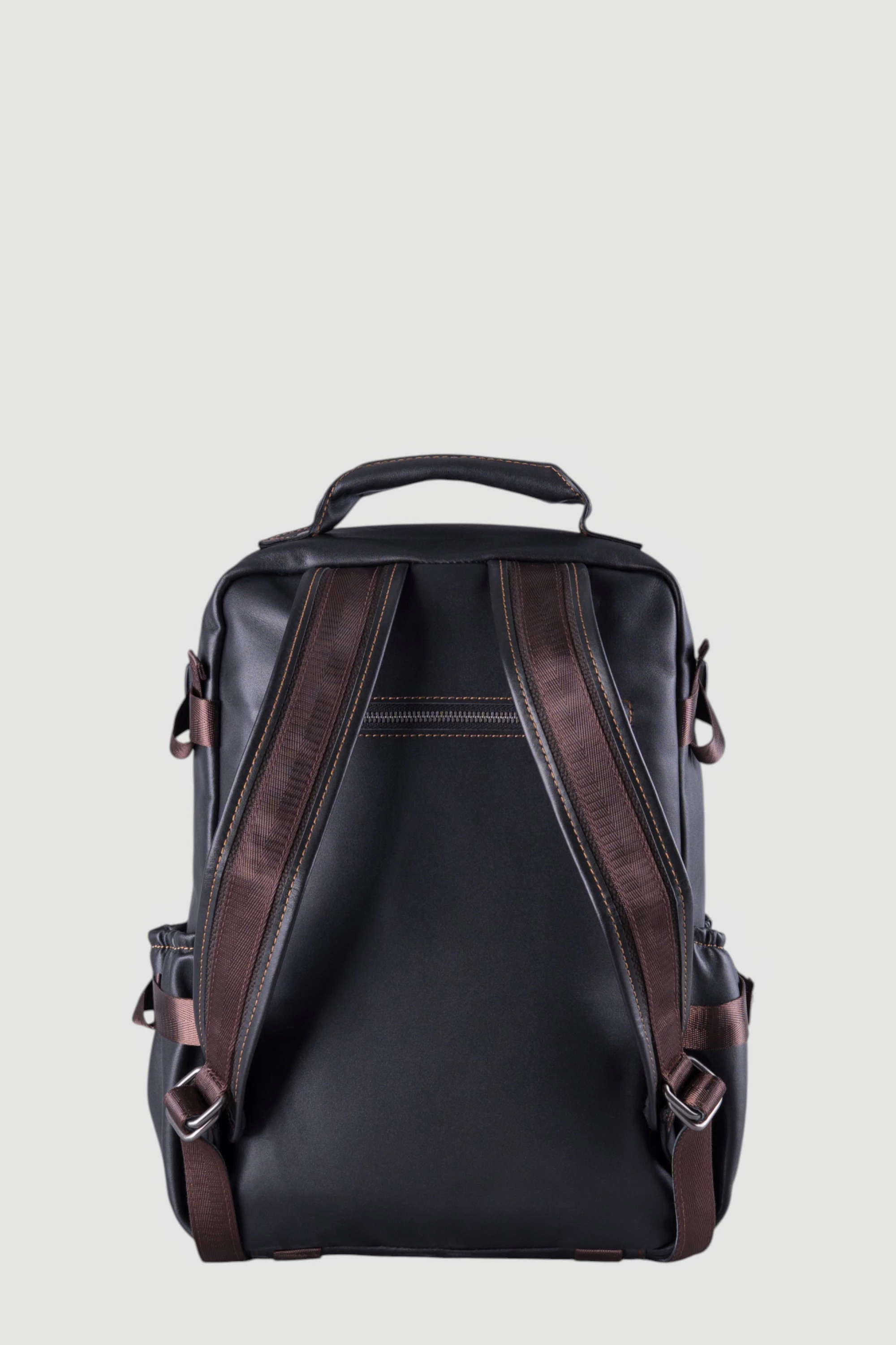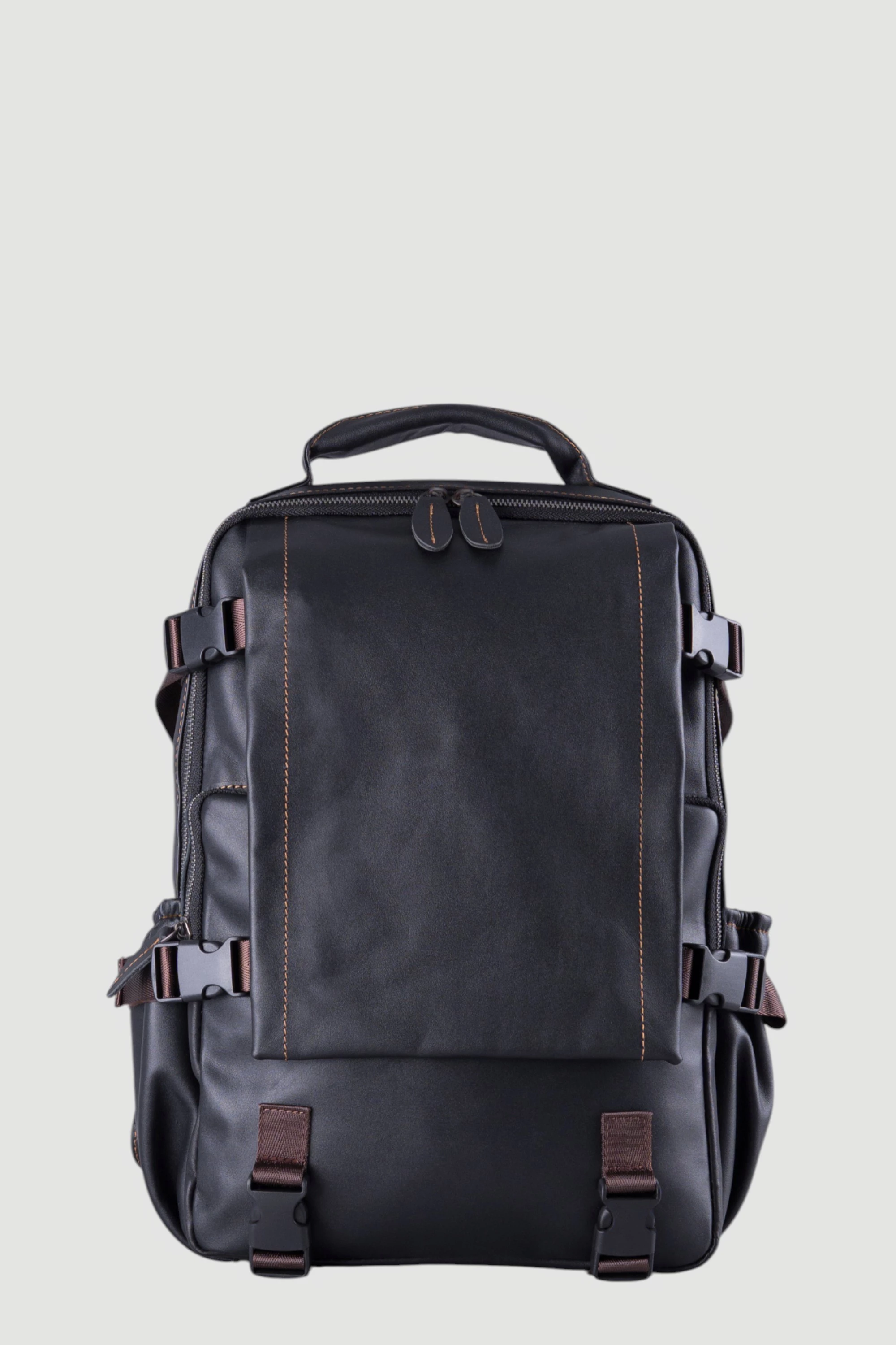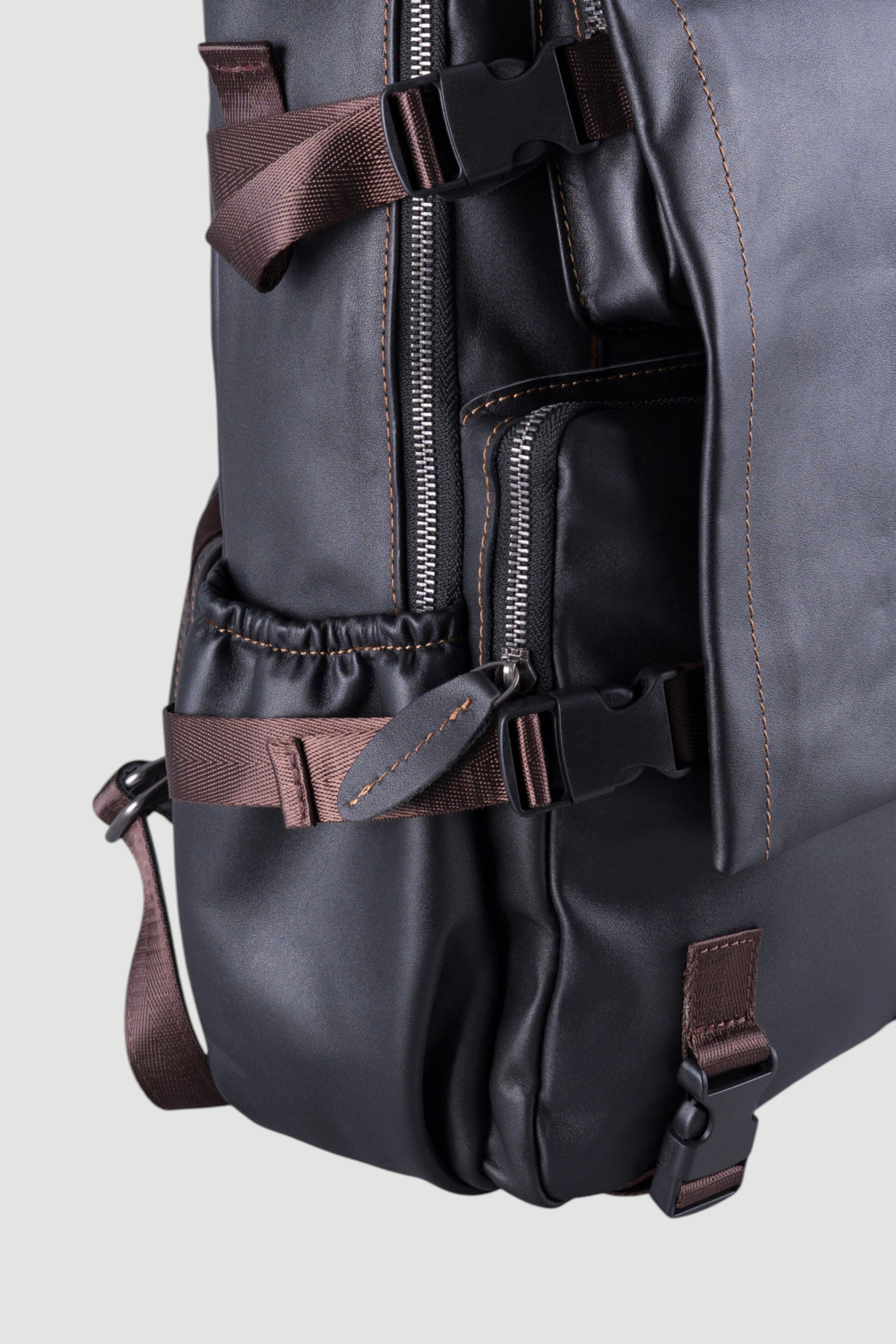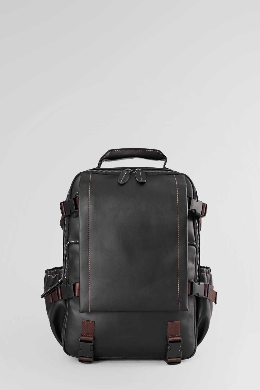 Мужской кожаный рюкзак чёрного цвета. Одно просторное отделение на молнии. Наружу выходят три застёгивающихся кармашка и два открытых боковых для доступа к мелочам. Идеален для городского стиля и поездок.● внешние карманы на замке для мелочей