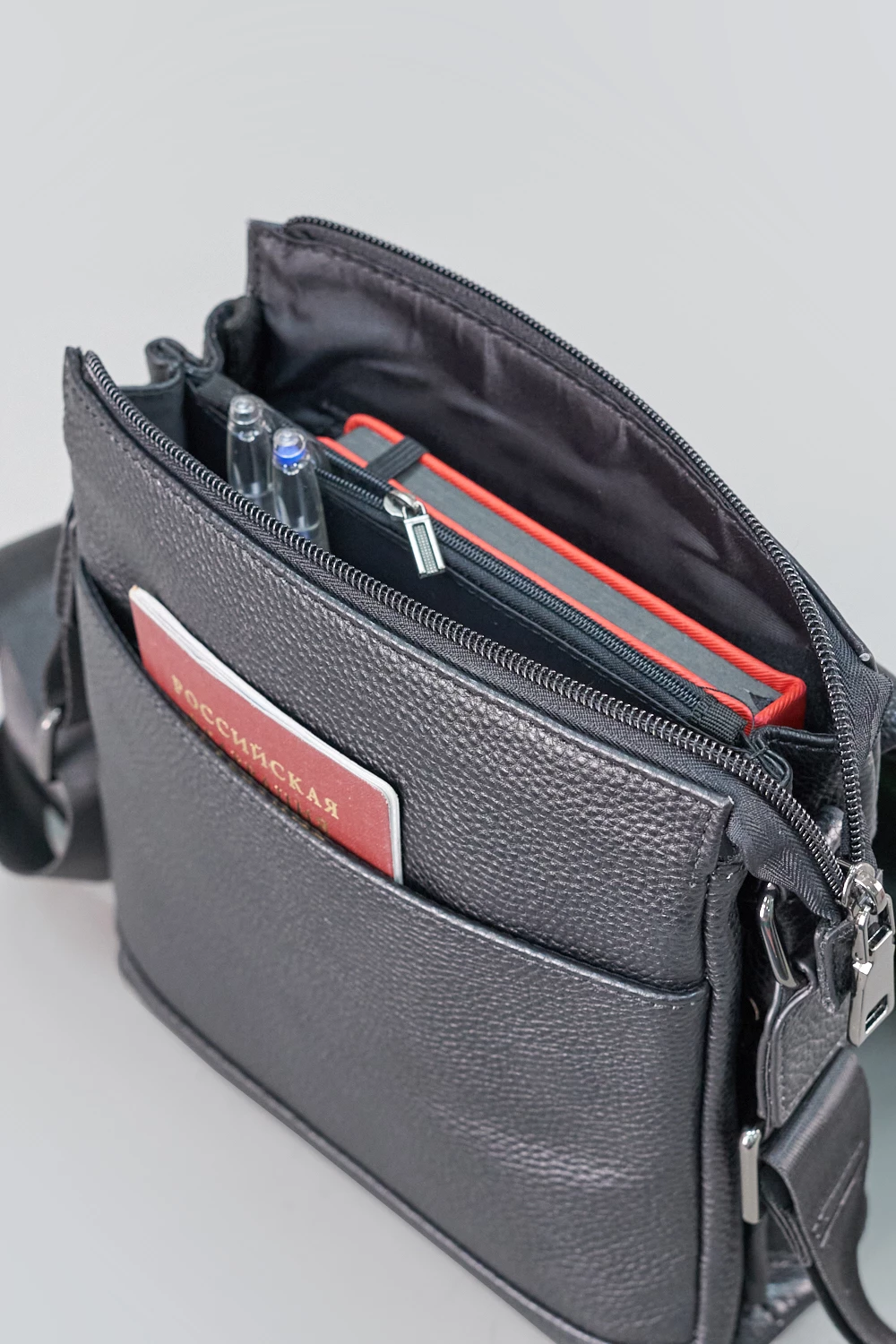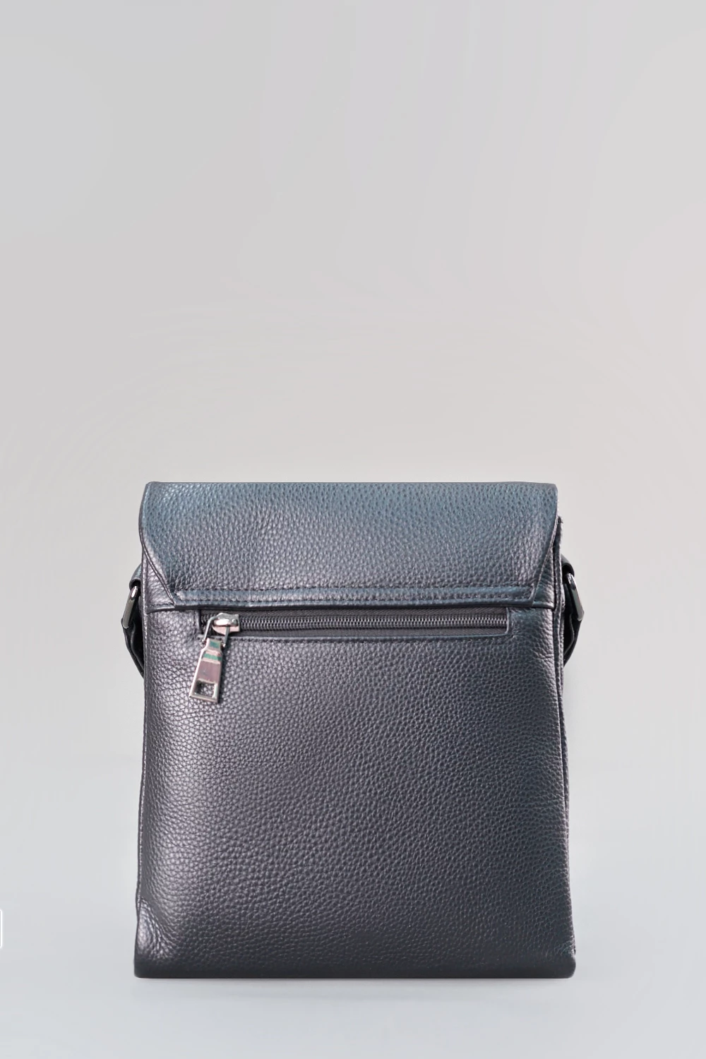Мужская сумка через плечо черного цвета. Компактная и функциональная сумка с клапаном на магните, под которым размещен открытый карман. Внутри предусмотрено отделения на молнии, а также дополнительные открытый карман и карманы на молниях.Один внешний карман на молнии на задней стороне. Подходит для городской среды и небольших поездок.