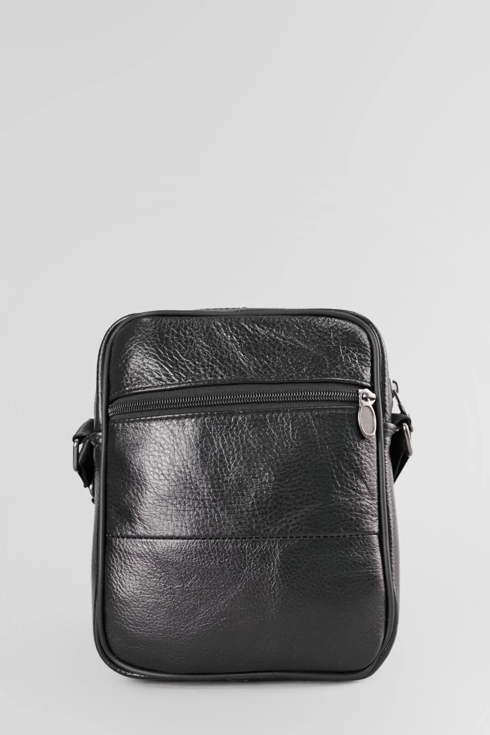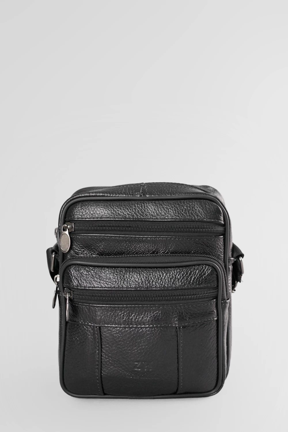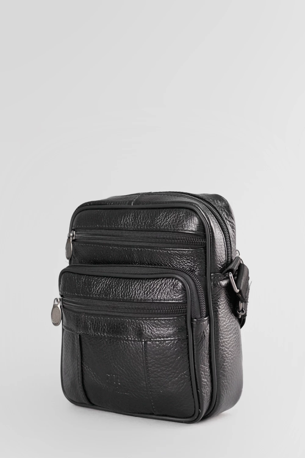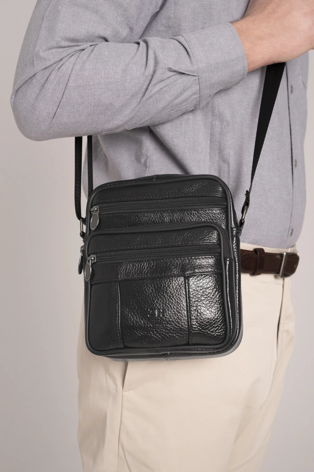 Мужская сумка через плечо из натуральной кожи чёрного цвета. Имеет два вместительных отделения на молниях и три внешних кармана.Практичная модель для ежедневного использования.● внешние карманы на замке для мелочей
