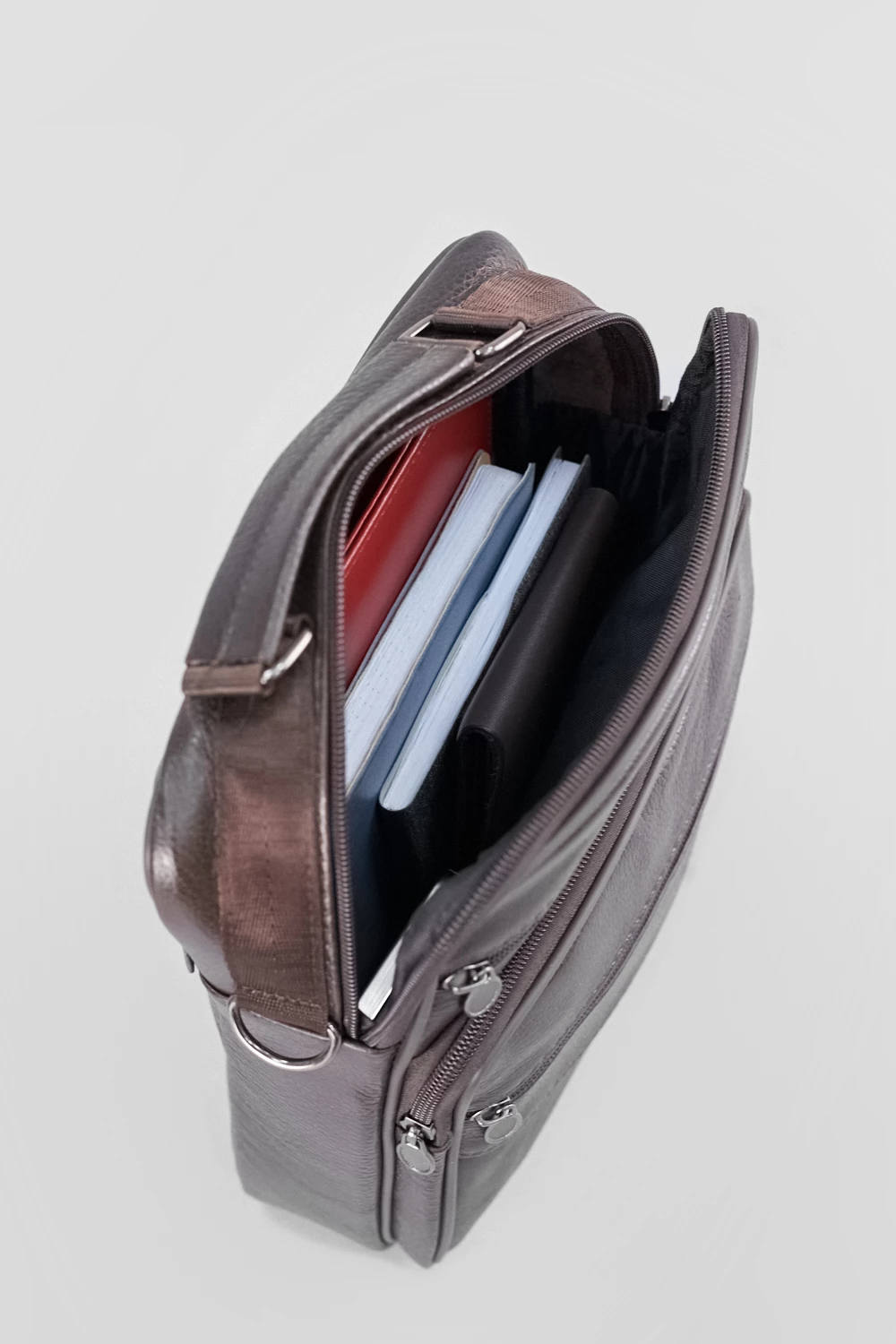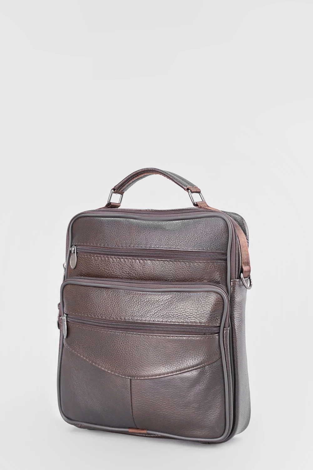 Мужская сумка через плечо из натуральной кожи коричневого цвета. Одно просторное отделение на молнии, четыре внешних кармана. Универсальная модель для городских прогулок и деловых встреч.● внешние карманы на замке для мелочей