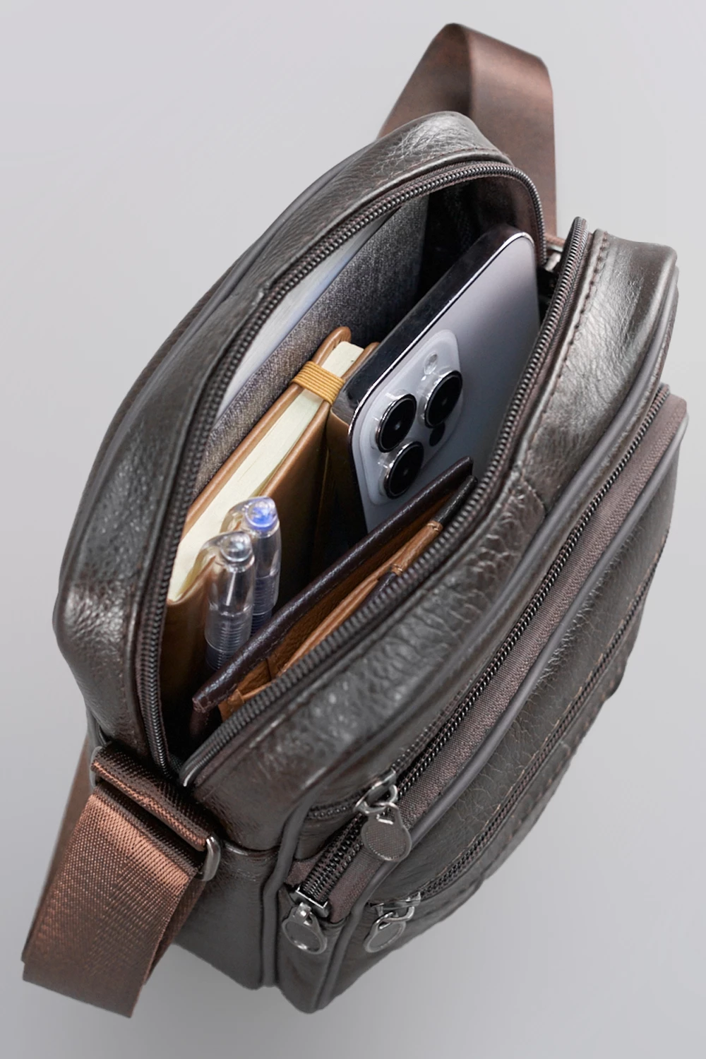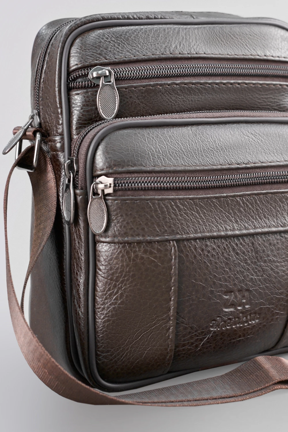 Мужская сумка через плечо из натуральной кожи коричневого цвета. Внутри два отделения на молниях, снаружи три кармана на молнии. Практичное решение для повседневной носки.● внешние карманы на замке для мелочей