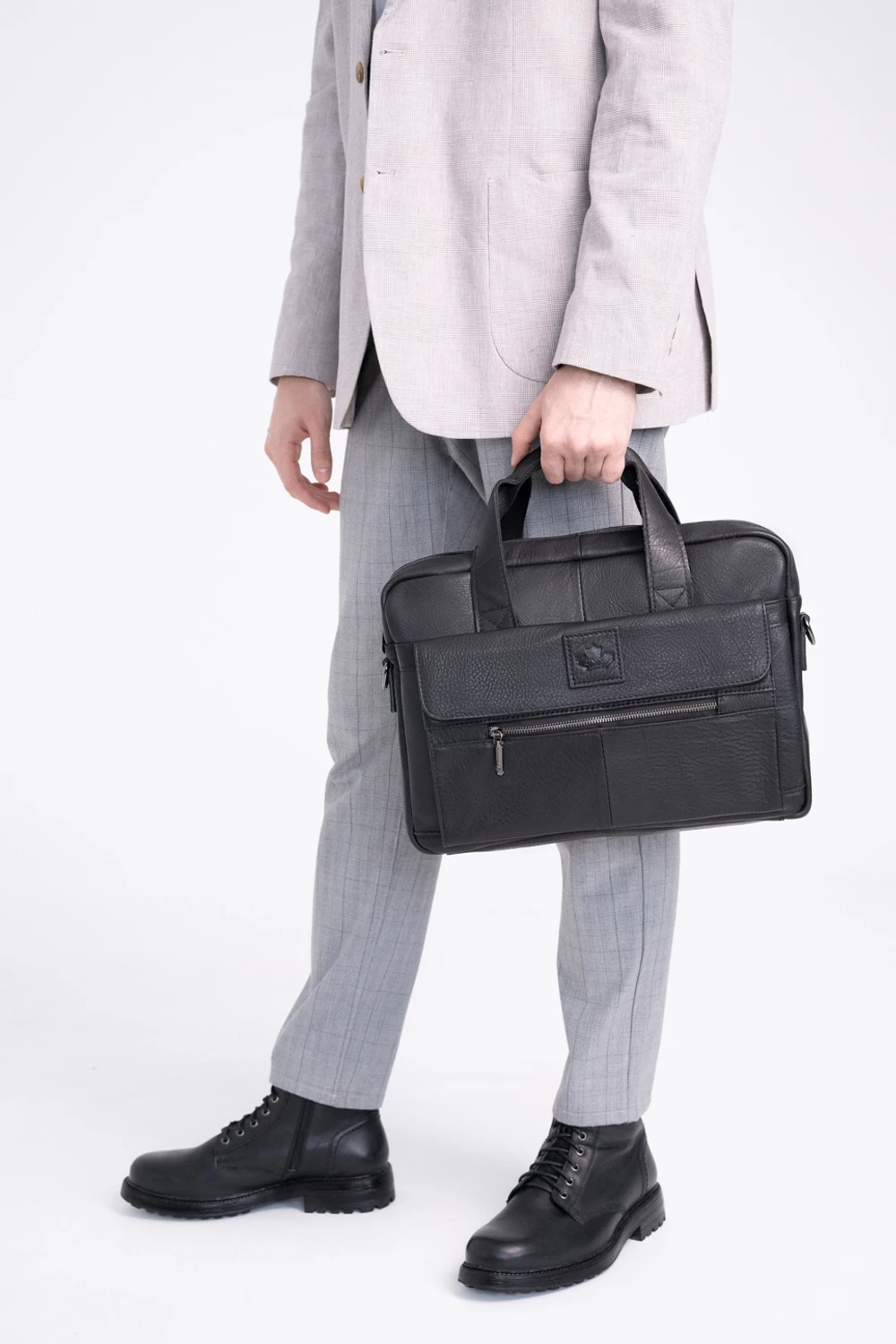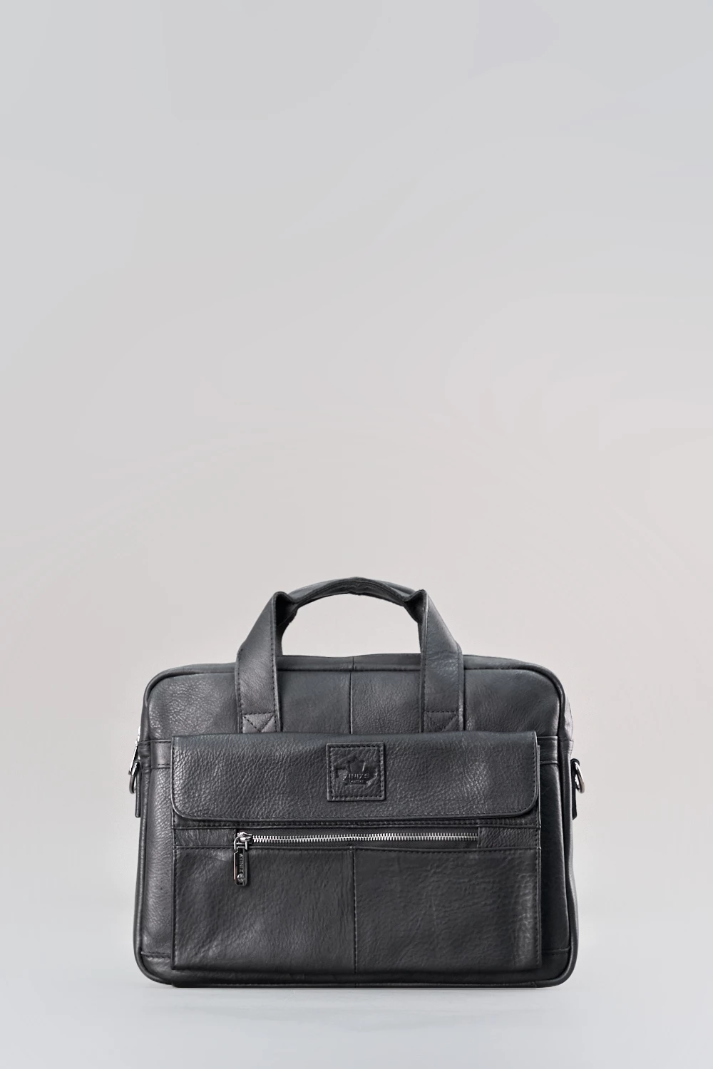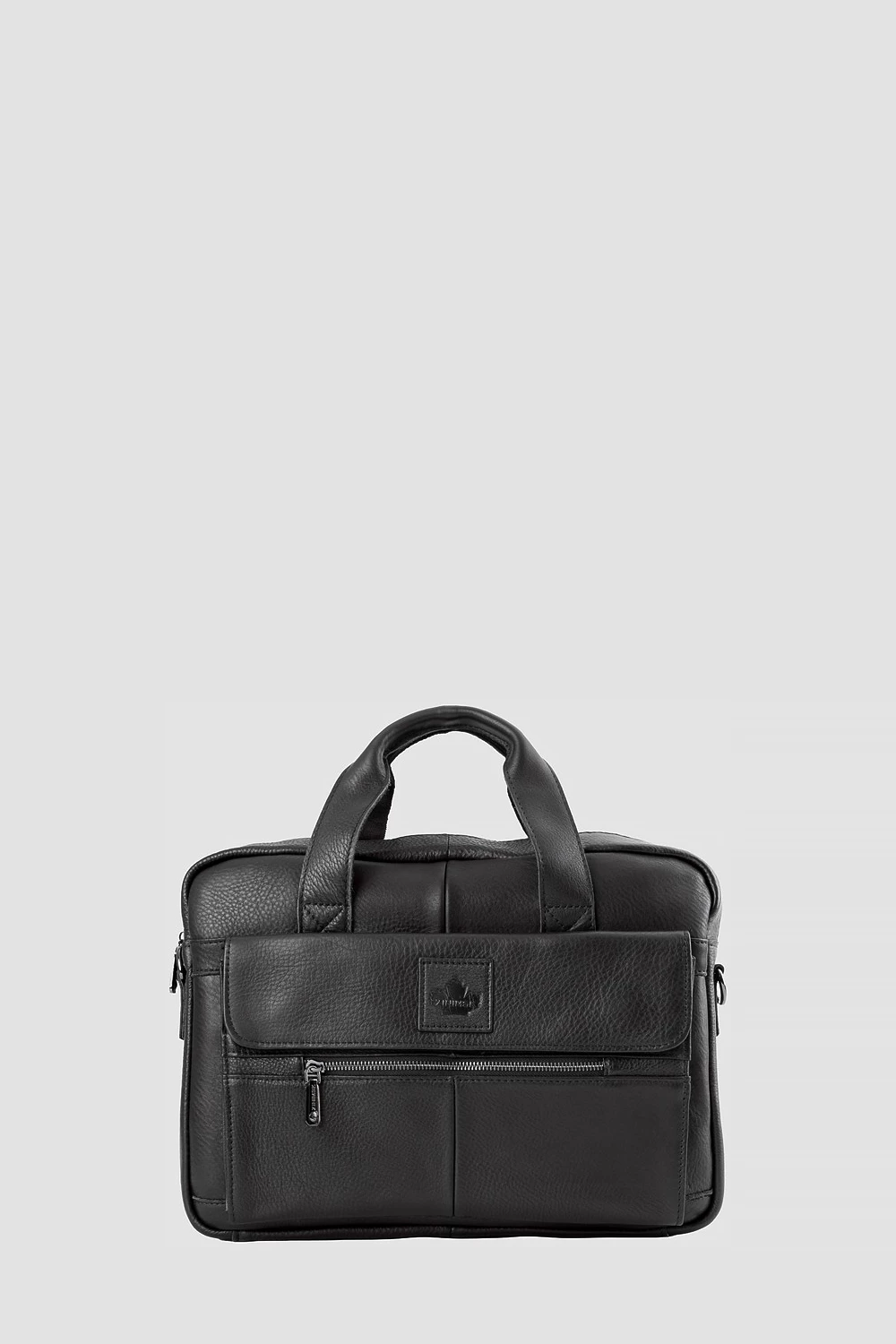 Мужская сумка-тоут из натуральной кожи чёрного цвета. Отделение на молнии с внутренним открытым карманом и дополнительным на молнии. Снаружи три кармана: два на молнии и один на магните. Комплектуется текстильным ремнём.● внешние карманы на замке для мелочей