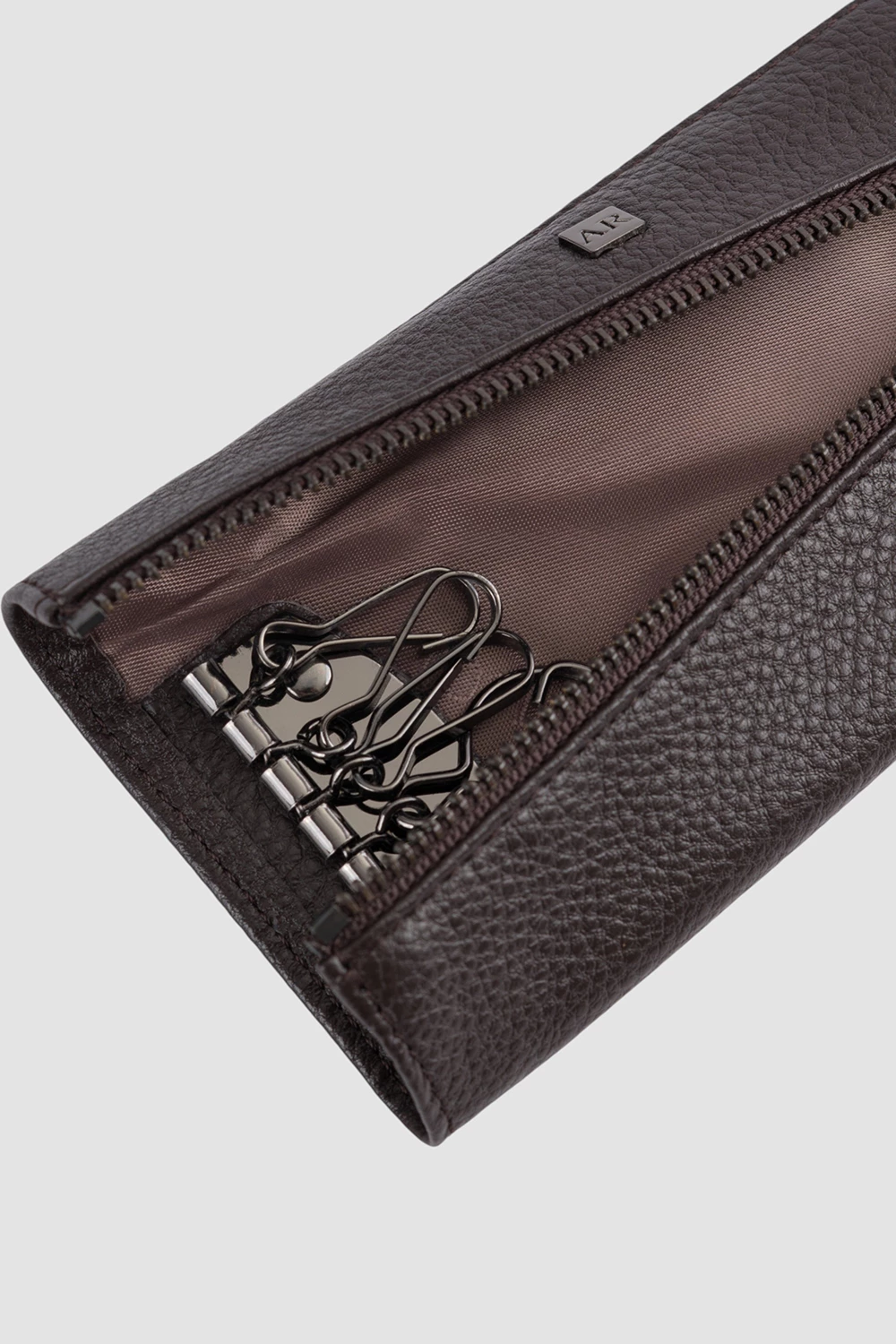 Ключница из натуральной кожи коричневого цвета. Оснащена шестью карабинами для ключей и дополнительным кармашком на молнии.