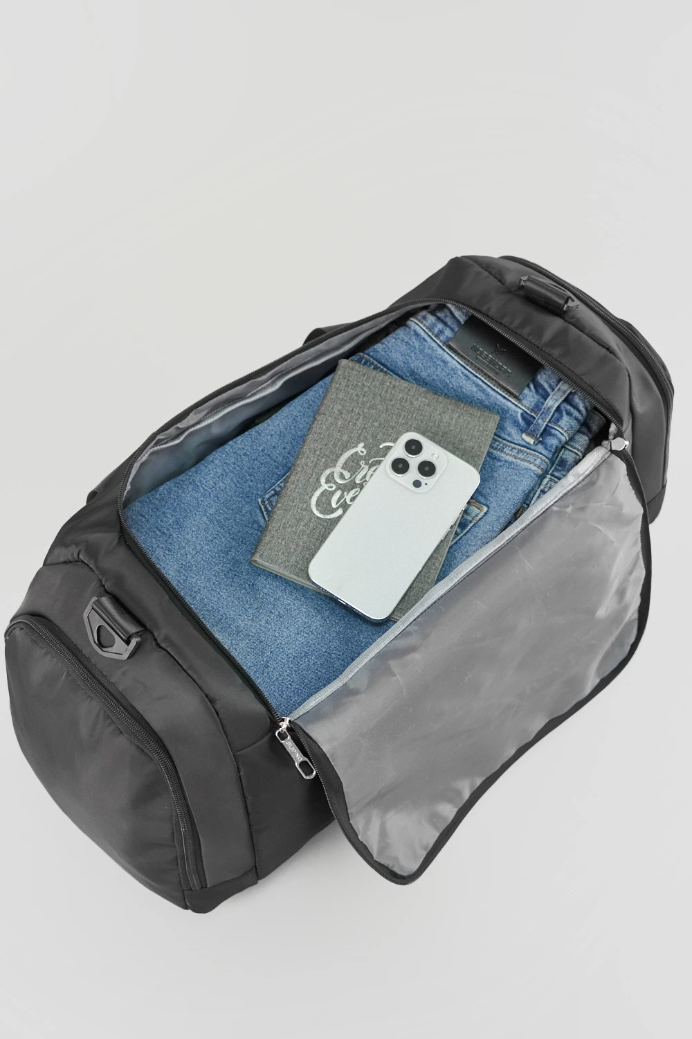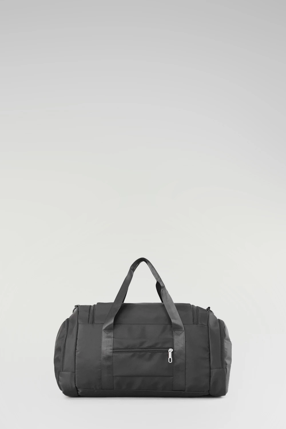Черная дорожная сумка с одним отделением и внутренним карманом на молнии. Снаружи расположены два функциональных застегивающихся кармана. Отдельное пространство предусмотрено для обуви. В комплекте идет текстильный ремень. Отличный выбор для поездок и путешествий.Размер